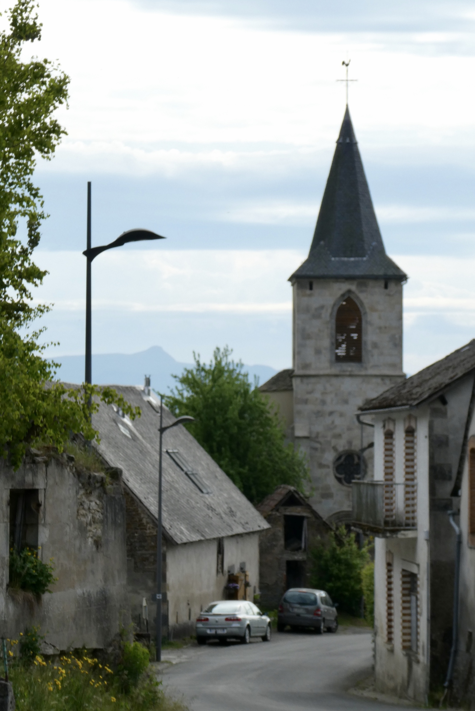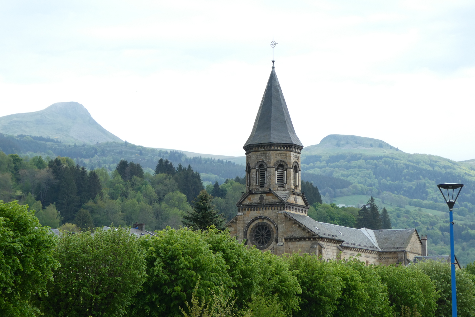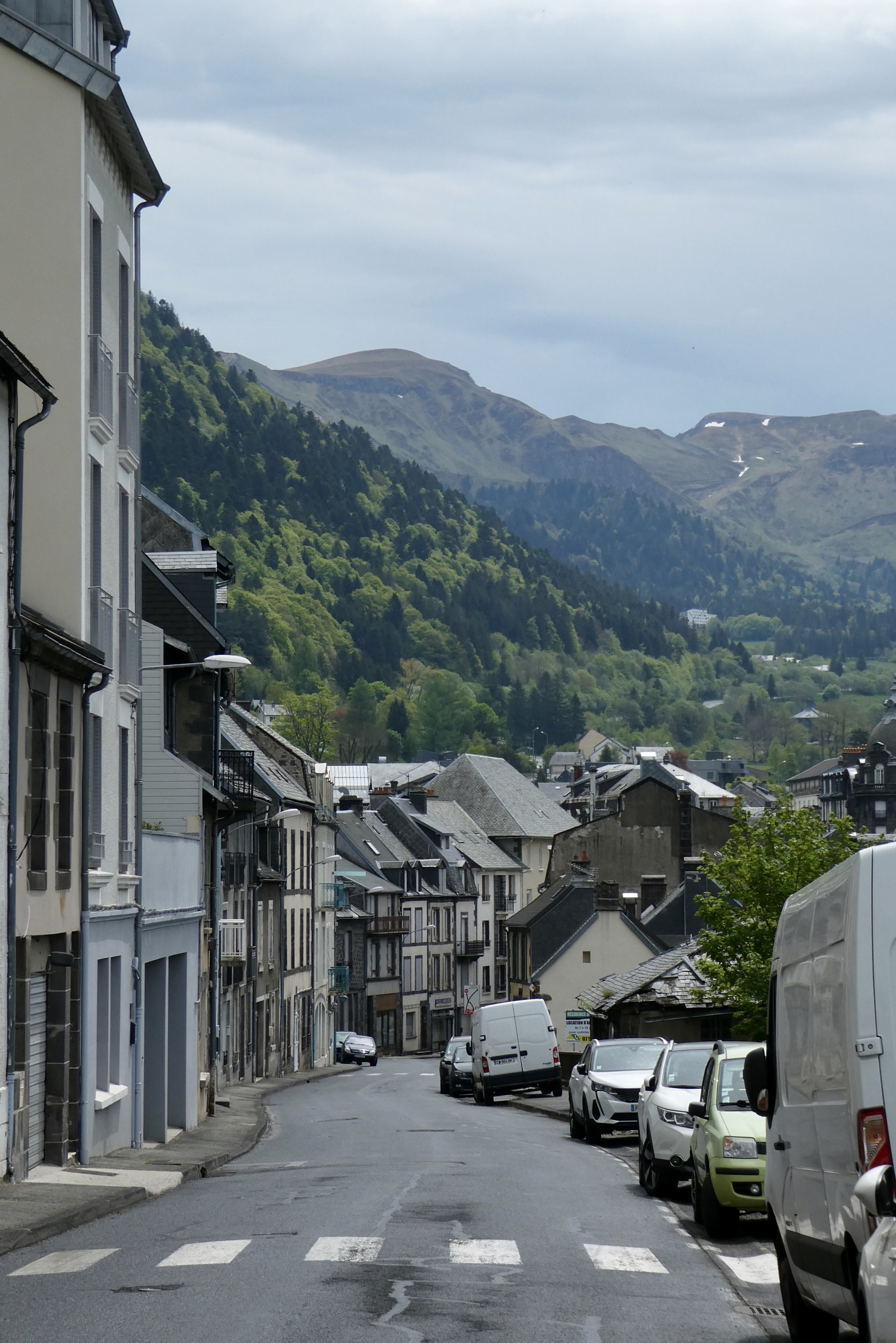 I continued past along the Dordogne as I made my way up to Mont-Dore, near the river’s source in the Massif Central. Mont-Dore is a ski and spa town located just north of Puy de Sancy. As with La Bourboule, the surrounding terrain/landscape dictate the layout of the town – in this case a series of switchbacks in the roads leading into/out of town result in narrow streets no wider than a single building. Within a half hour, the rains had stopped and I continued on, climbing out of town on a narrow street lined with parked cars. The climb was rewarded with an amazing view looking back at the small town nestled below the Puy de Sancy and the peaks of the Massif Central.