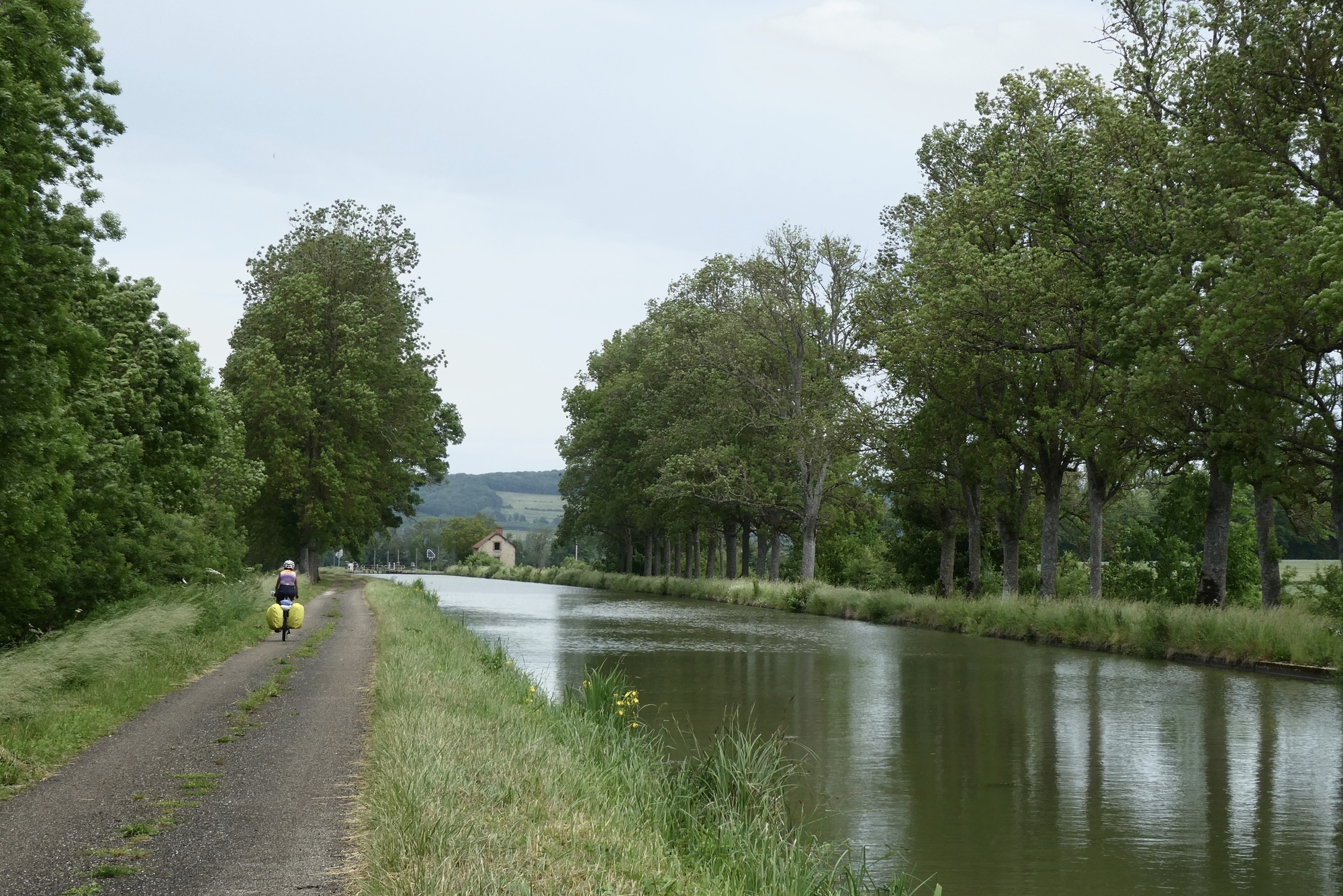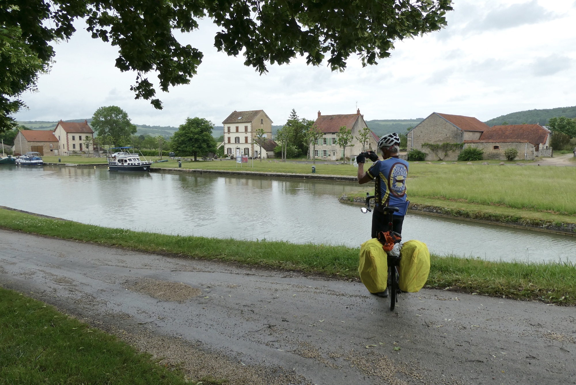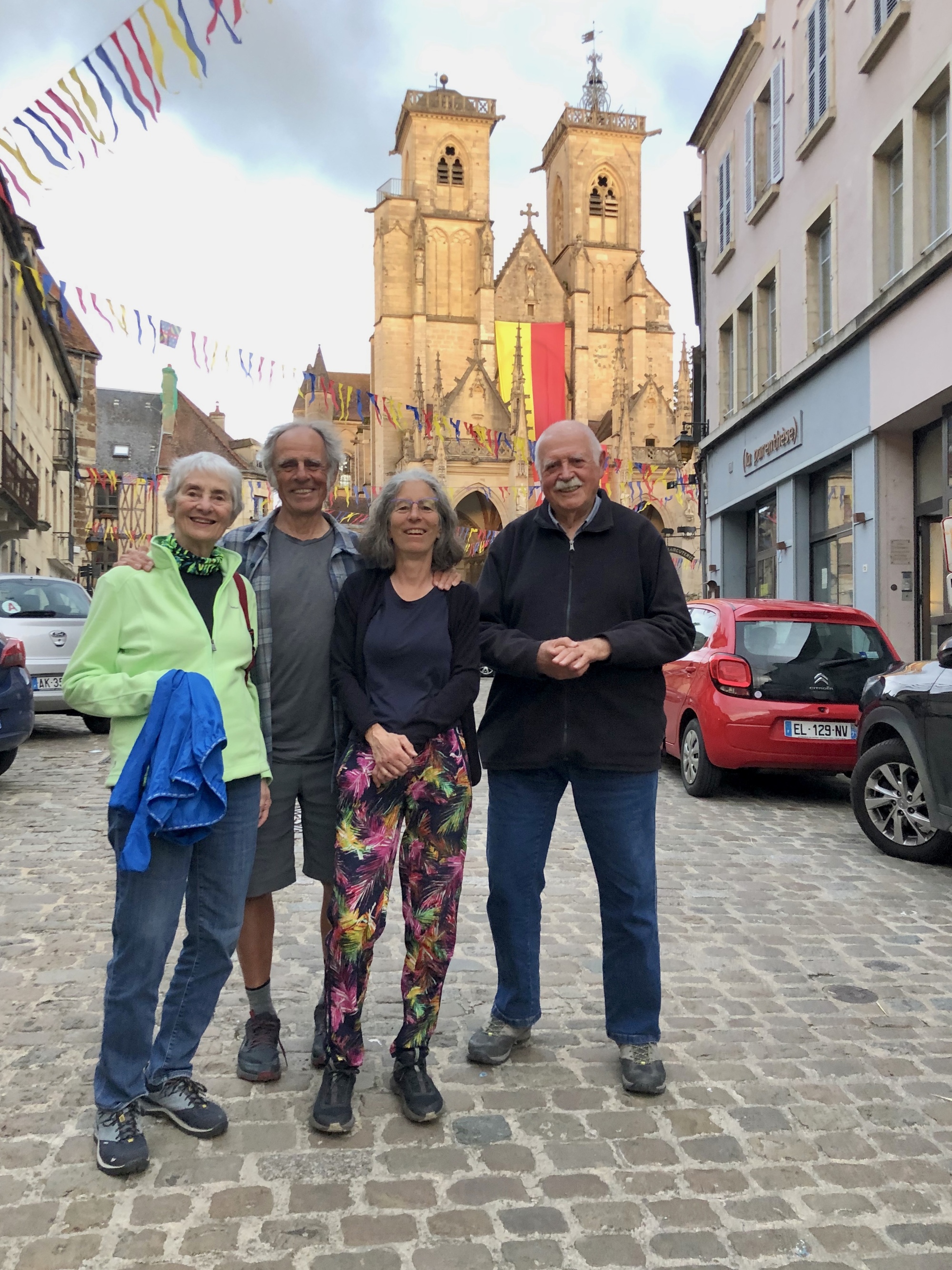 The rain drops appeared on the water before they hit me, a light sprinkling at first, but soon there was enough to stop and stow the cameras, but not enough for Scott to put on his rain jacket. It wasn't long before we were off the canal and onto D970, one of those larger departmental roads that can have quite a bit of traffic. But not today. Few cars, rolling terrain and a nice little tailwind made for a fun ride into Semur-en Auxois. We arrived about the same time as Suzanne and Janos, who had taken a different, longer route through the hills east of the canal. They got a little wet, but Rachael had succeeded in staying dry. She was only about a mile and a half ahead of Scott and me, and we too might have stayed dry if I hadn’t dawdled at the canal house. So, the rain was on me, figuratively as well as literally.