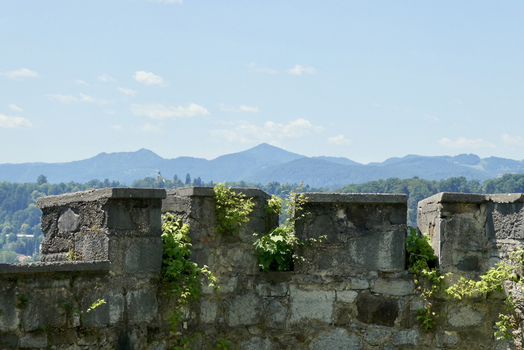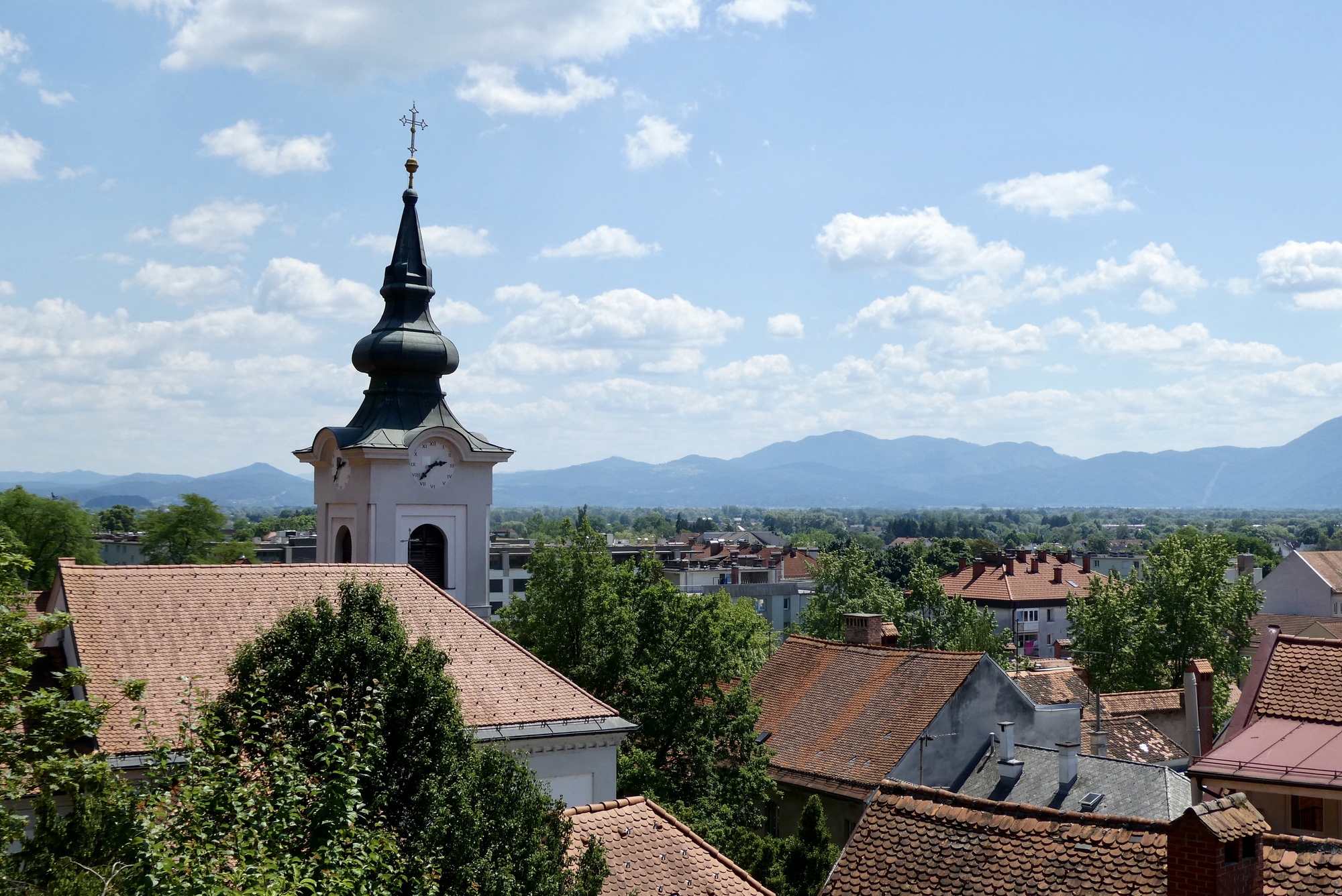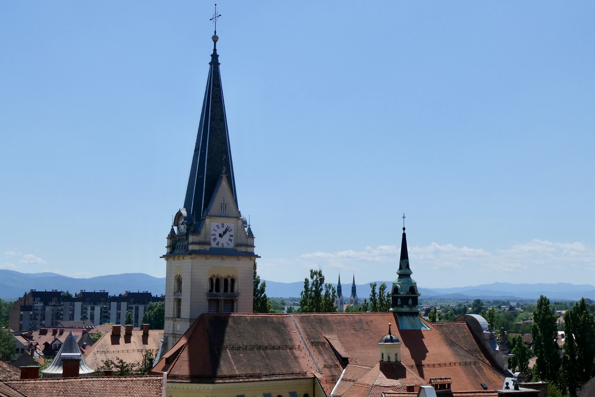 After dropping Vivien George at the hotel, I headed over to the pedestrian area along the Ljubljanica River, stopping for a light lunch at one of the many riverside eateries. Then it was a hike up to the Ljubljana Castle, where my senior-discounted ticket gave me access to tower and the Puppet Museum. The afternoon was decidedly warm, so after my castle visit I indulged in a double-scoop gelato and then decamped to the hotel for sorting gear and packing the panniers. I returned to the river for dinner at a good Indian restaurant, stopping briefly at an outdoor concert in Kongresni Trg, Congress Square.