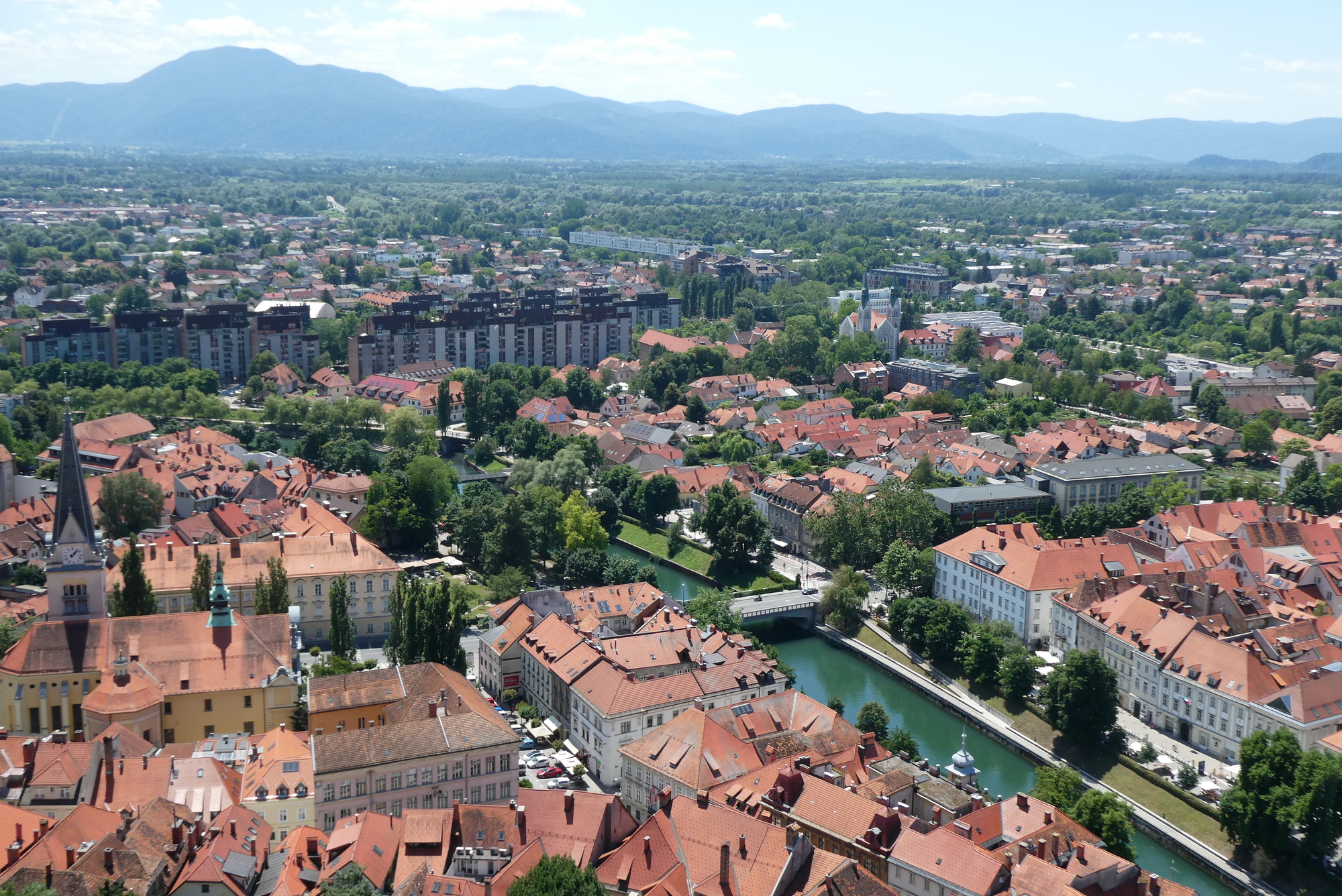 The flight to Ljubljana was full – and it seemed almost all were Americans. I was assigned a window seat (not my preference) and although flying still makes me a bit nervous, I spent most of the two hour flight looking out the window at snow-covered Alps and long green valleys. As we circled down toward Ljubljana, I couldn’t help but note that the city lies in a basin ringed with hills and/or mountains. I gulped a bit and focused instead on the Solvenian farmland, beautifully arrayed in rectangles of yellow and green.