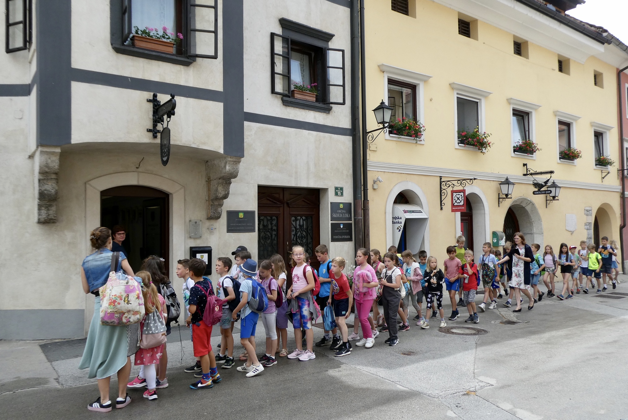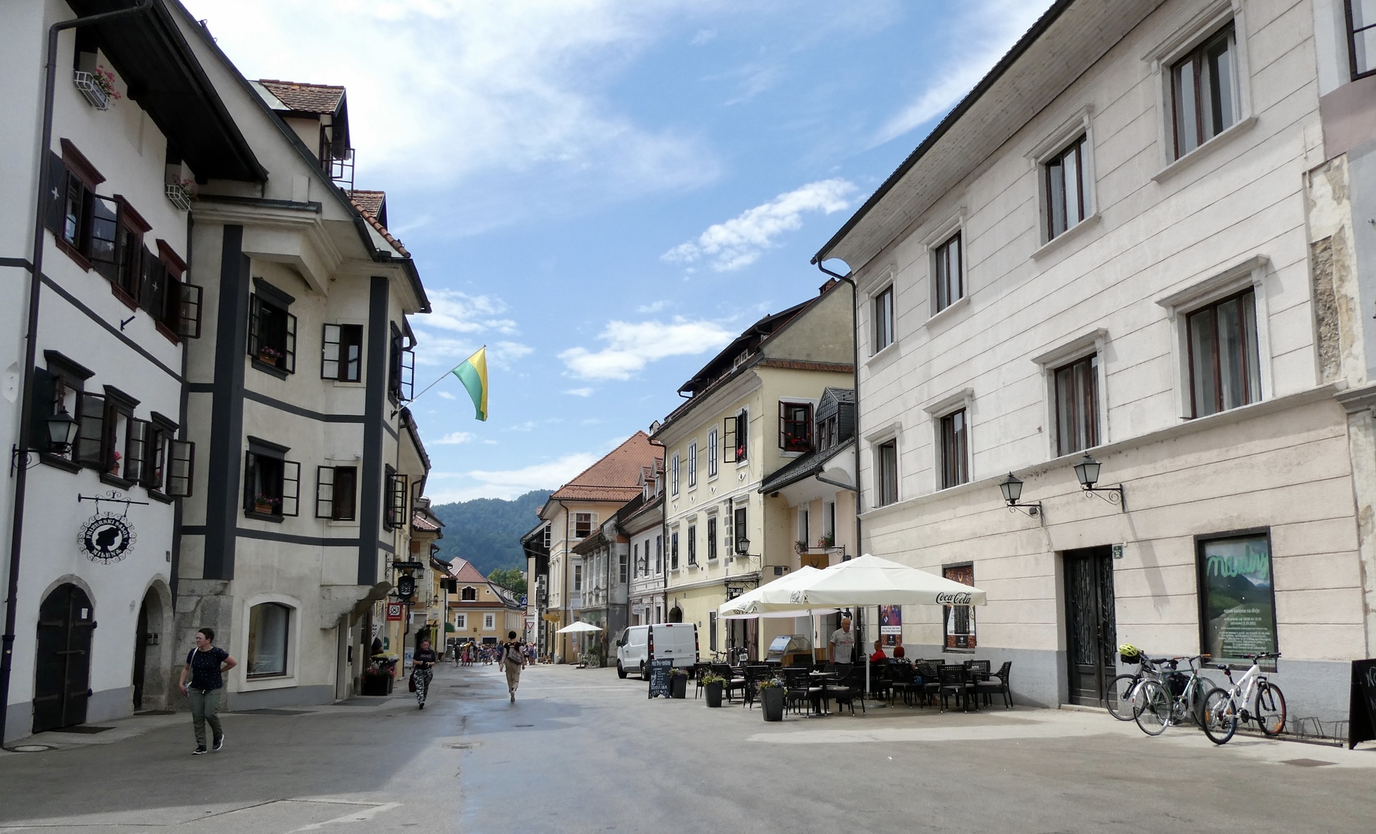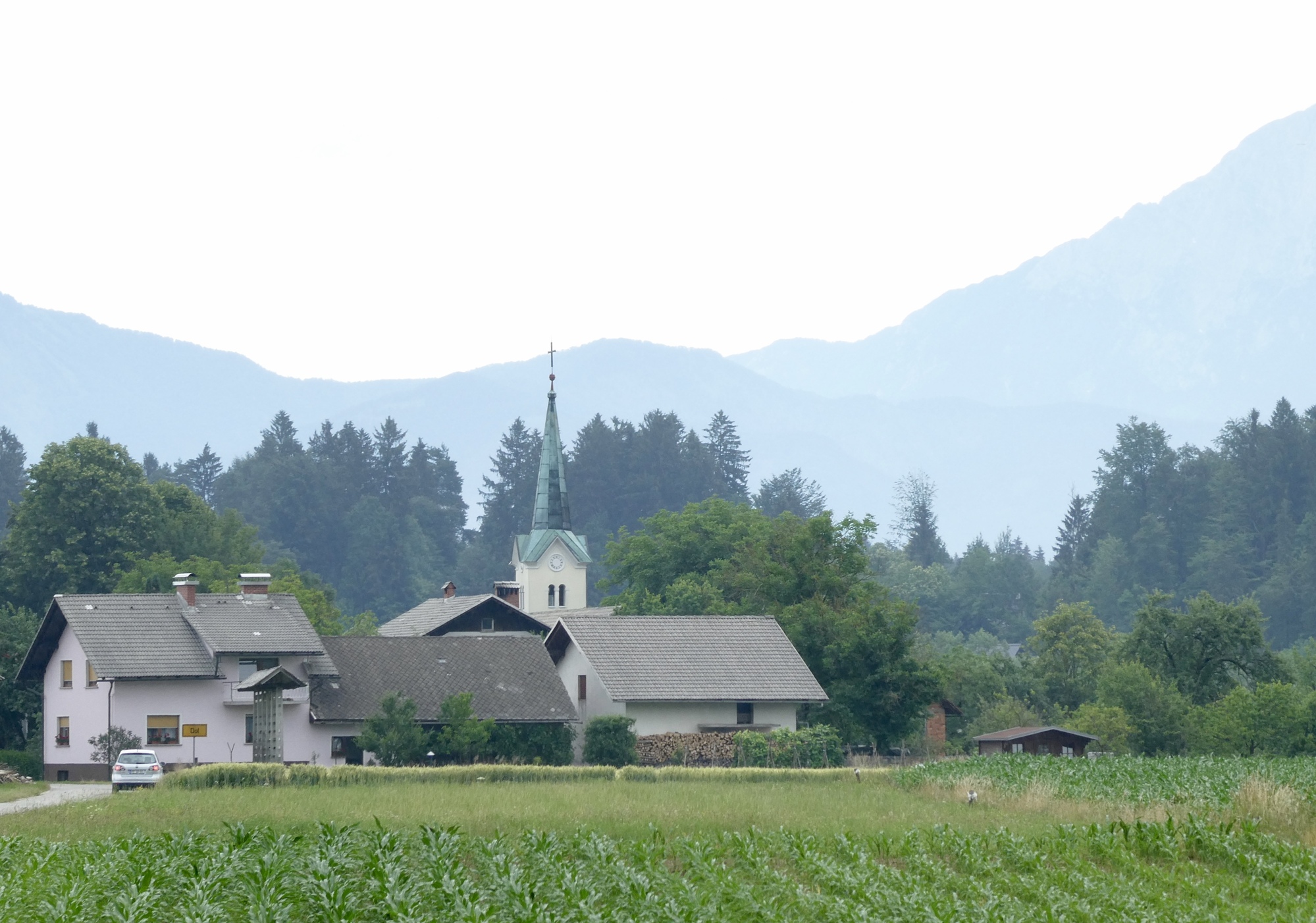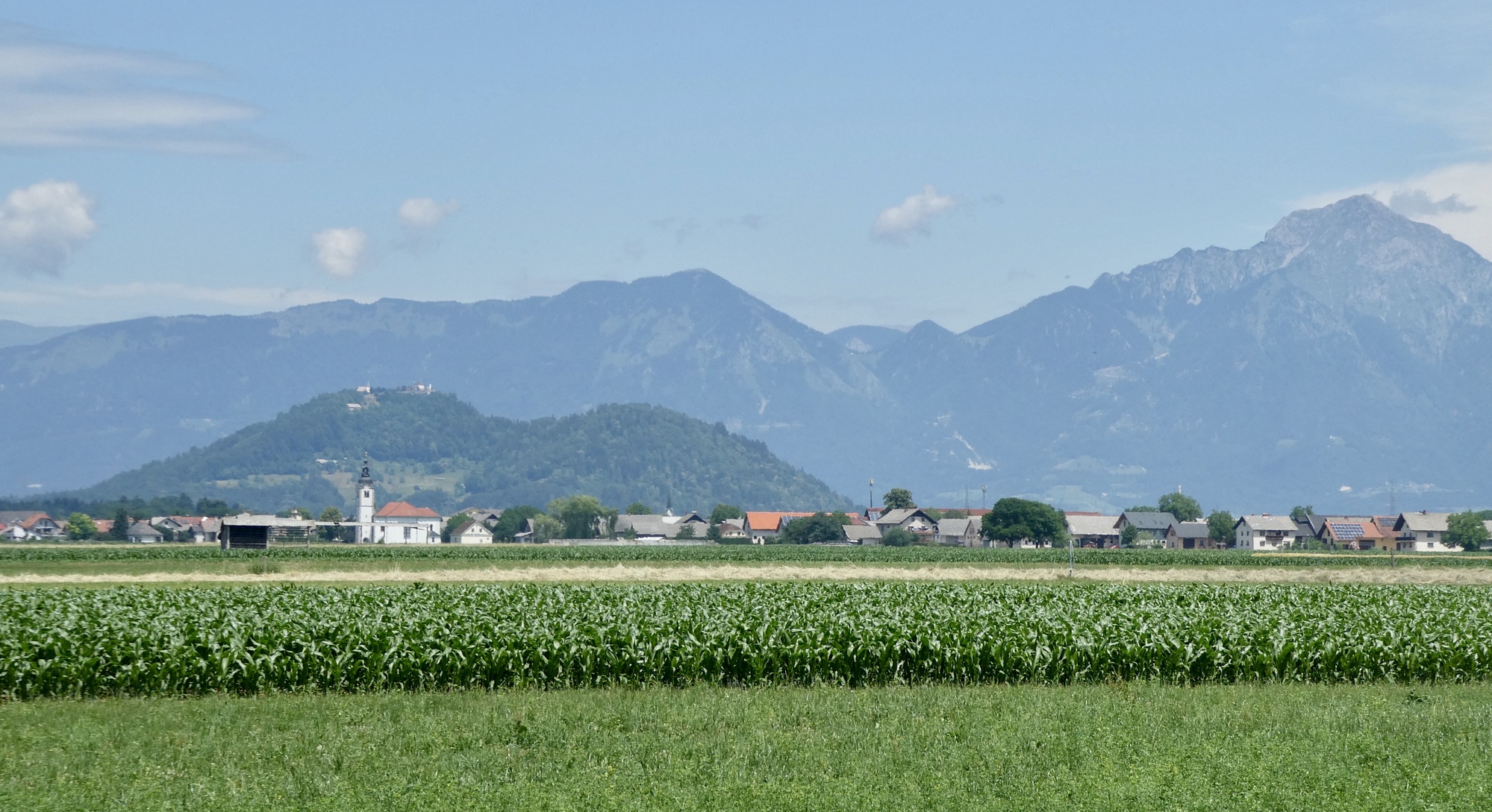 About ten miles into the ride, including the detour, I cleared the sprawl of Ljubljana and was I in the rural outskirts, passing through small farmsteads and villages. The day was cloudy and the Julian peaks were barely visible in the distance. Rain showers were predicted for later this afternoon so I didn’t tarry too much. However, by the time I reached Škofja Loka, blue skies had begun to appear and the sun was trying to poke through. I stopped for coffee and a treat, enjoying the little sunshine and a parade of schoolchildren on a local field trip. After a two-week break, it was great to be back on the road.