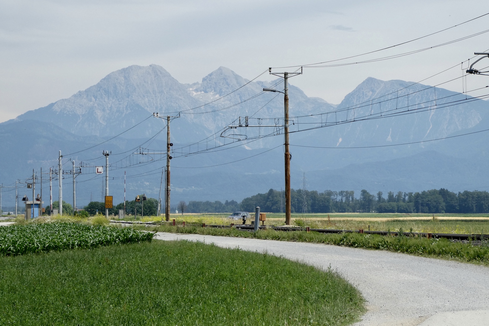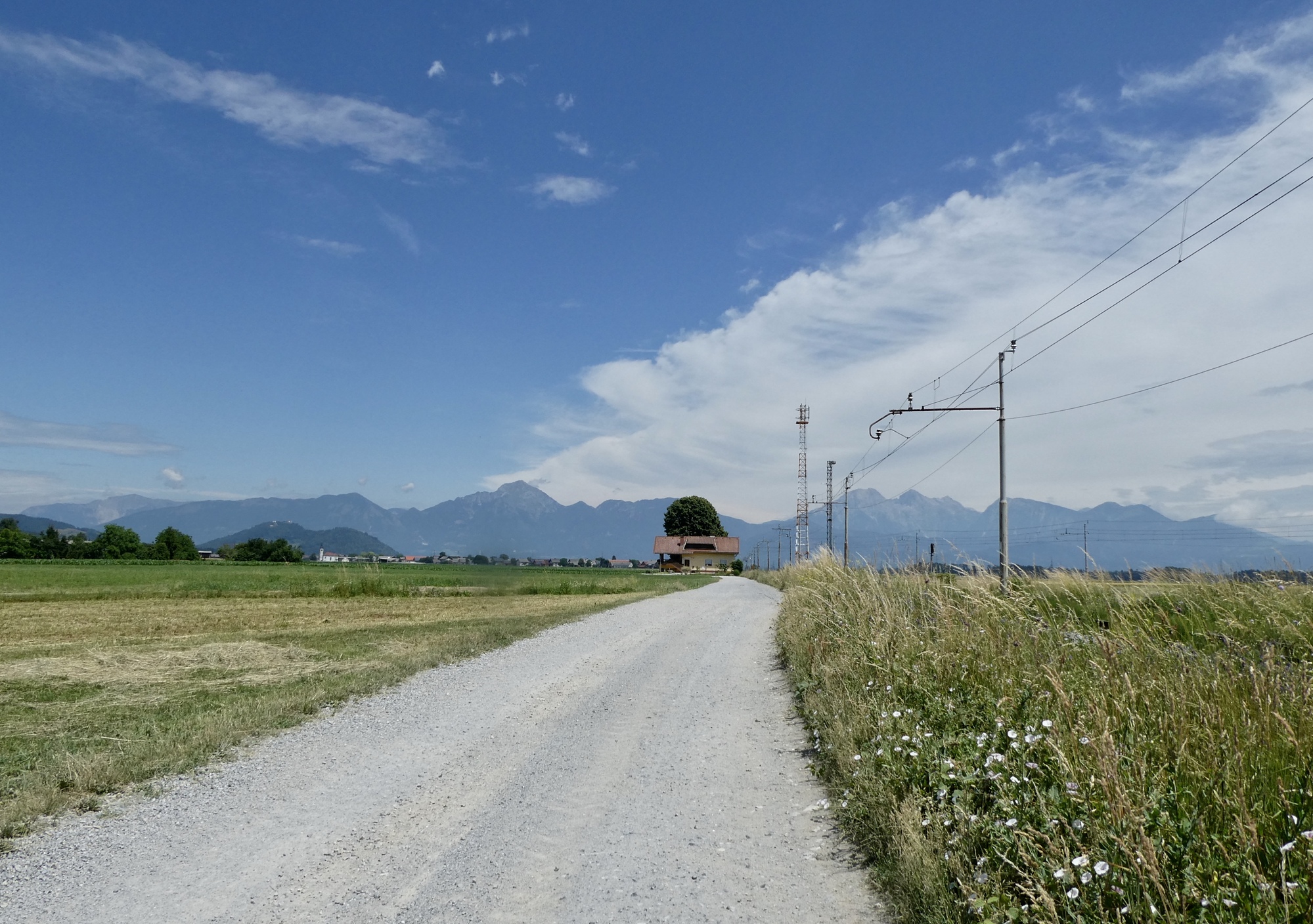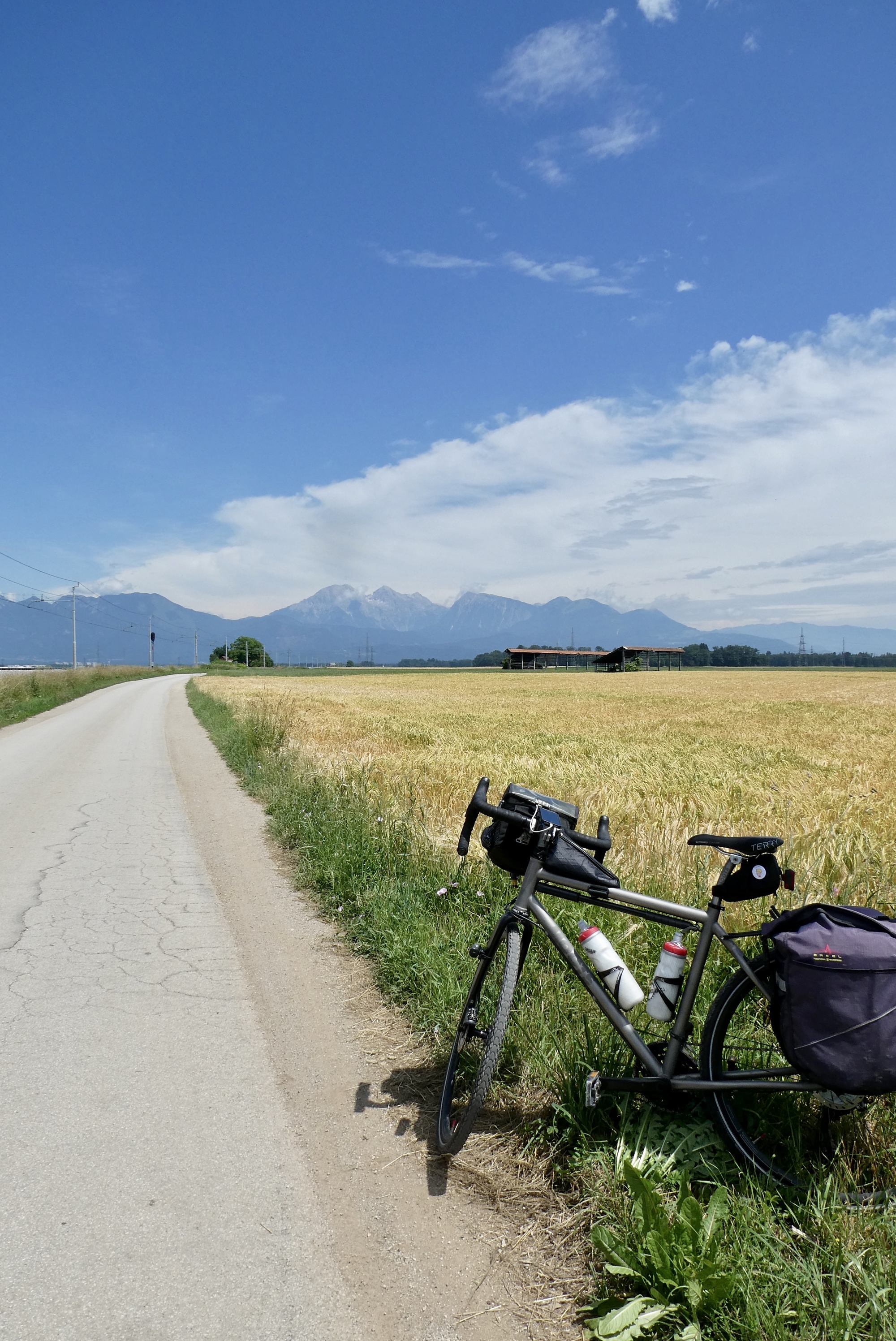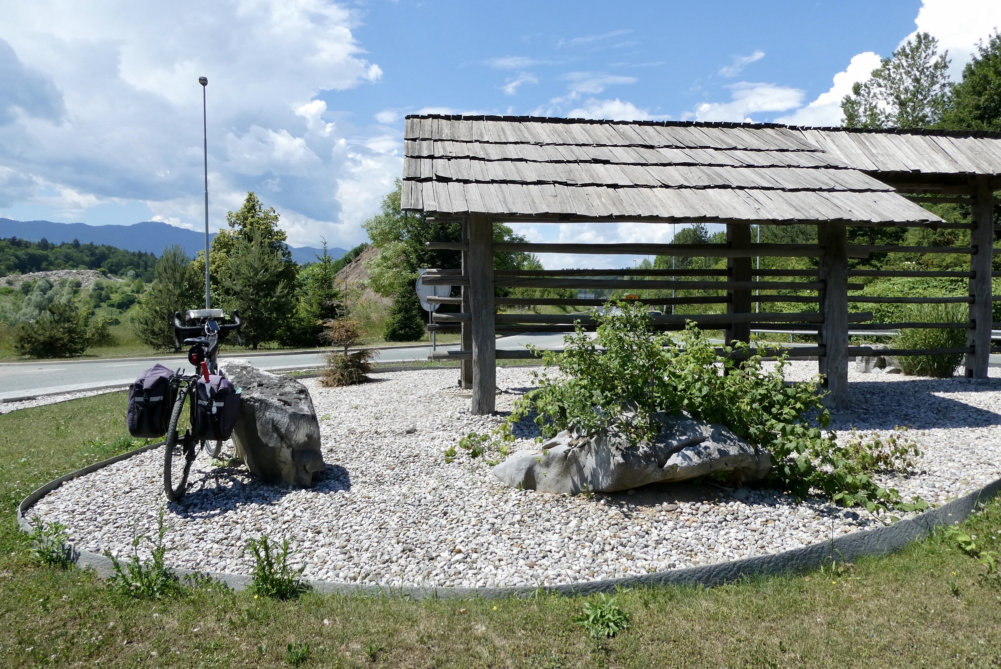 The next five miles were among the best of the day- on small roads through fields of golden wheat with the Julian peaks rising against a brilliant blue sky. But the magic ended much too soon and I found myself traveling the bike lanes of Kranj, the third largest city in Slovenia. I began looking for a shady place to stop for lunch, but there were few green spaces and very little shade. I finally spotted a shelter in the middle of a round-about on highway 412. It wasn’t ideal, but it worked fine in a pinch and I enjoyed a twenty minute break munching my breakfast sandwich while watching traffic circle the round-about through the shelter's slatted walls.