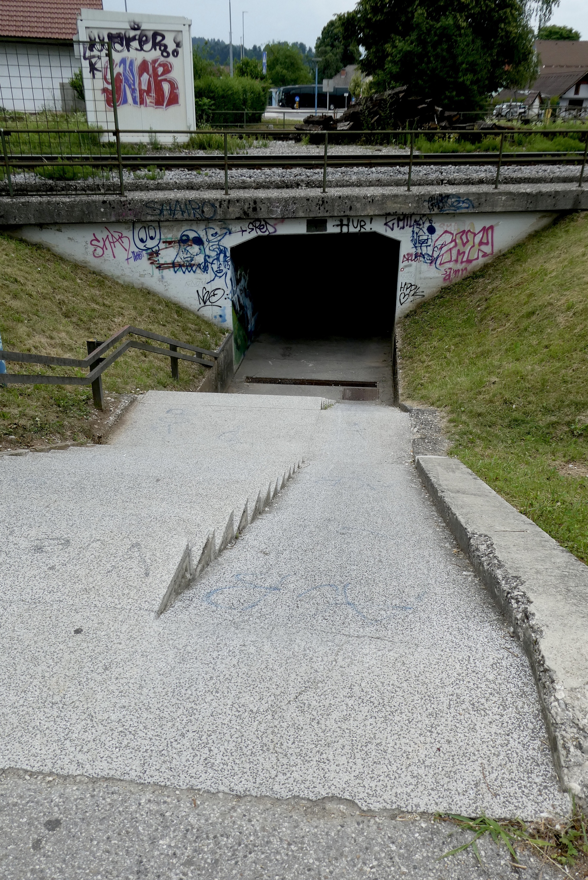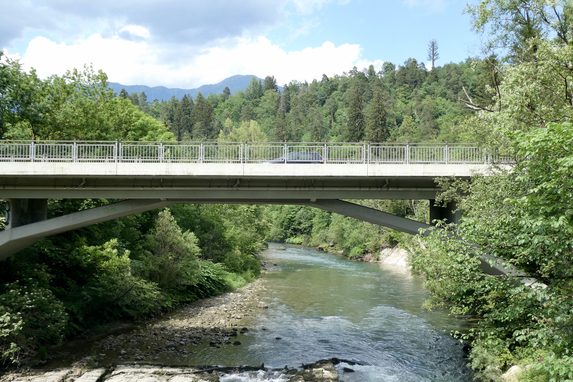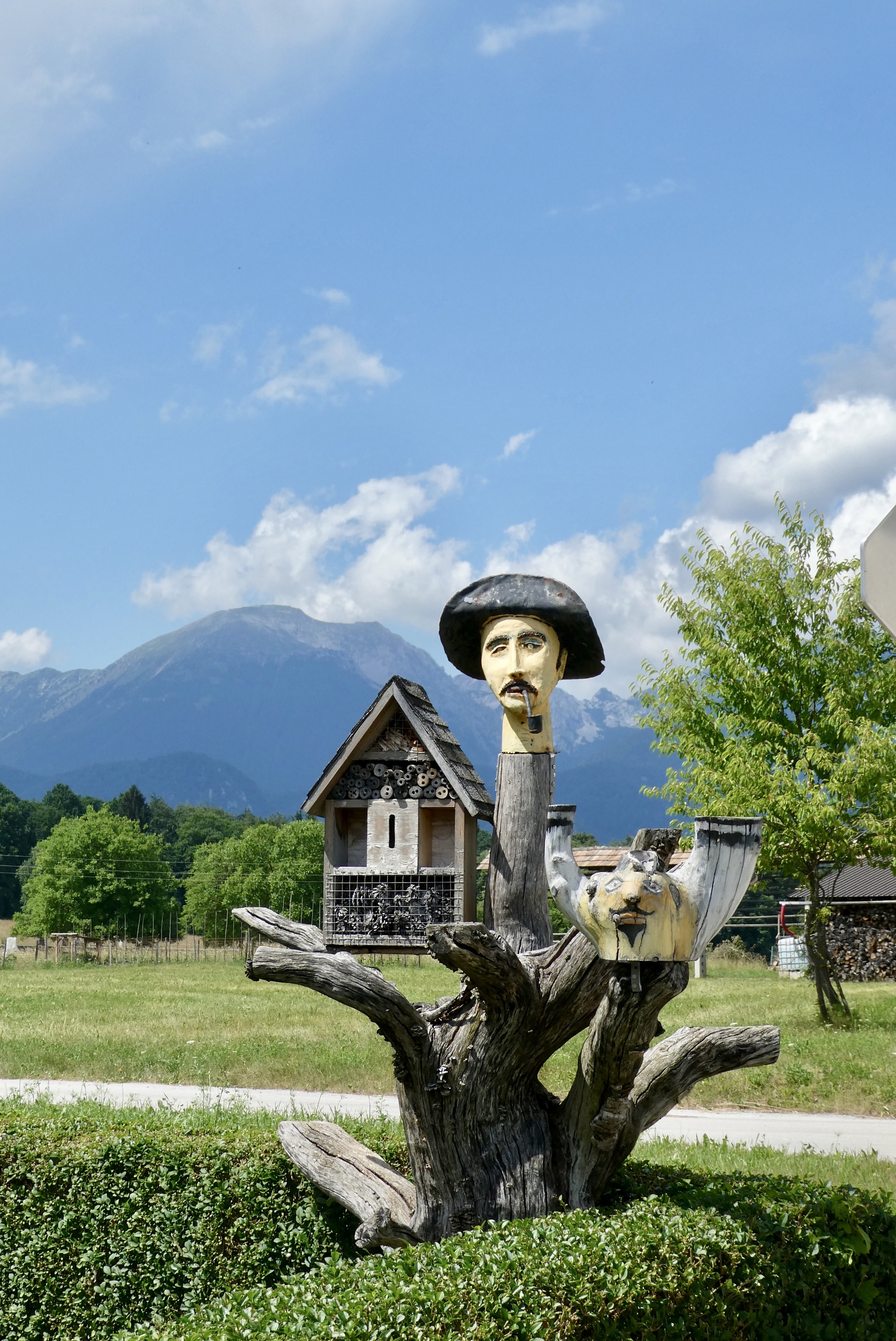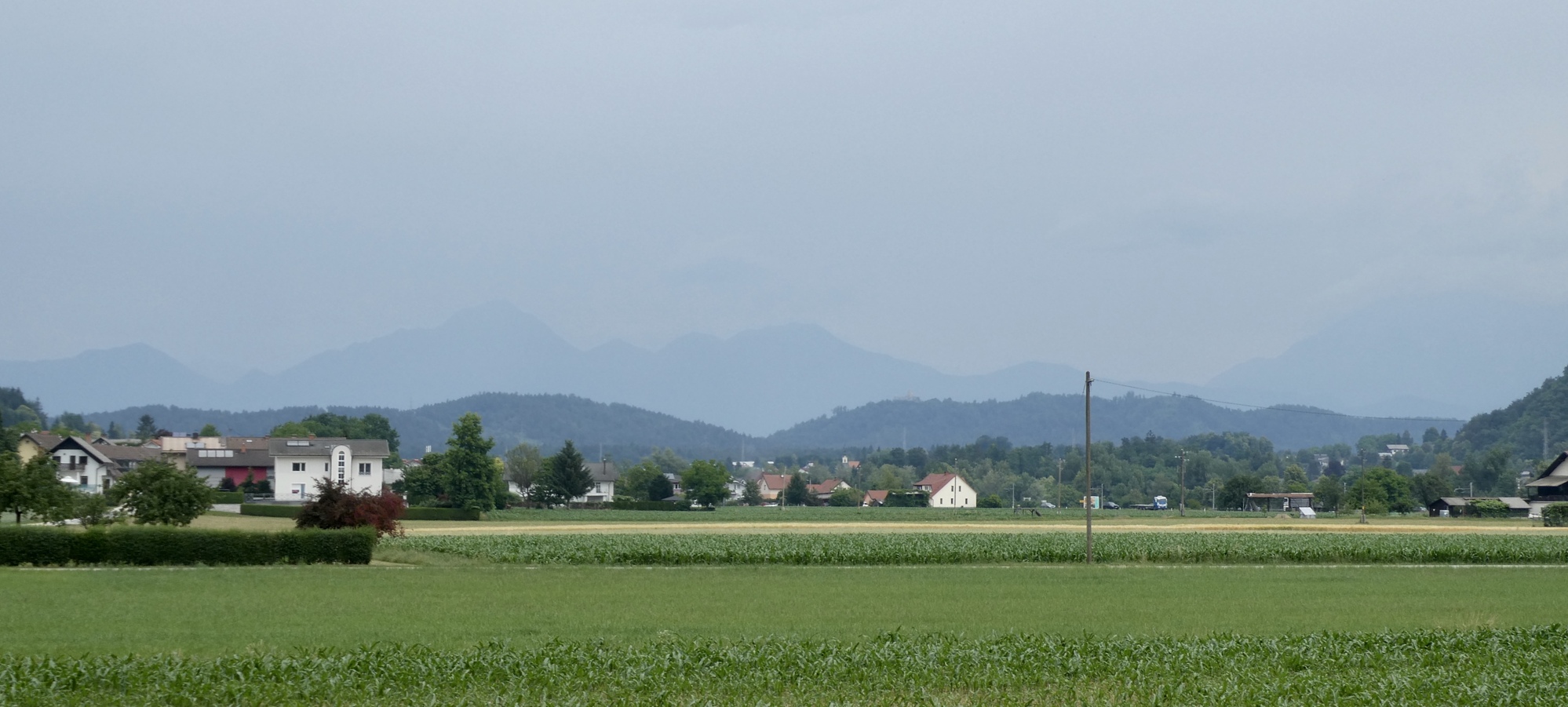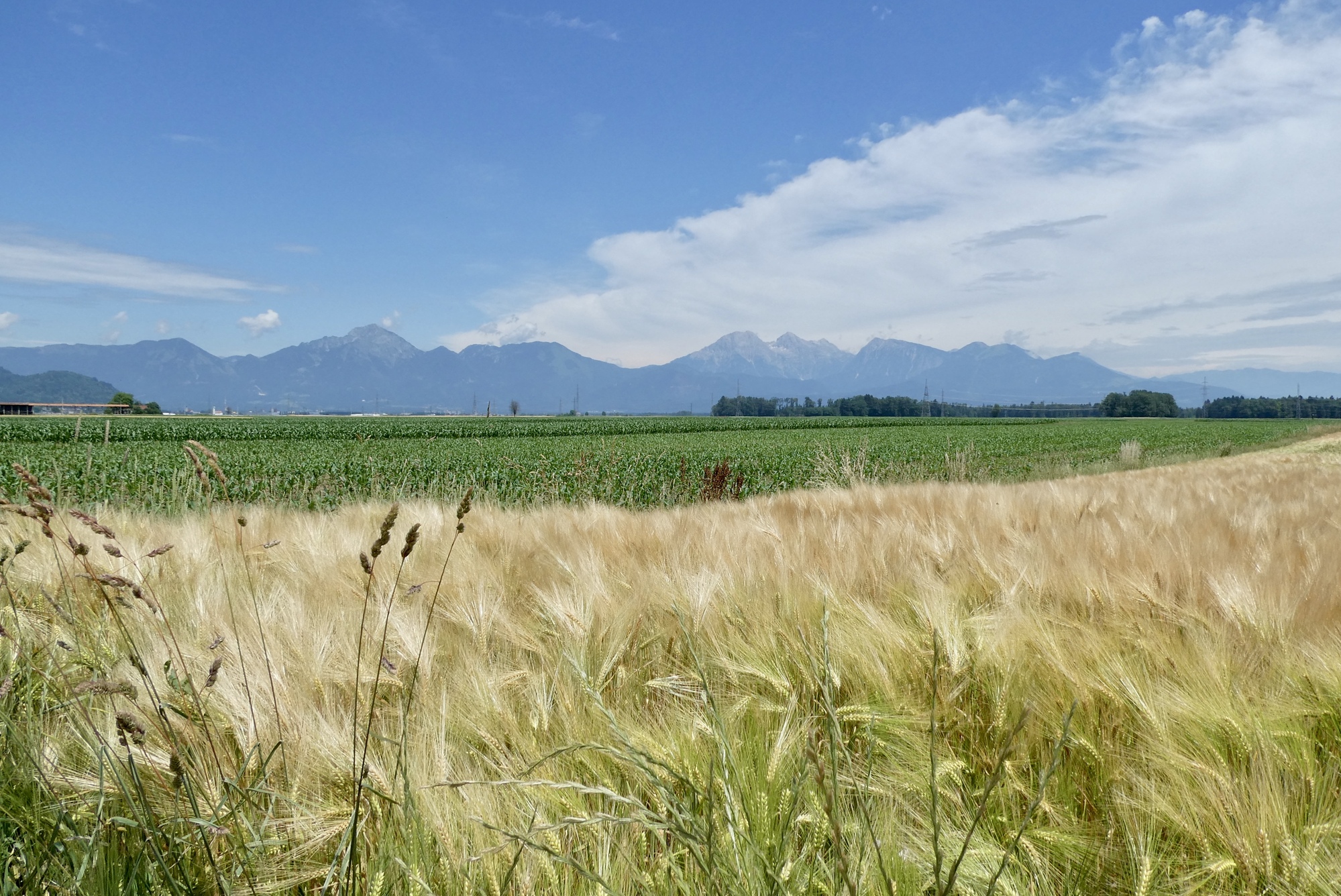 The next five miles were among the best of the day- on small roads through fields of golden wheat with the Julian peaks rising against a brilliant blue sky. But the magic ended much too soon and I found myself traveling the bike lanes of Kranj, the third largest city in Slovenia. I began looking for a shady place to stop for lunch, but there were few green spaces and very little shade. I finally spotted a shelter in the middle of a round-about on highway 412. It wasn’t ideal, but it worked fine in a pinch and I enjoyed a twenty minute break munching my breakfast sandwich while watching traffic circle the round-about through the shelter's slatted walls.