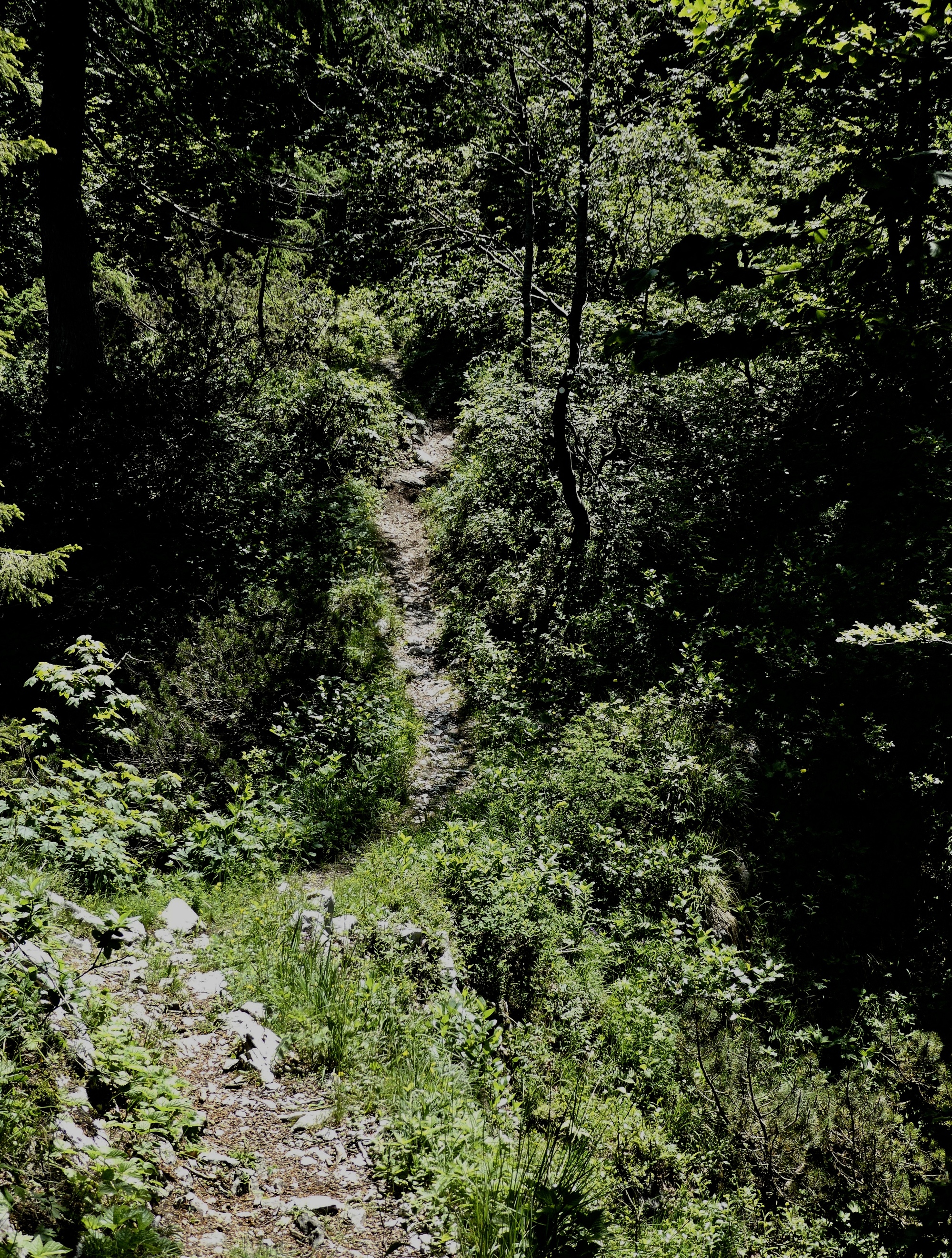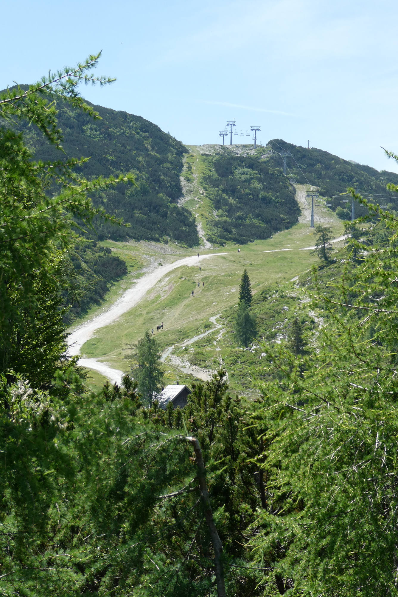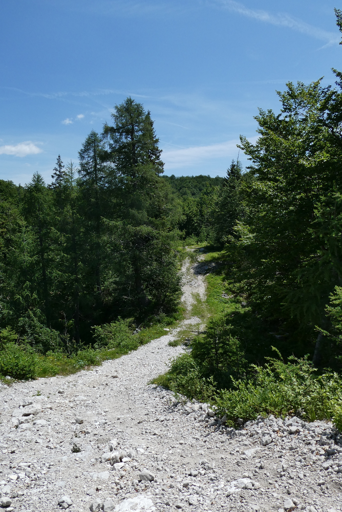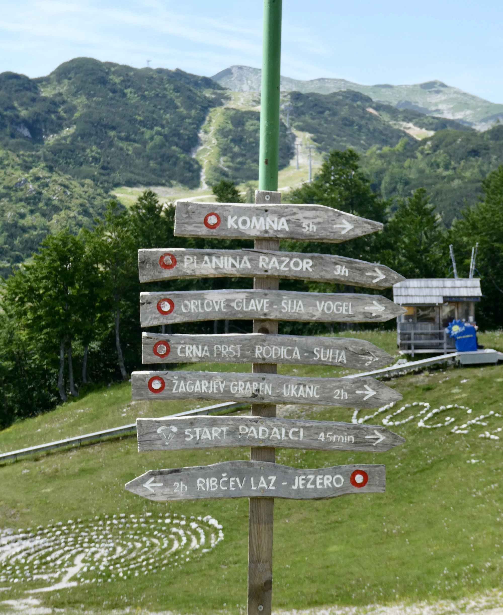I fortified myself with a bowl of soup at the Vogel ski chalet and considered the various hiking routes. I could go up along one of the ski runs, but I was more interested to discover there was a trail back to Ribčev Laz. The lake path I'd taken to Vogel was mostly along the highway rather than the lake, and I thought a hike down from Vogel would be more interesting. I put the route in RWGPS and started down the trail, initially a gravel road that narrowed as it headed downhill. I took care not to slip on the chunky rocks, and managed to take in some additional views of the surrounding peaks. However, I soon came to a painted red arrow directing me to a very narrow, little-used trail that ran through the woods, appearing to drop a bit precipitously off the right side. I paused and considered the fact that I was alone, without hiking poles, and about to take a little-used trail down a mountain side. Not a smart choice - I turned back to brave the gondola ride down.
