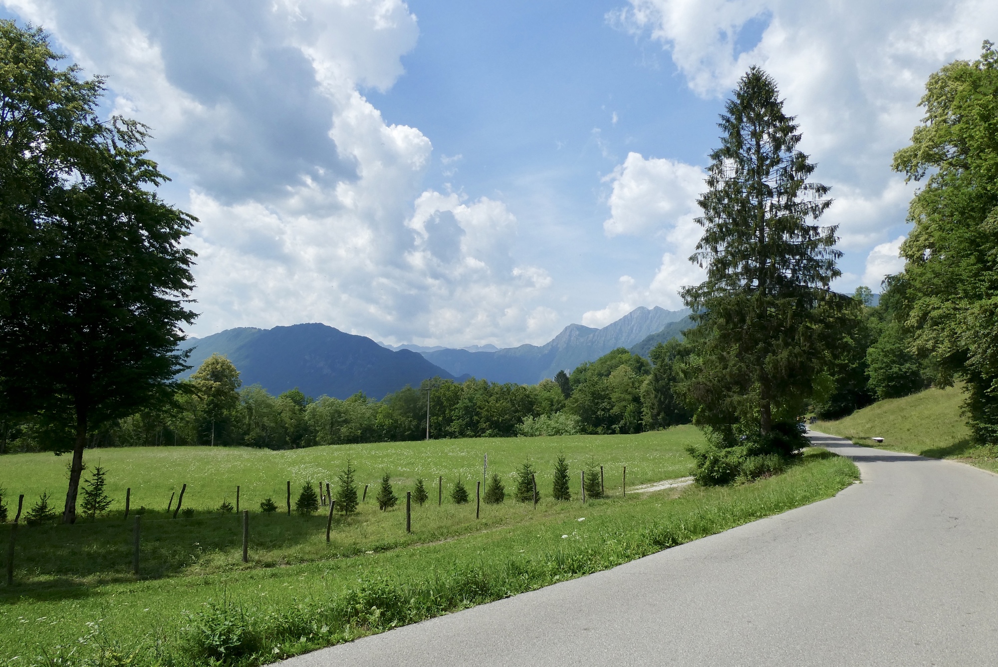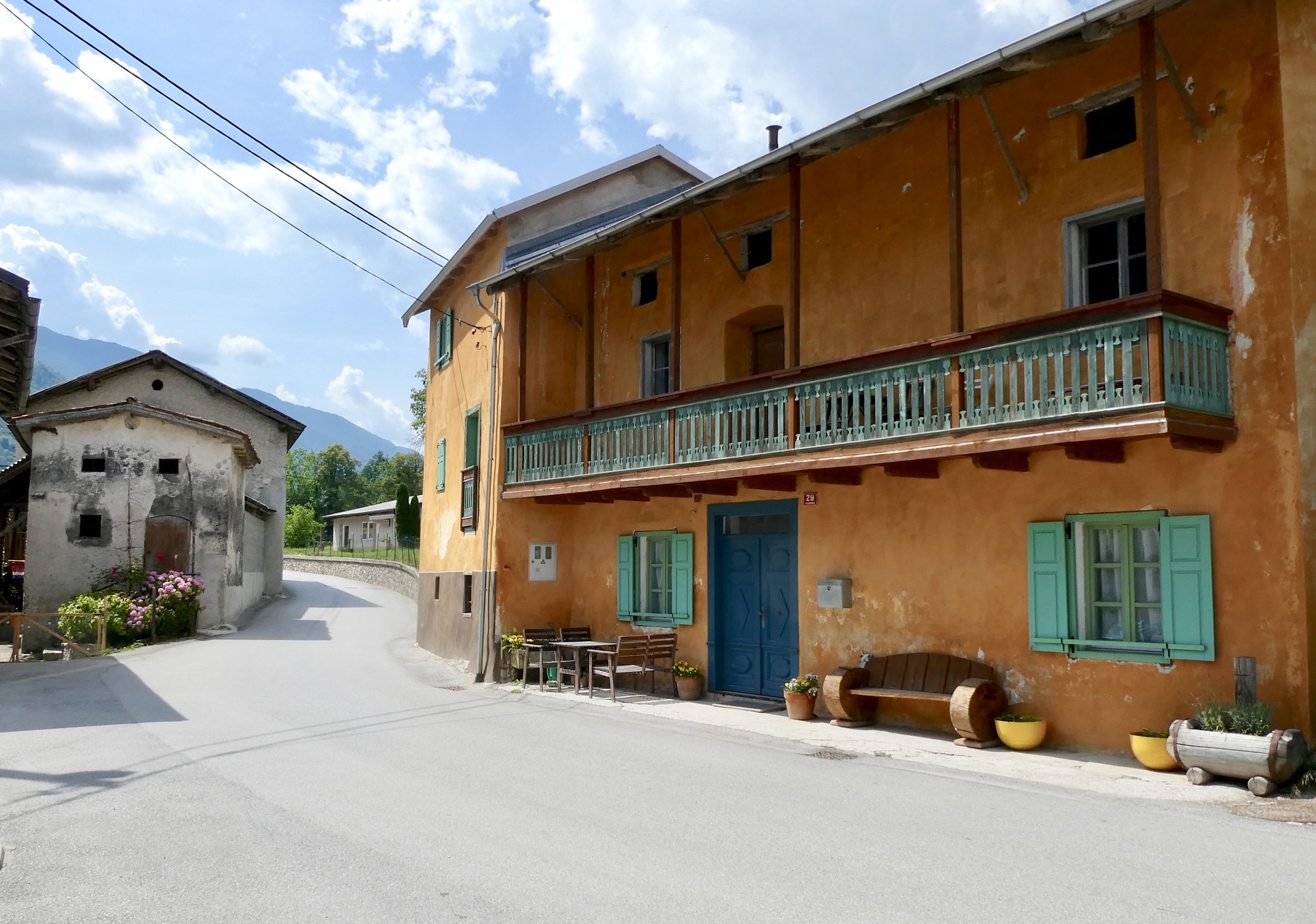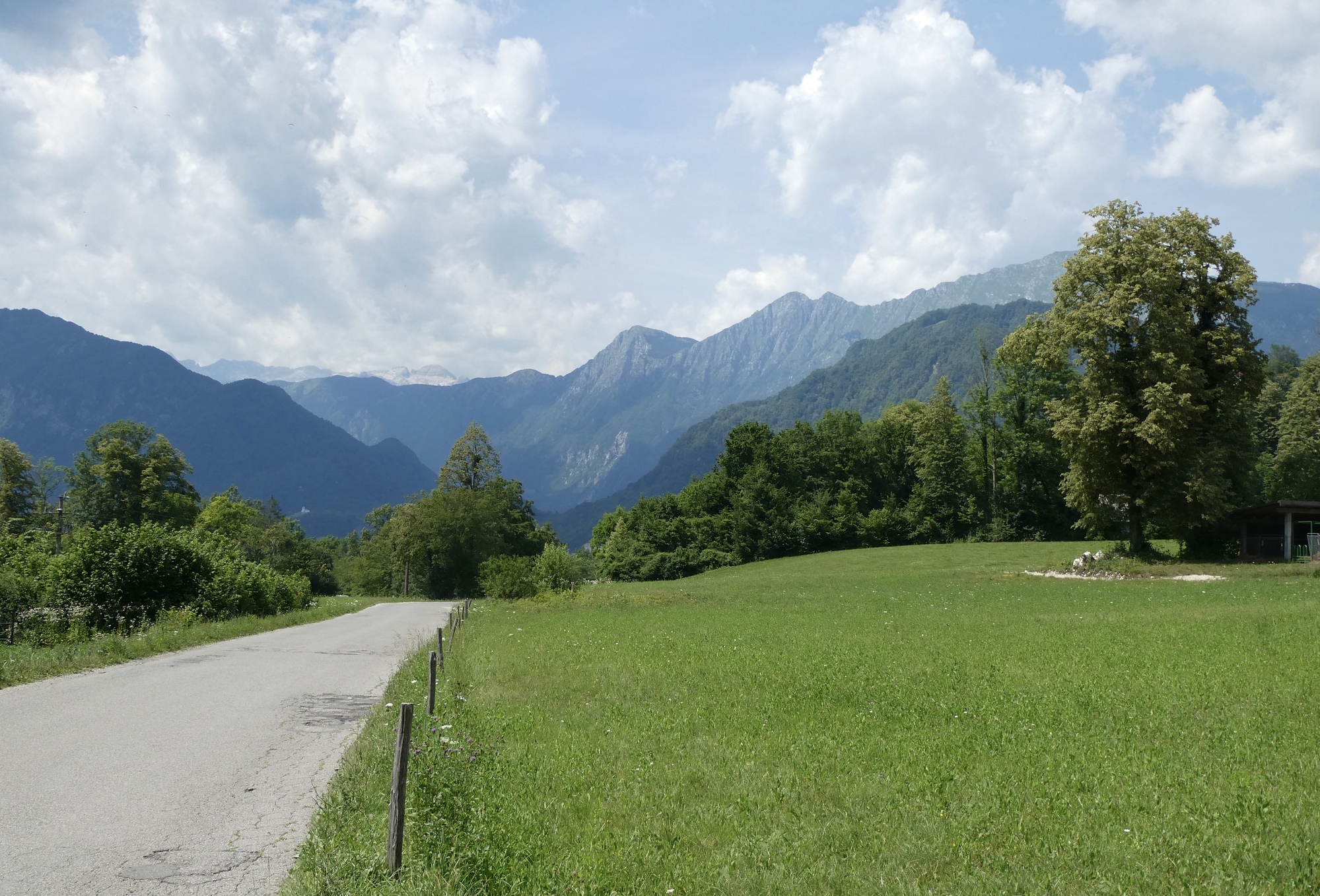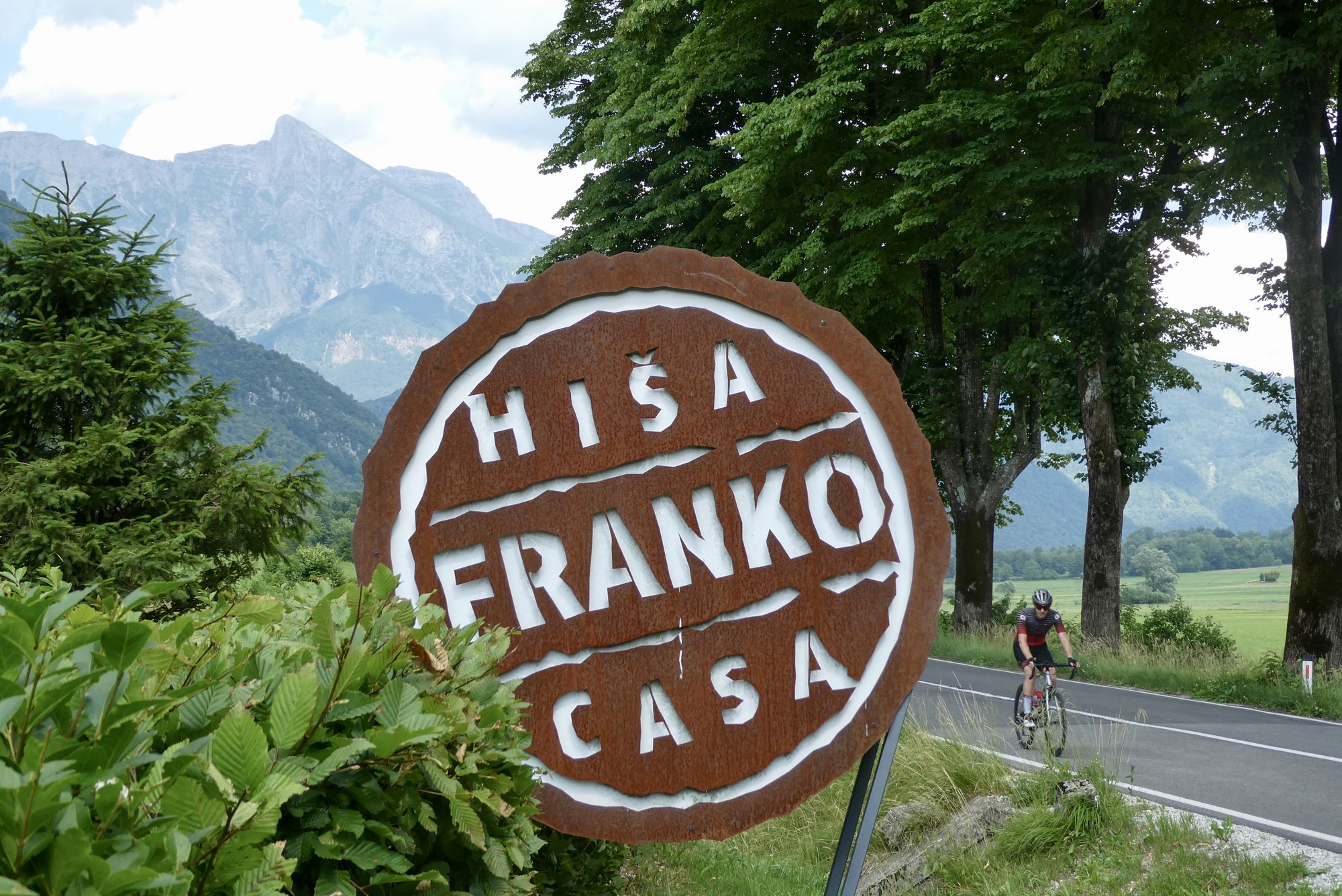 I bid farewell to Dominick and Heike and followed a dirt track to Most na Soči and then headed up the Soča River toward Kobarid. The route initially followed highway 102, but I noted that work is underway to install/improve a dedicated bike lane along the river. RWGPS directed me into one construction zone, but after several minutes trying to communicate with the friendly workers as to how I might connect with my route, I gave up and followed the highway into Tomlin. From there-on, I was on local roads winding through small towns as I made my up the valley. It was pleasant riding, with limited traffic and the Julian peaks looming in the distance.