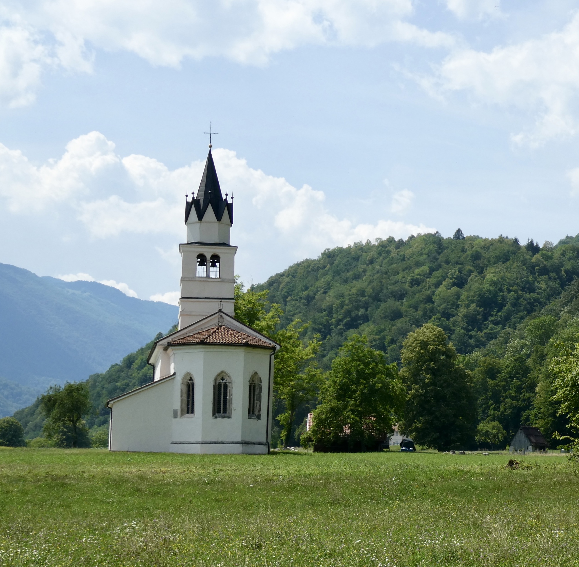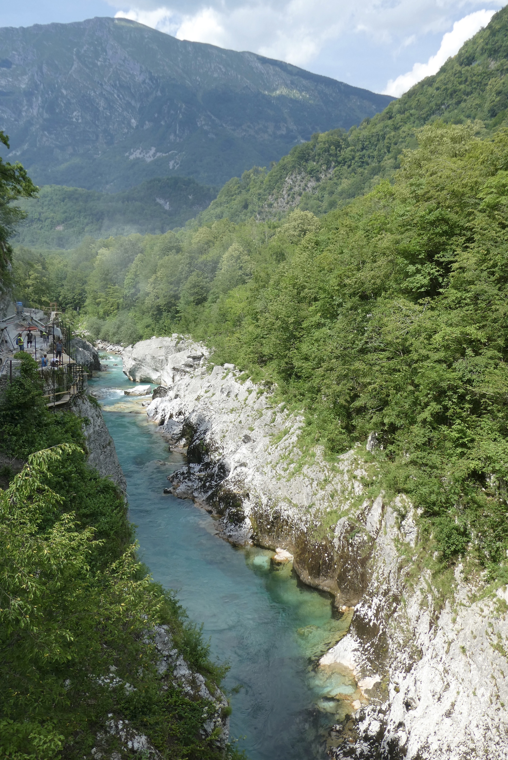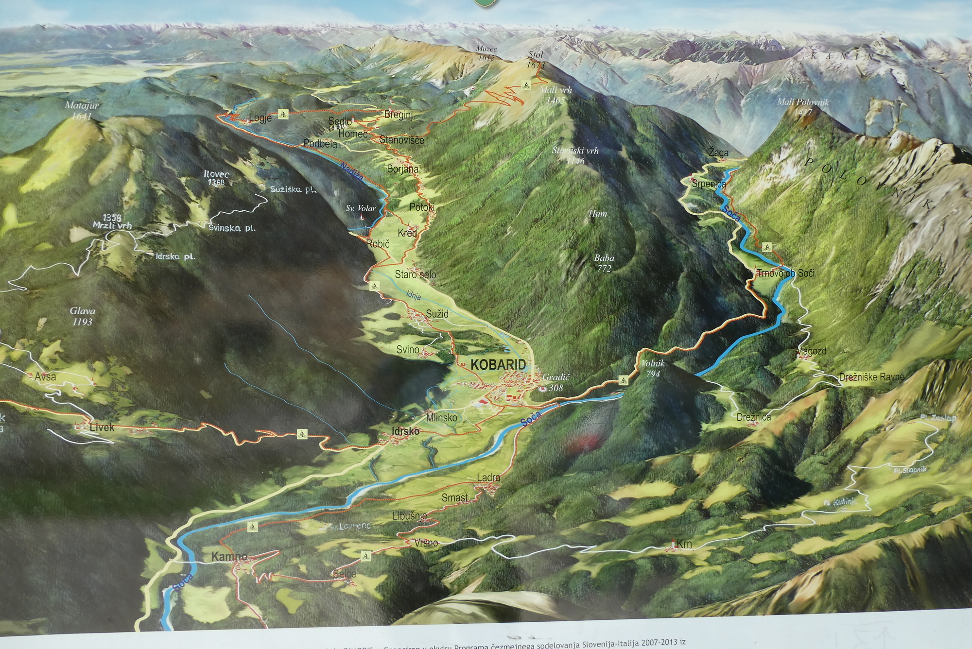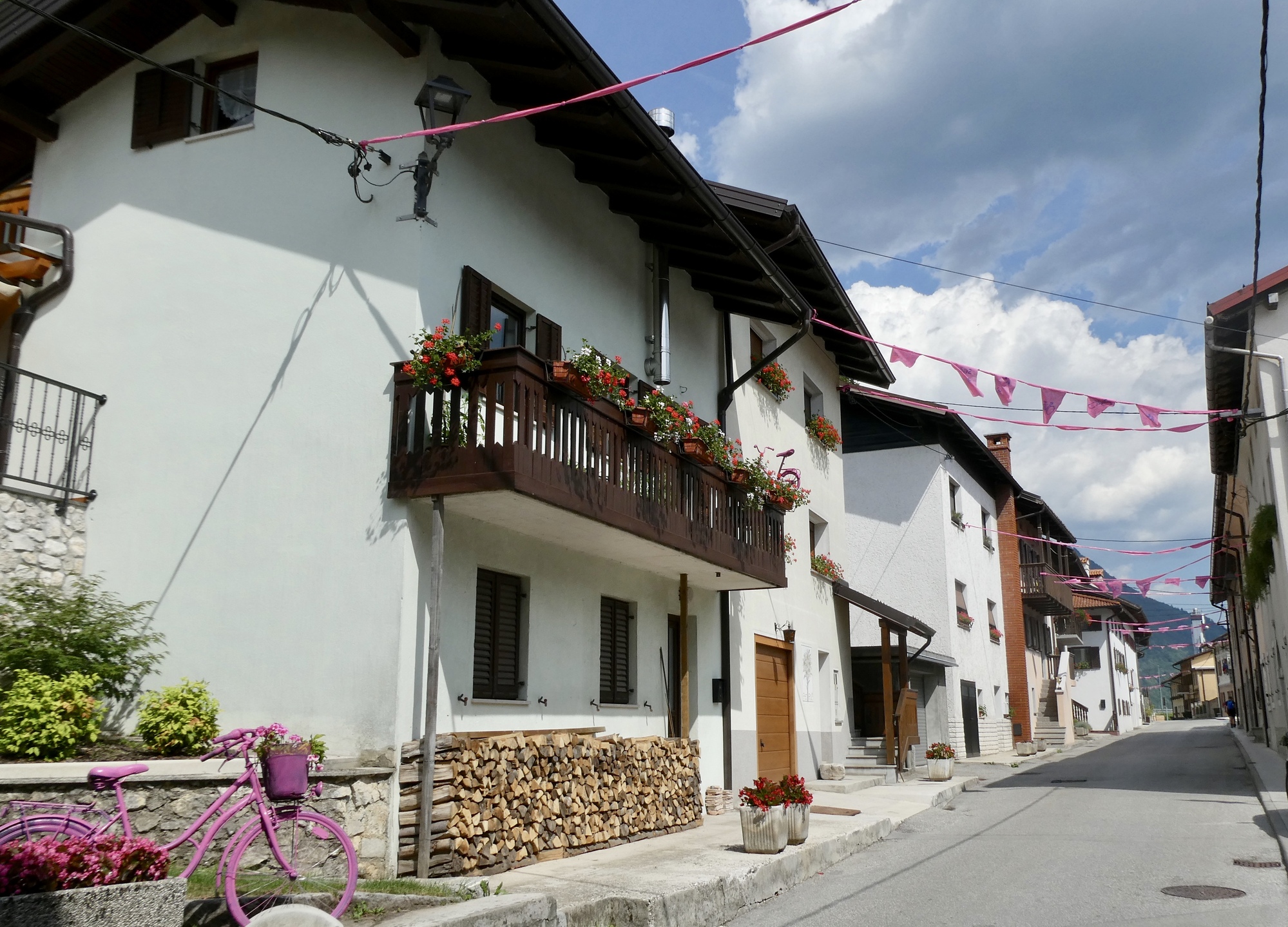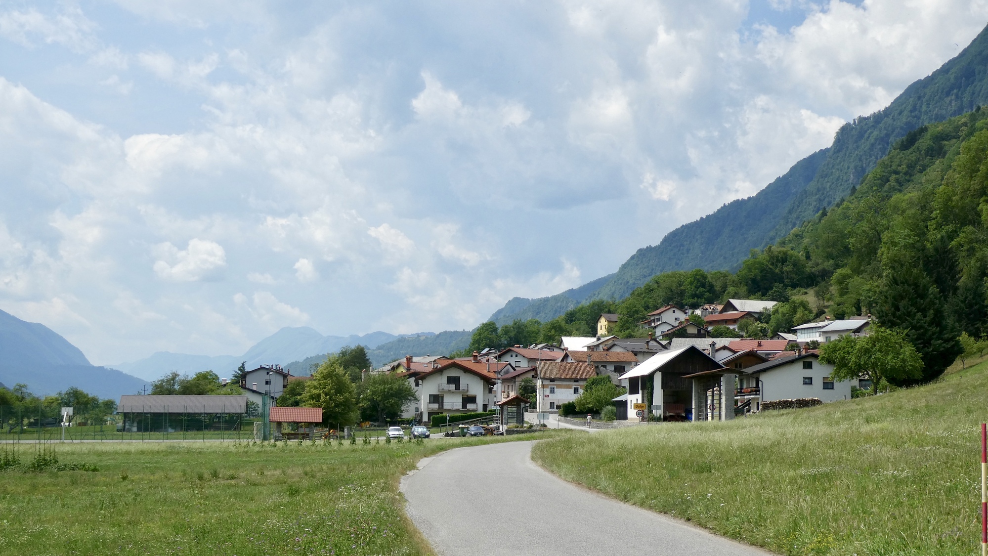 I bid farewell to Dominick and Heike and followed a dirt track to Most na Soči and then headed up the Soča River toward Kobarid. The route initially followed highway 102, but I noted that work is underway to install/improve a dedicated bike lane along the river. RWGPS directed me into one construction zone, but after several minutes trying to communicate with the friendly workers as to how I might connect with my route, I gave up and followed the highway into Tomlin. From there-on, I was on local roads winding through small towns as I made my up the valley. It was pleasant riding, with limited traffic and the Julian peaks looming in the distance.