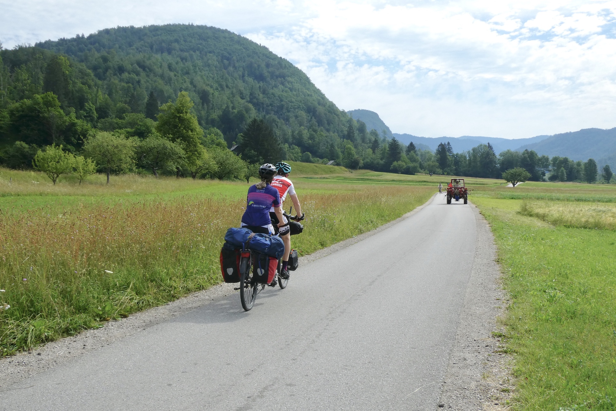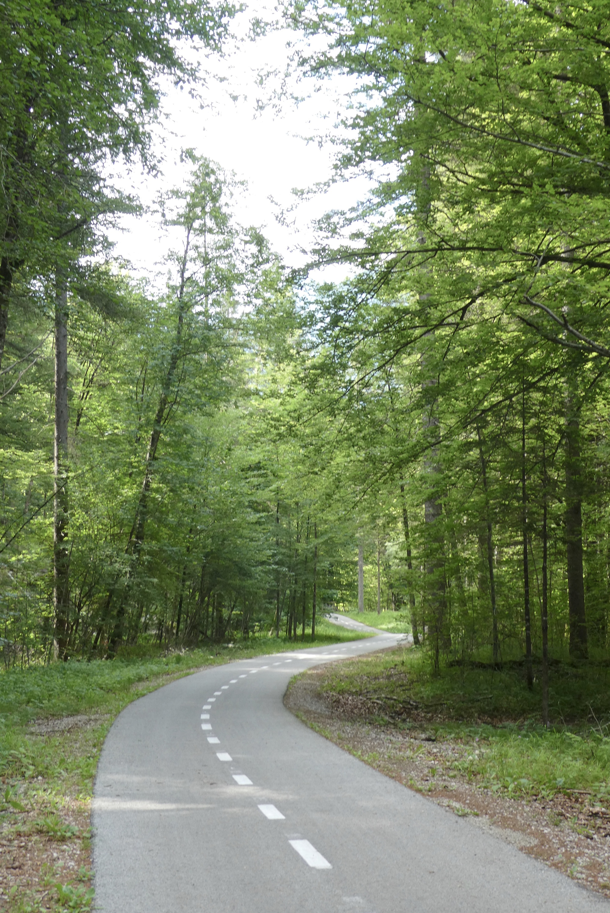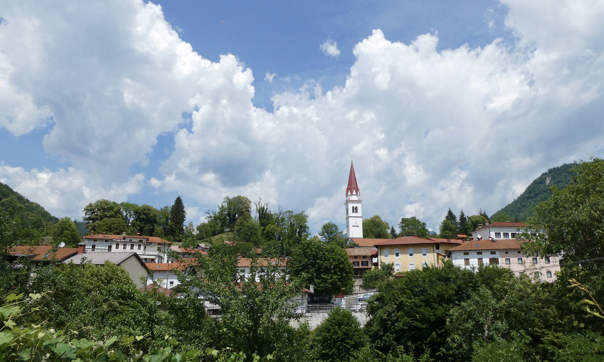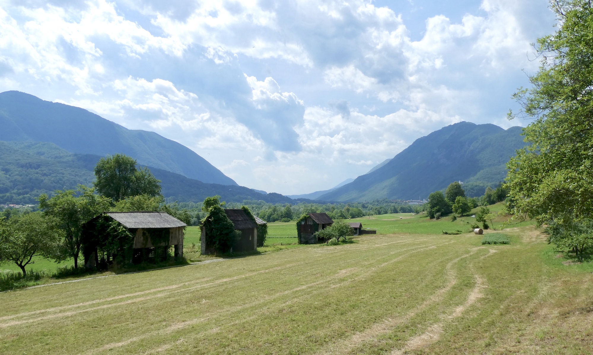 I bid farewell to Dominick and Heike and followed a dirt track to Most na Soči and then headed up the Soča River toward Kobarid. The route initially followed highway 102, but I noted that work is underway to install/improve a dedicated bike lane along the river. RWGPS directed me into one construction zone, but after several minutes trying to communicate with the friendly workers as to how I might connect with my route, I gave up and followed the highway into Tomlin. From there-on, I was on local roads winding through small towns as I made my up the valley. It was pleasant riding, with limited traffic and the Julian peaks looming in the distance.