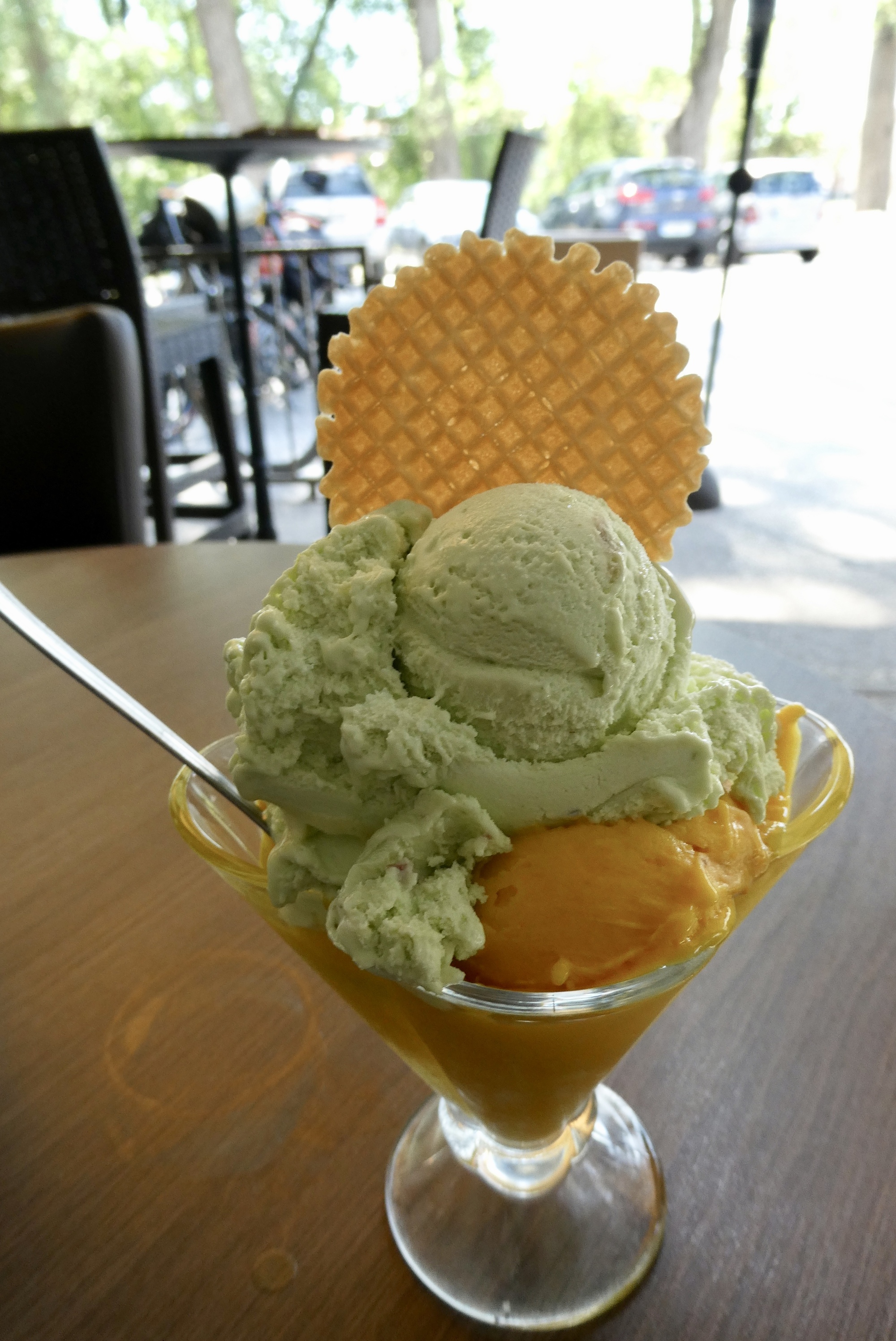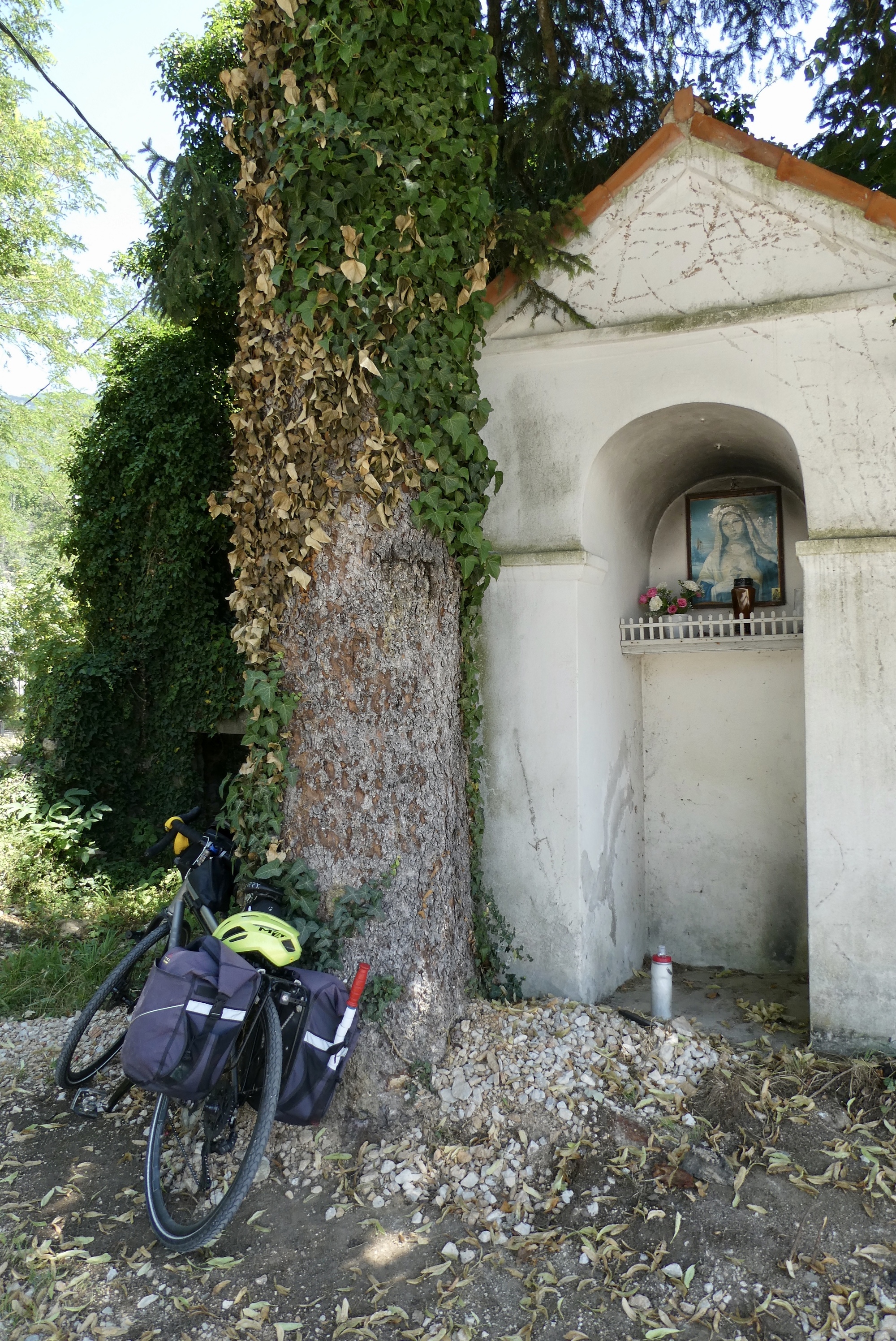 There are few roads traversing through the Vipava Valley, which serves as an important corridor connection Central Europe and Northern Italy. Fortunately, most traffic is found on the H4 autoroute rather than the regional highway 444. In addition, small roads meander up and down the hillsides through vineyards and small villages that lay beneath the Trnovo Forest Plateau. My planned route used a mix of small roads and, where they meandered too much, the regional highway. However, the combination of heat, no shade, and repeated short steep ascents was causing me to reconsider my plan – not only was it energy sapping, I was going too slow for any “biking breeze” to have an effect. I found a shady spot at a small monument to Mary, Mother of God where I fortified myself with half a sandwich and plenty of water. During the rest, I decided to stick to the highway for the remainder of the ride – the road was flatter, the traffic was pretty light, and the increase in my speed brought a little cooling breeze. The soundness of that decision was reinforced when I followed a man into an open bar where I got my water bottle refilled - it was the only such establishment I'd seen since leaving Nova Gorcia. I was soon in the Ajdovščina, the largest town in the valley, where I stopped for ice cream and a coke. Refreshed, I cruised into Vipava – hot, sweaty, and thankful for the welcoming smiles and pitcher of juice.