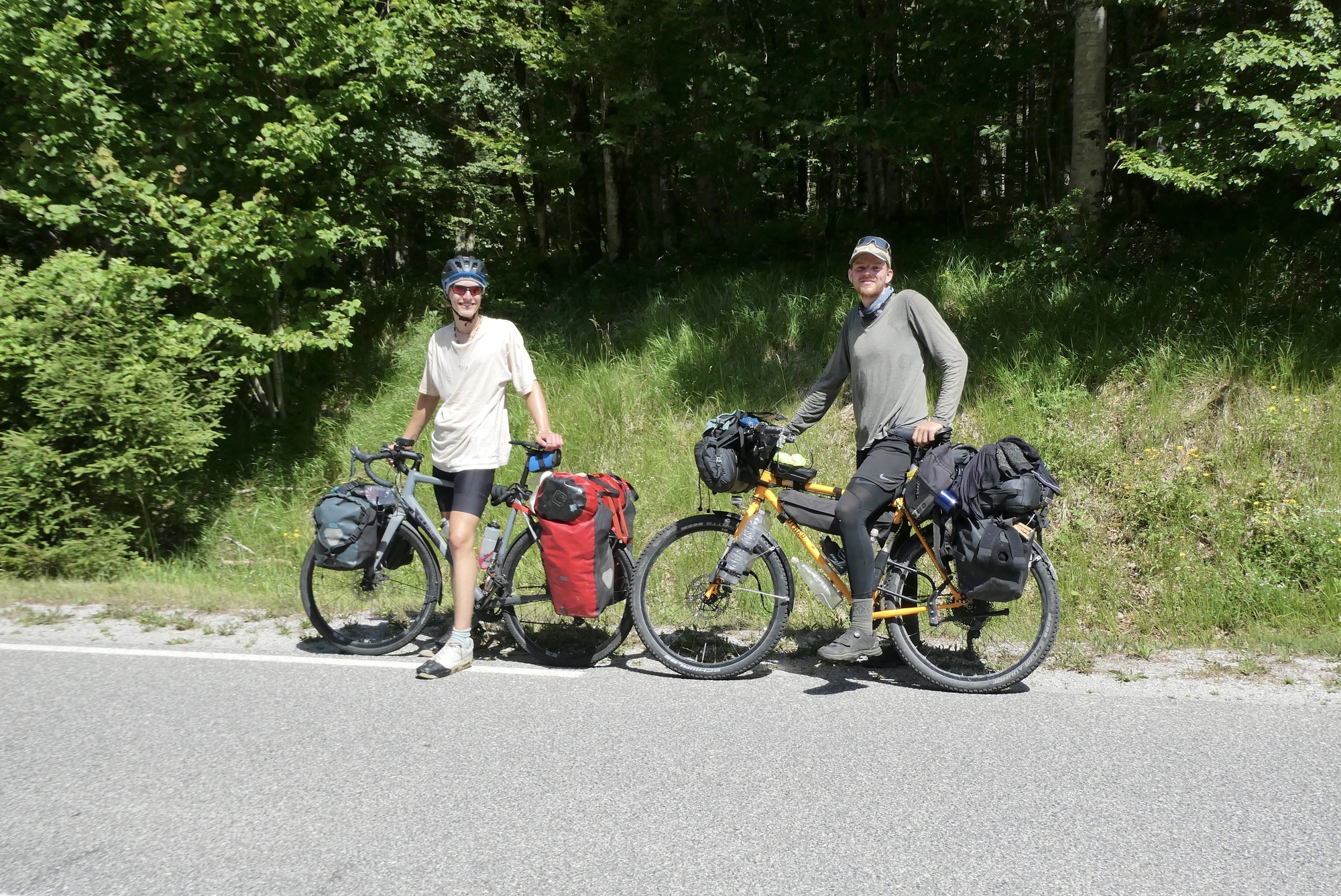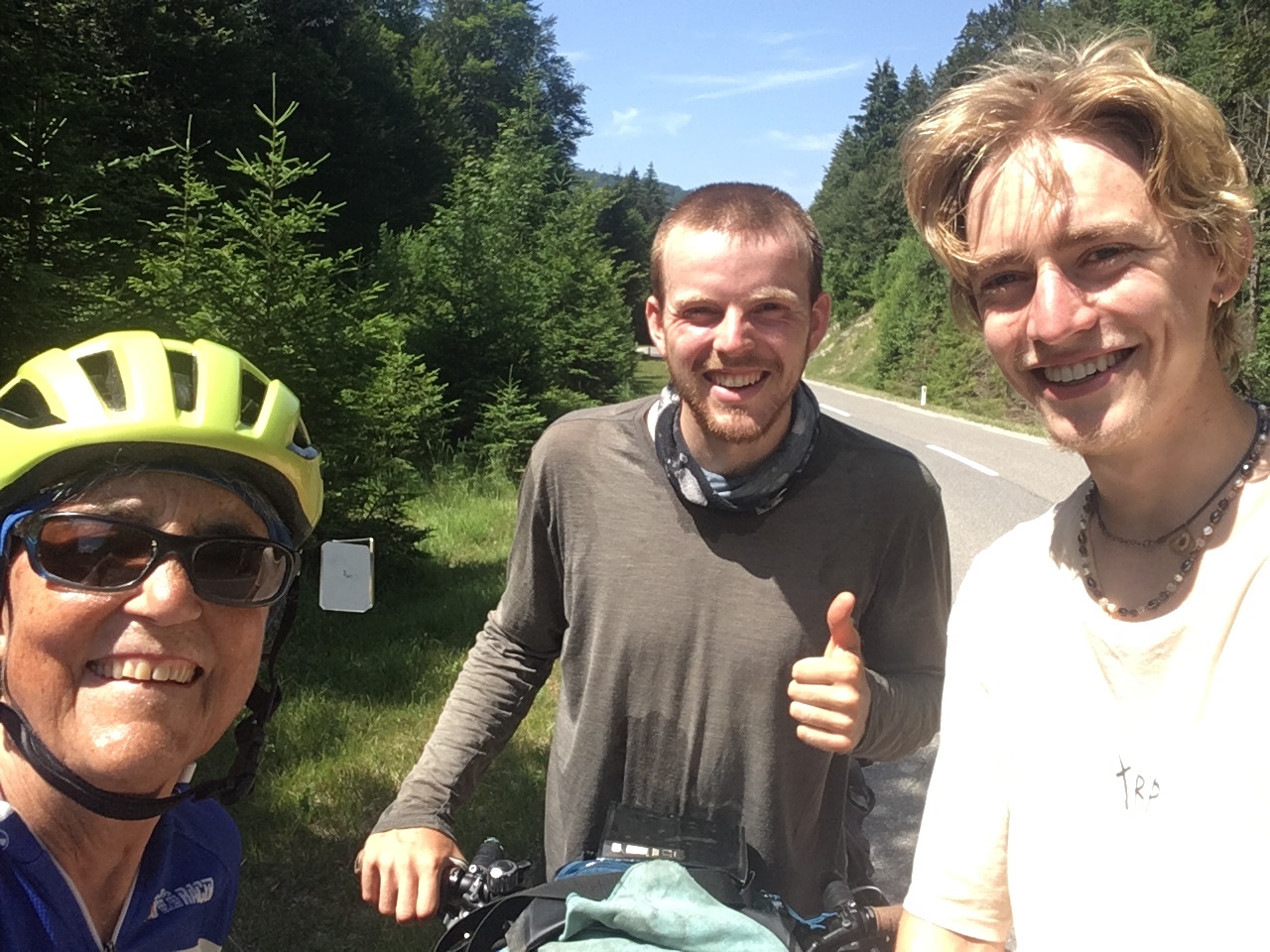 There were a couple of small settlements along the way, but mostly just long stretches with few cars and the occasional road cyclist. I was near the top of the first big climb of the day when I spotted two touring cyclists slowing down as they approached me from the opposite direction. We exchanged some pleasantries from across the road, then they came on over. Finn and Mika are both German but did not know each other when they each set out on their first long-distance bike tour – they met on a ferry in Croatia and since then had been traveling together back toward home. Their enthusiasm for touring was clearly evident, from stories of sleeping in farm fields and waking with cows, to wondering how it will feel to sit in a chair again. Finn was taken with my mirror, so I gave him one of my spares – Mika, who had no glasses, was clearly jealous. We spent about twenty very entertaining minutes standing in the sun on the side of the road, joking, laughing, and being silly. Finally, we had to move on, with hand-shakes and good will all around.