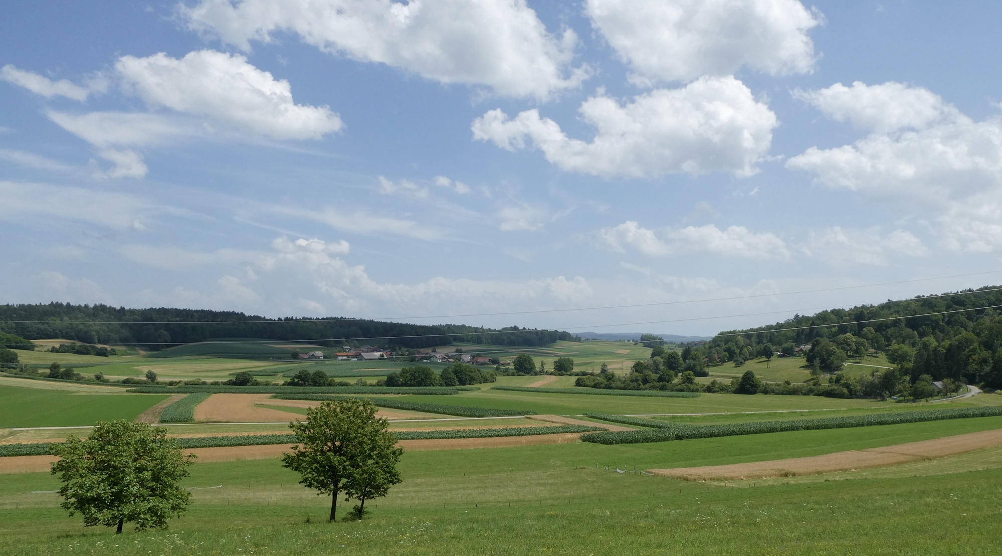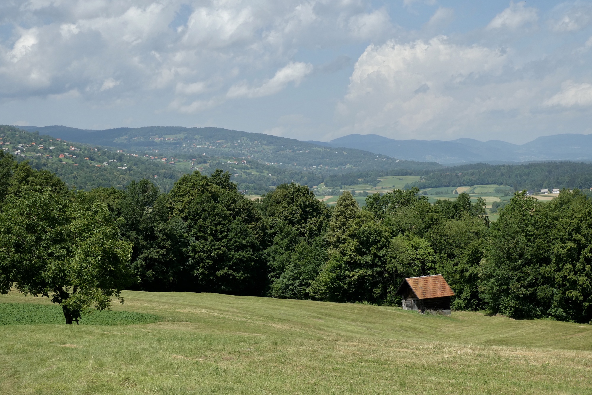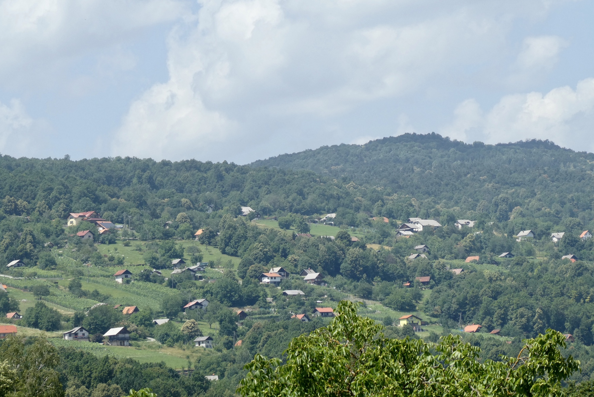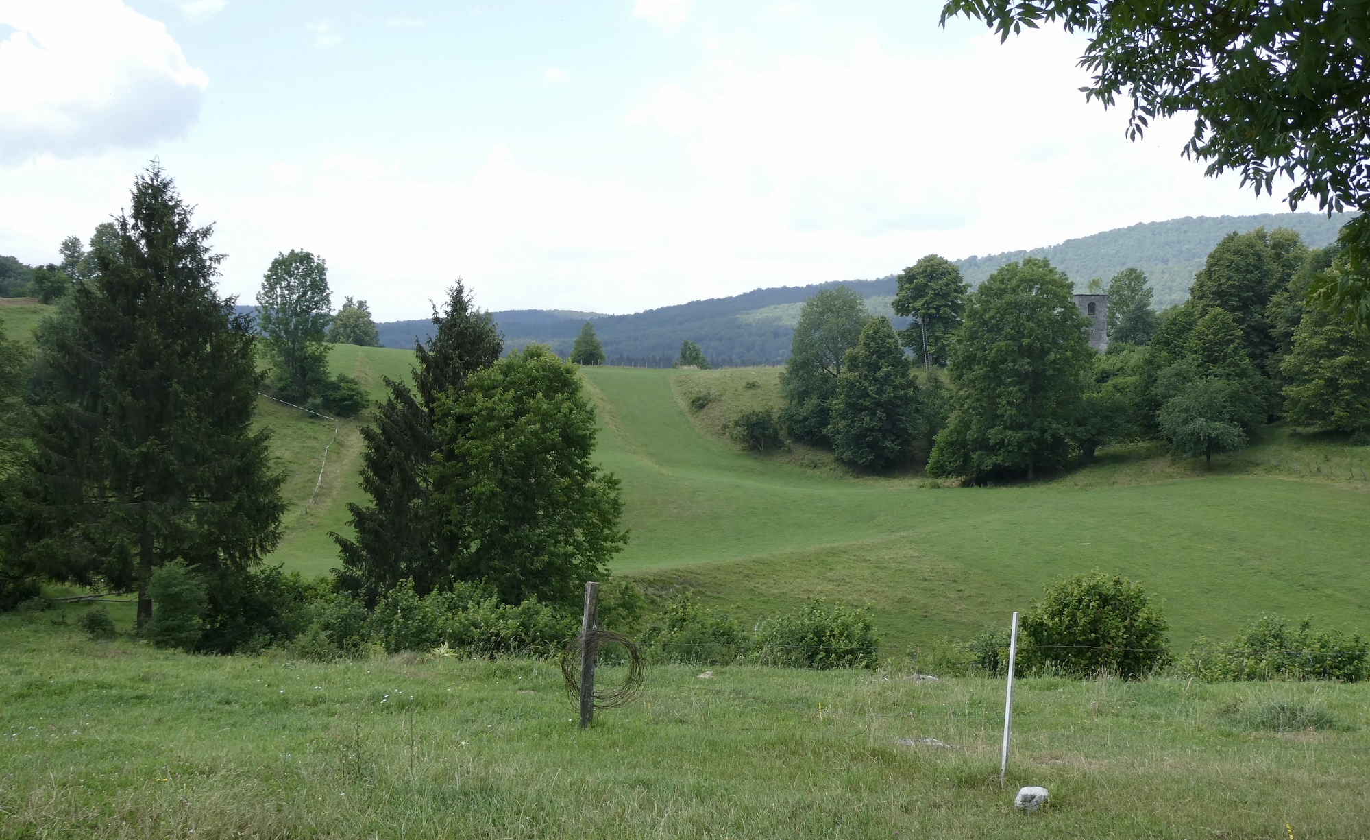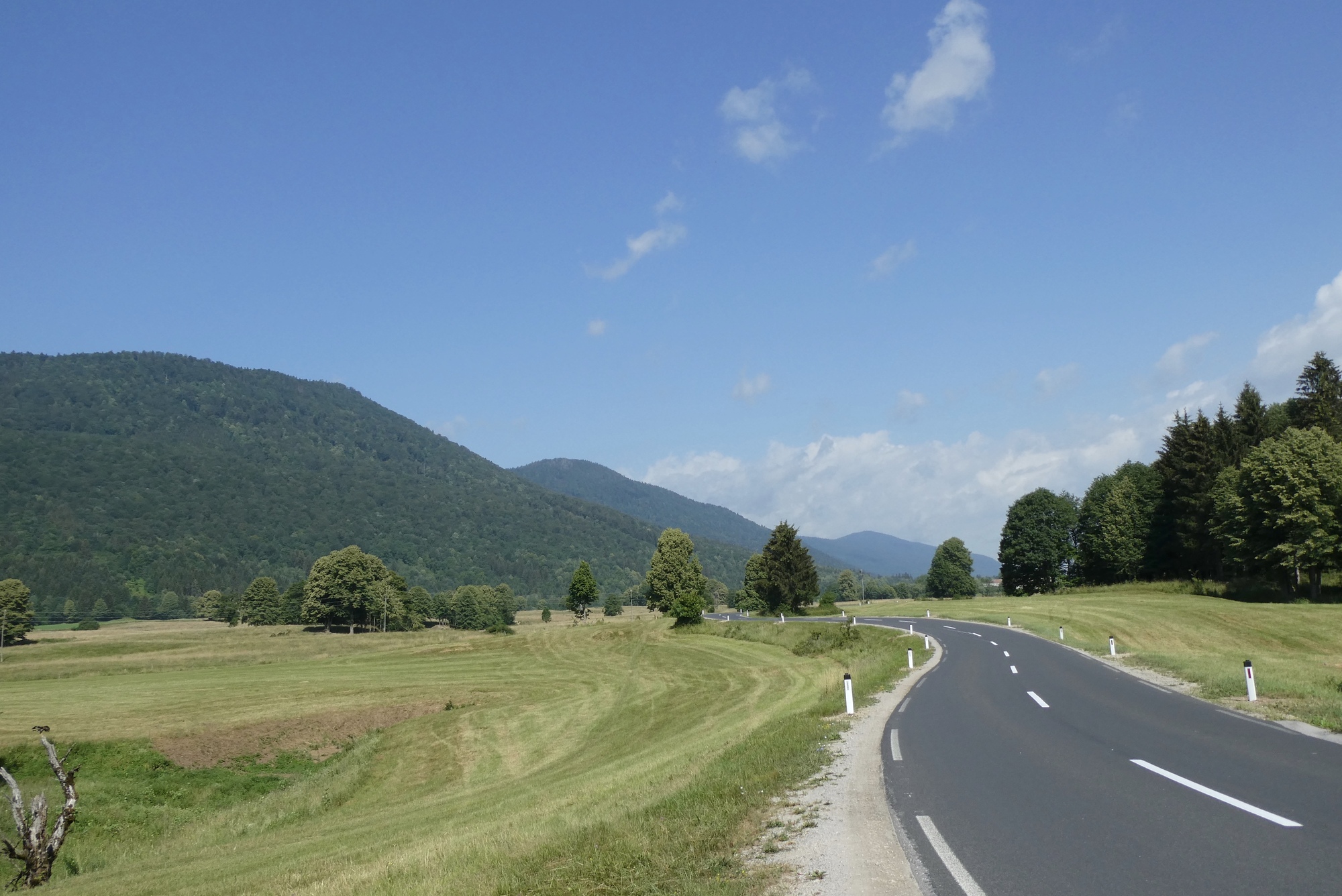 The Bearlog Hostel had a number of maps of the area's hiking and biking trails, complete with topological features, road surface and level of difficulty. This greatly facilitated my route planning for today, which would take me southeast toward the Kolpa River before curving back up to Črnomelj. Although the day would be spent mostly on lightly traveled regional highways or local roads, the first three miles were on the busy Hwy 106. Major road construction at my turnoff to Hwy 217 in Livold caused some delay and a traffic clot, but soon I was cycling though narrow meadows and forested hillsides.
