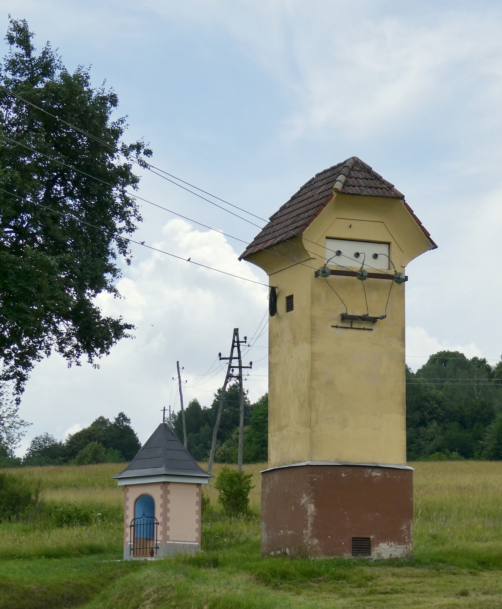 I'd seen many of these small towers in and near towns, not realizing until today that they are electricity hubs, mini-electric towers, or in this case, electric minions. Though not all of them come with an adjacent shrine.