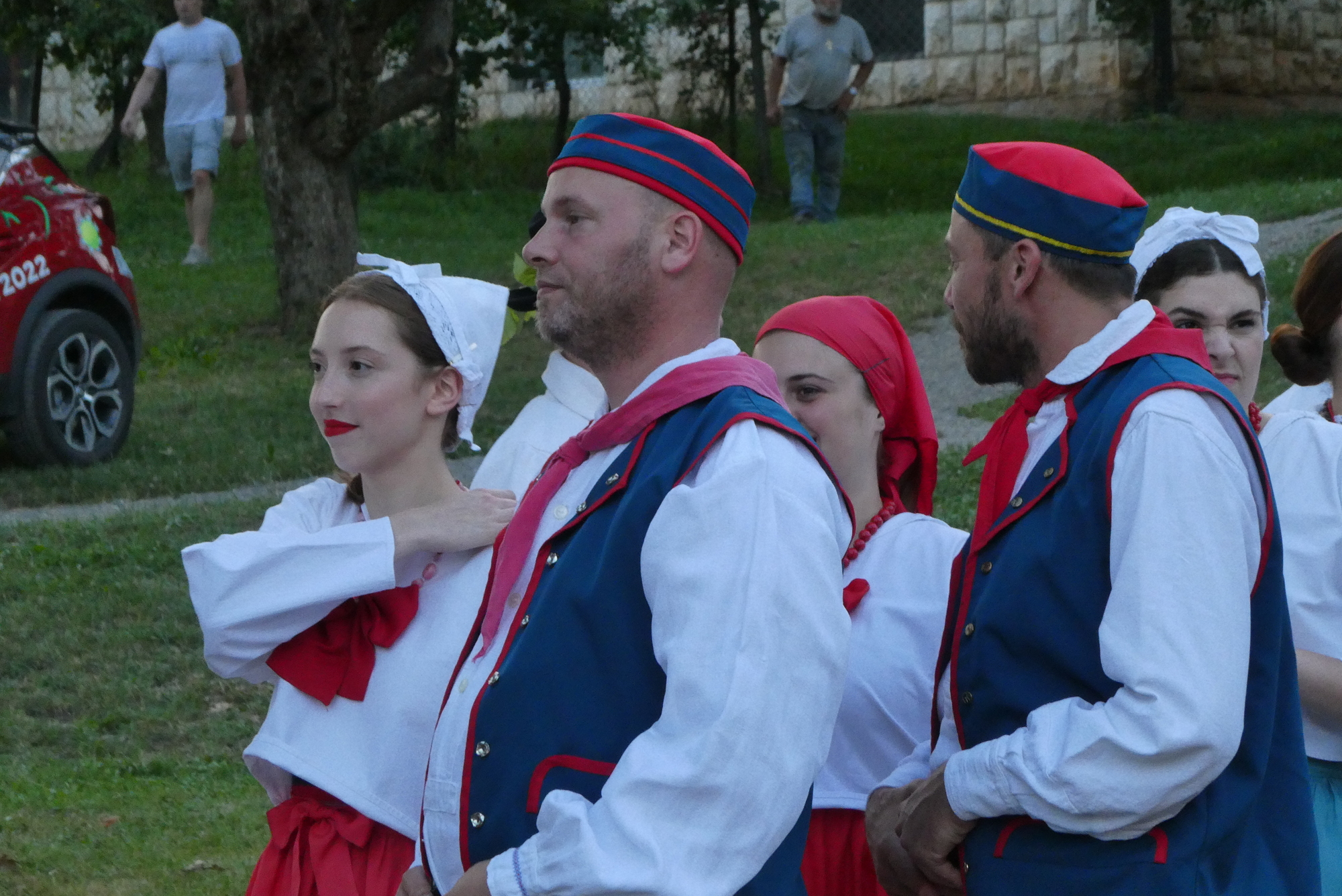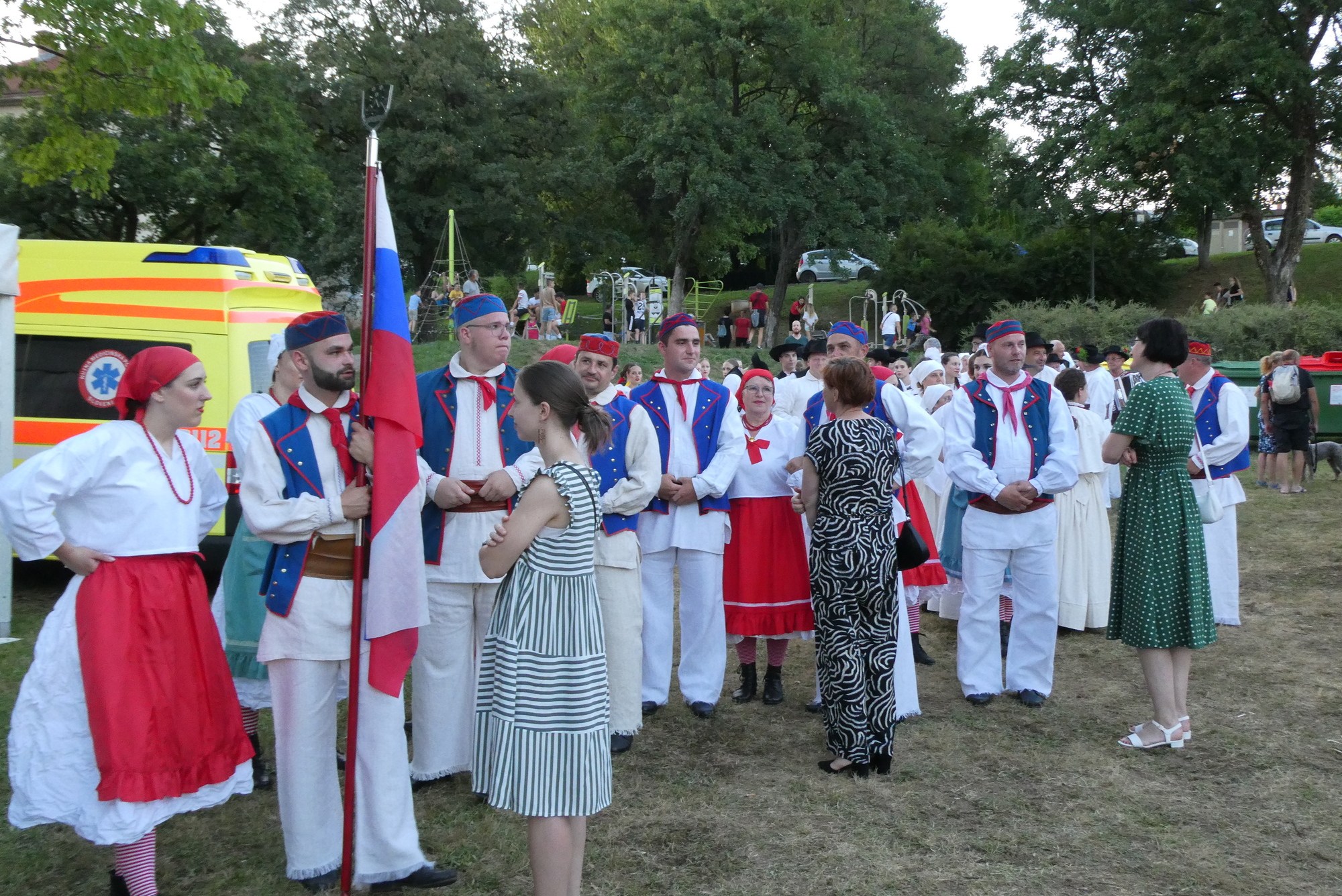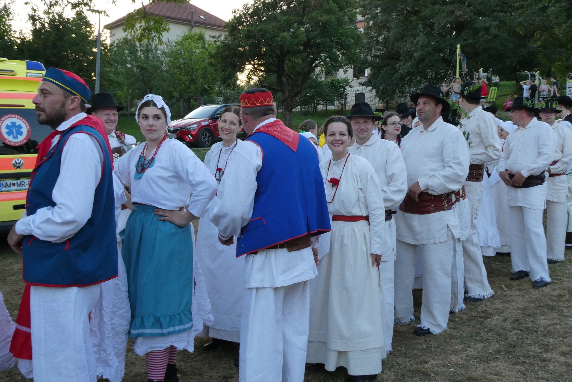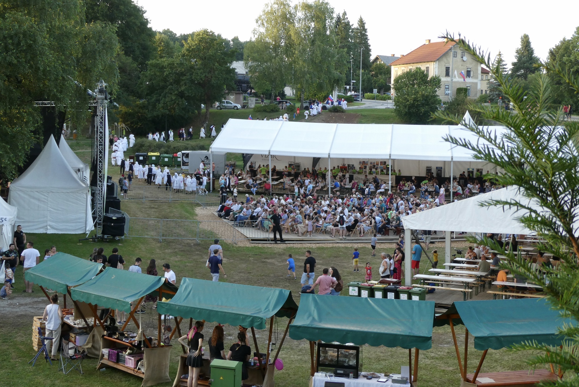 After a long shower and a short rest, I headed back into town for Jurenicka, the International Folk Festival held each year in Črnomelj. I really wasn’t sure what to expect, maybe a parade or dancing in the streets. I’d noticed posters for festival while having my ice cream earlier that day and had asked when/where the festival was – up main street was the reply. But when I returned that evening, I couldn’t find the main street – it wasn’t down by the river as one might expect. After walking around a bit and seeing no signage for the event, I asked for directions from Tino, a tourist from Estonia who was traveling around Slovenia by train. I followed Tino’s general directions, as well a few folks who seemed to be heading the same way, and after a long walk came to a large park on the edge of town. There were tents, a large performance stage, and a stream of traditionally-clad people heading up the hill and away from the stage. I had arrived at a break in the folk festivities.