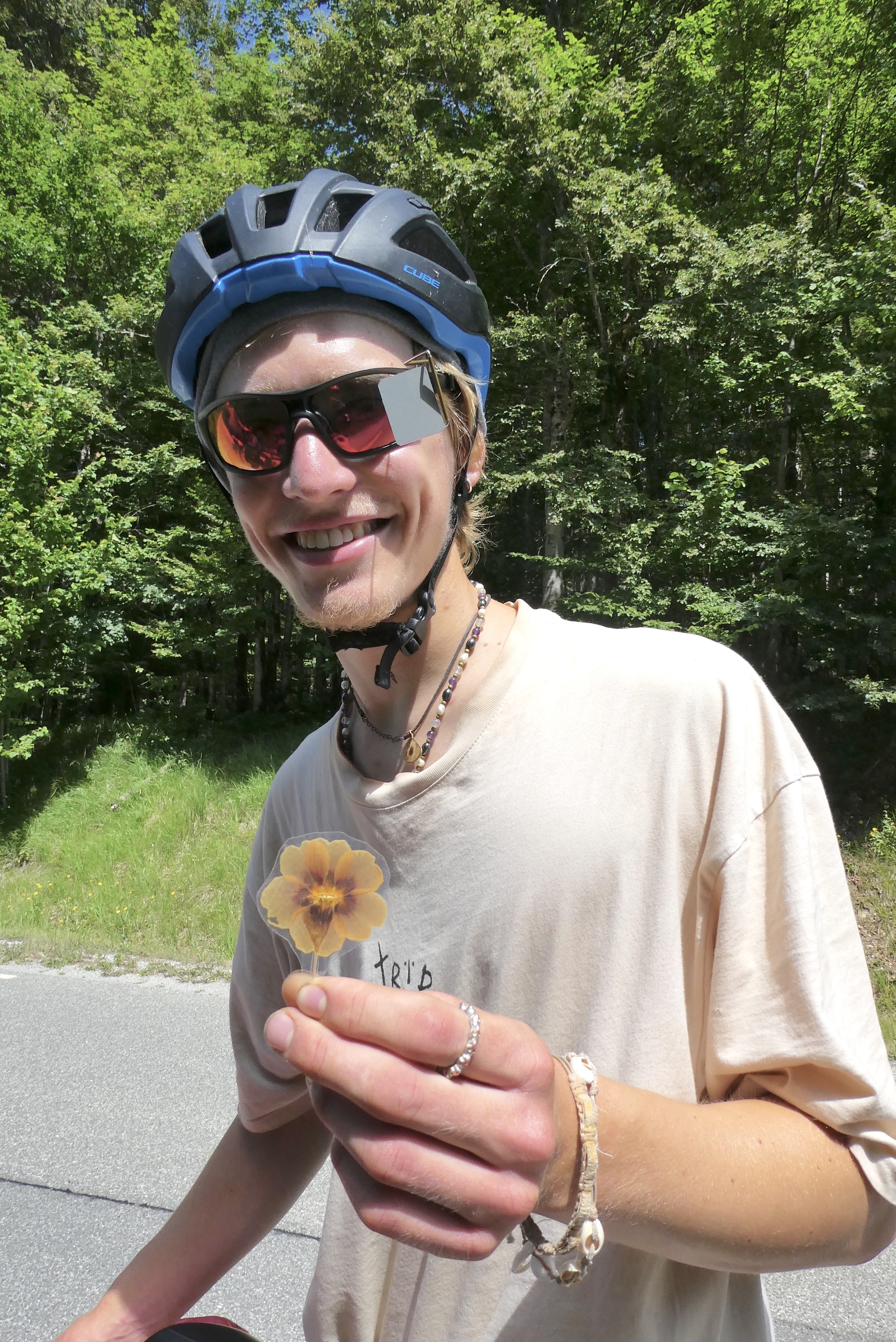 Finn so liked my mirror that he gave me one of his mother's pressed and laminated flowers - gifts that he had brought to share with those he met on the road