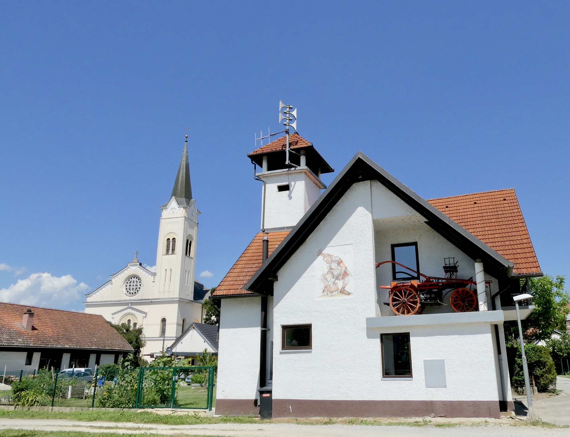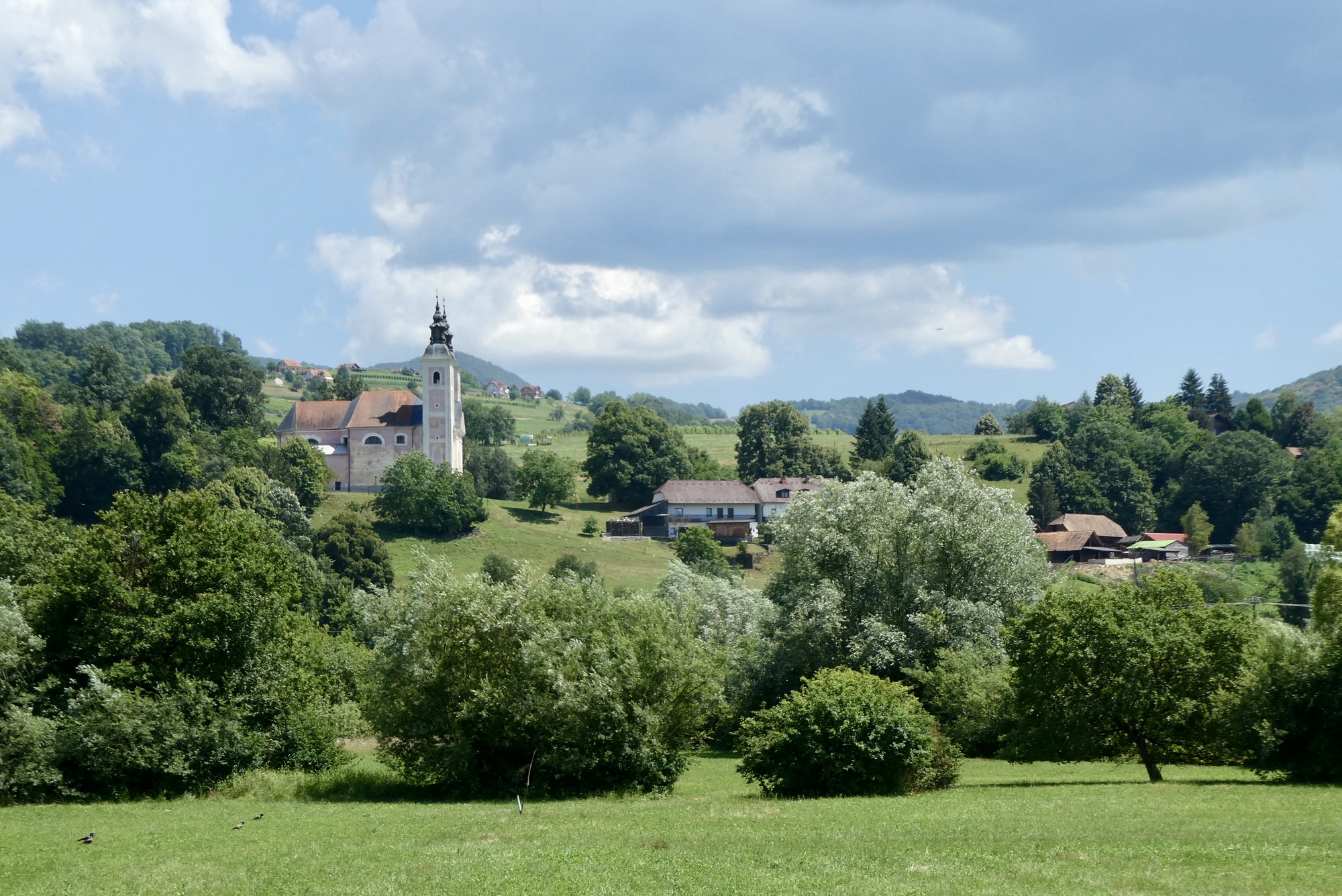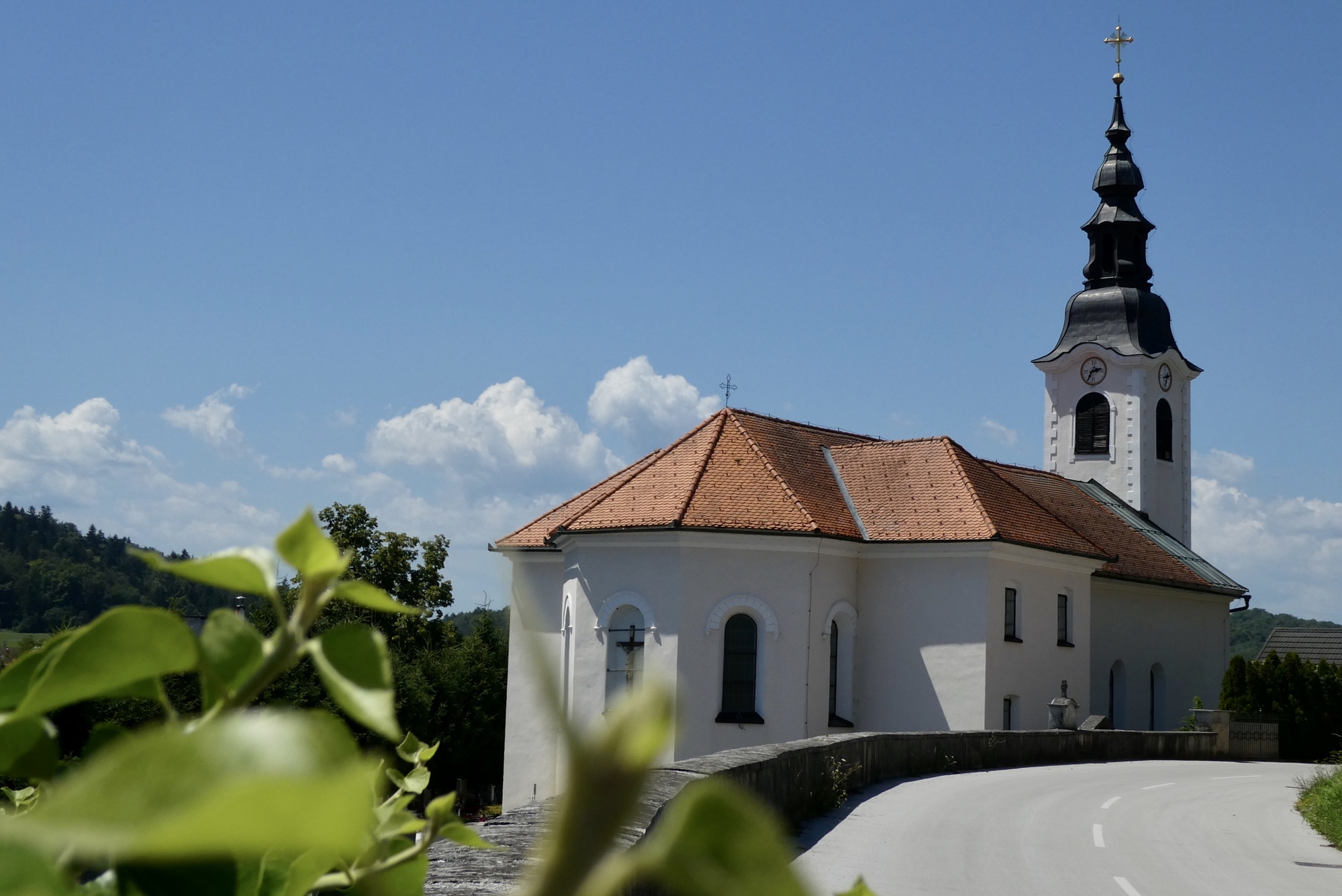 There appears to be an endless variety of tower/steeples that adorn Slovenian churches. Here the steeple appear somewhat similar to that in the first photo, but the towers differ in the number and shape of windows
