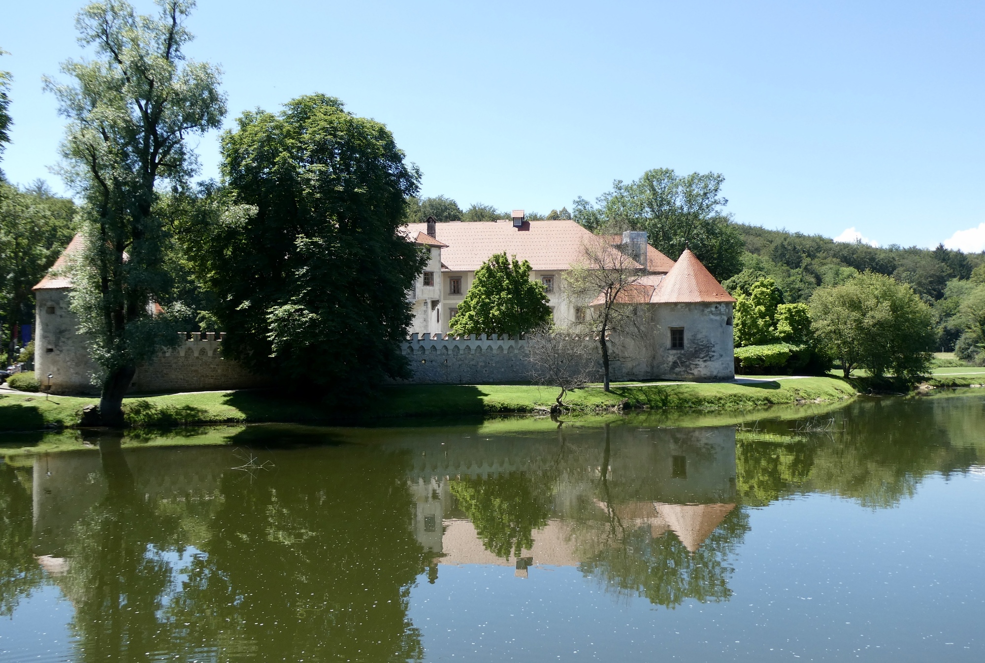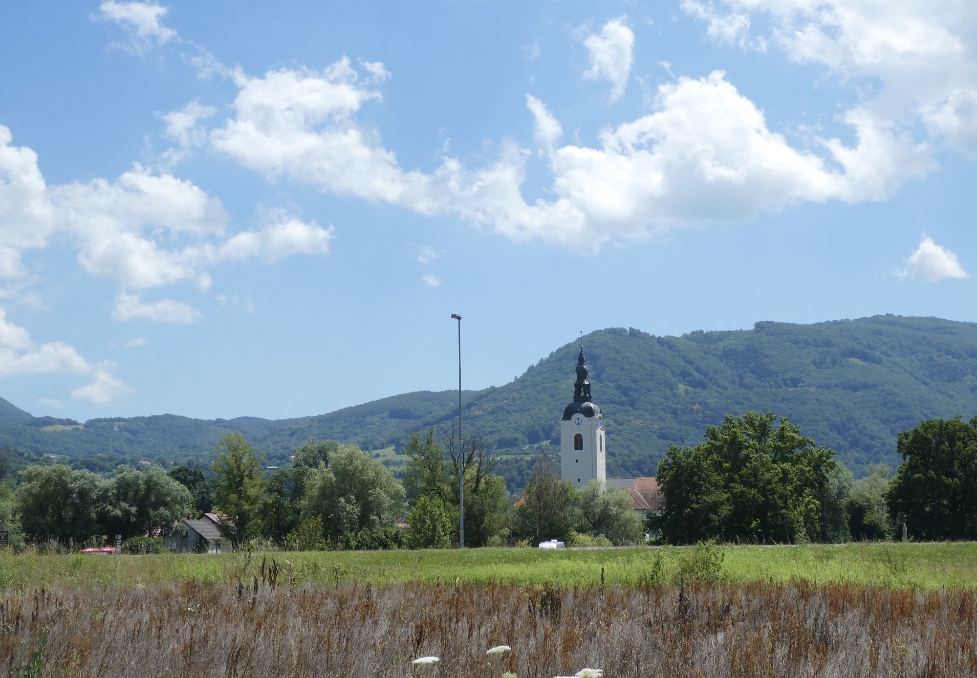 Today was a glorious cycling day, a relatively easy 32 miles down the Krka River to where it joins the Sava River at Brežice. The cloudless skies were a brilliant blue and though the unusually high temperatures continued, I felt refreshed as I left Novo Mesto. I felt so good, in fact, that I spent the morning trying to catch up on the journal a bit, which delayed my departure until just past eleven, resulting in a bit of a sweltering ride later in the afternoon.