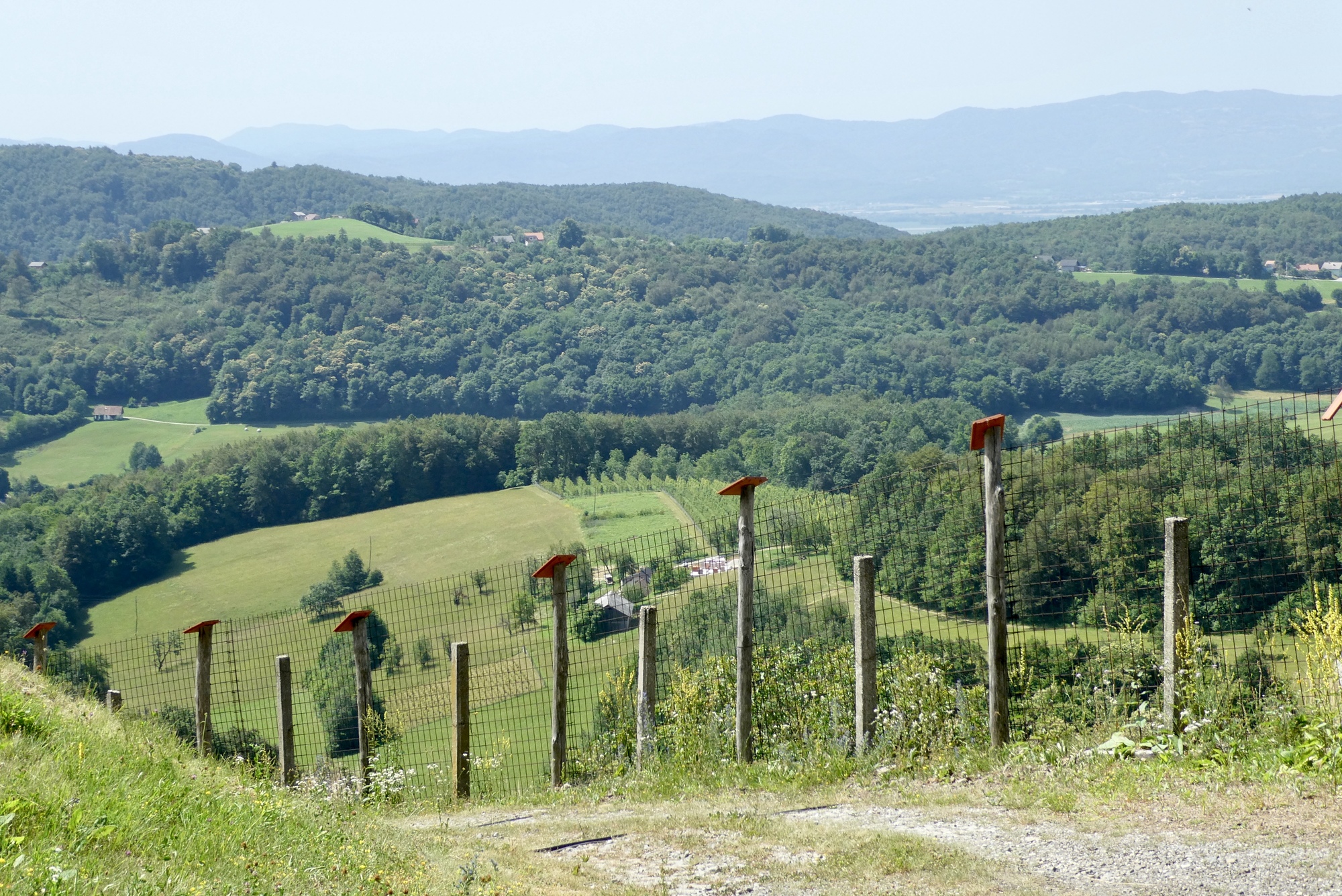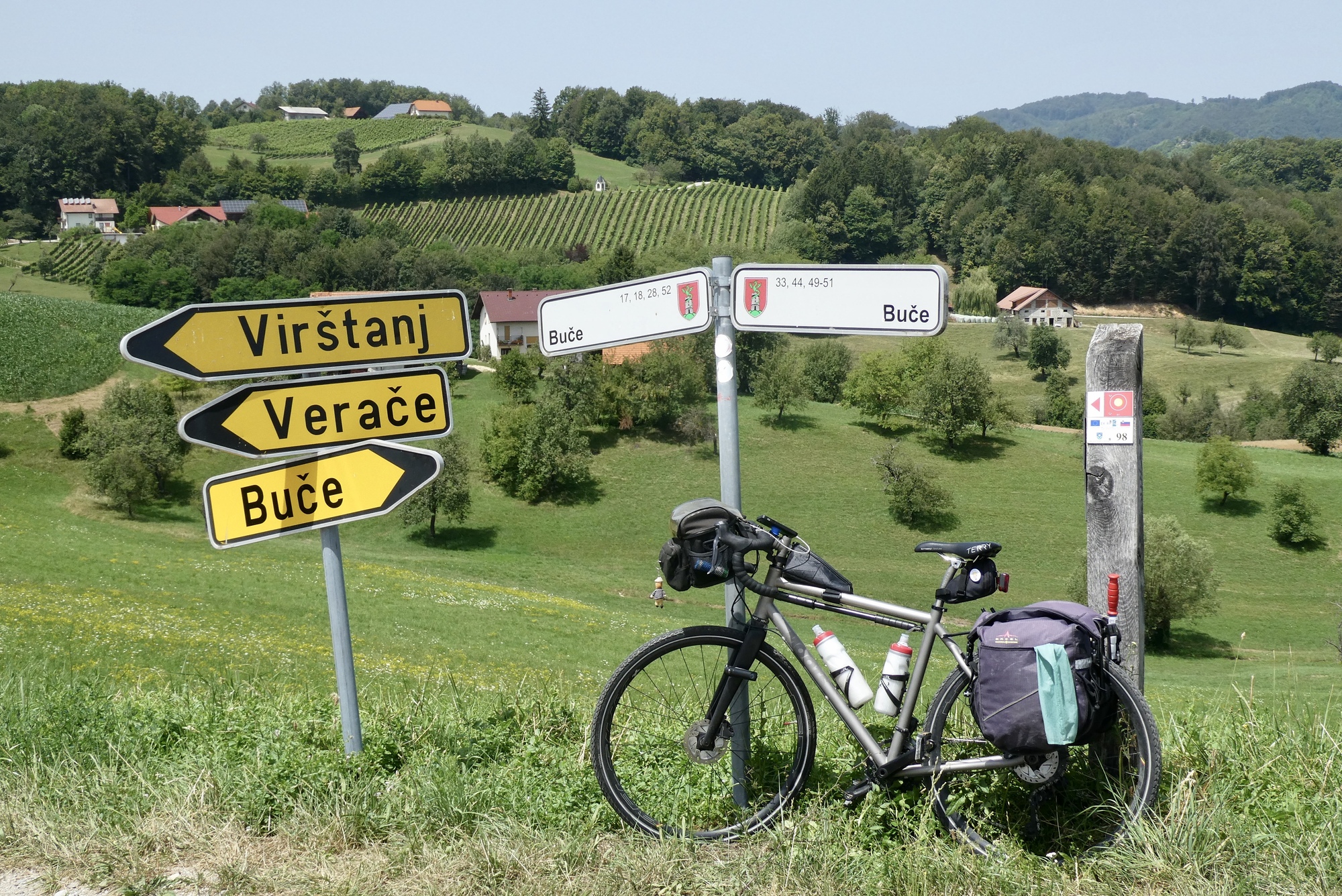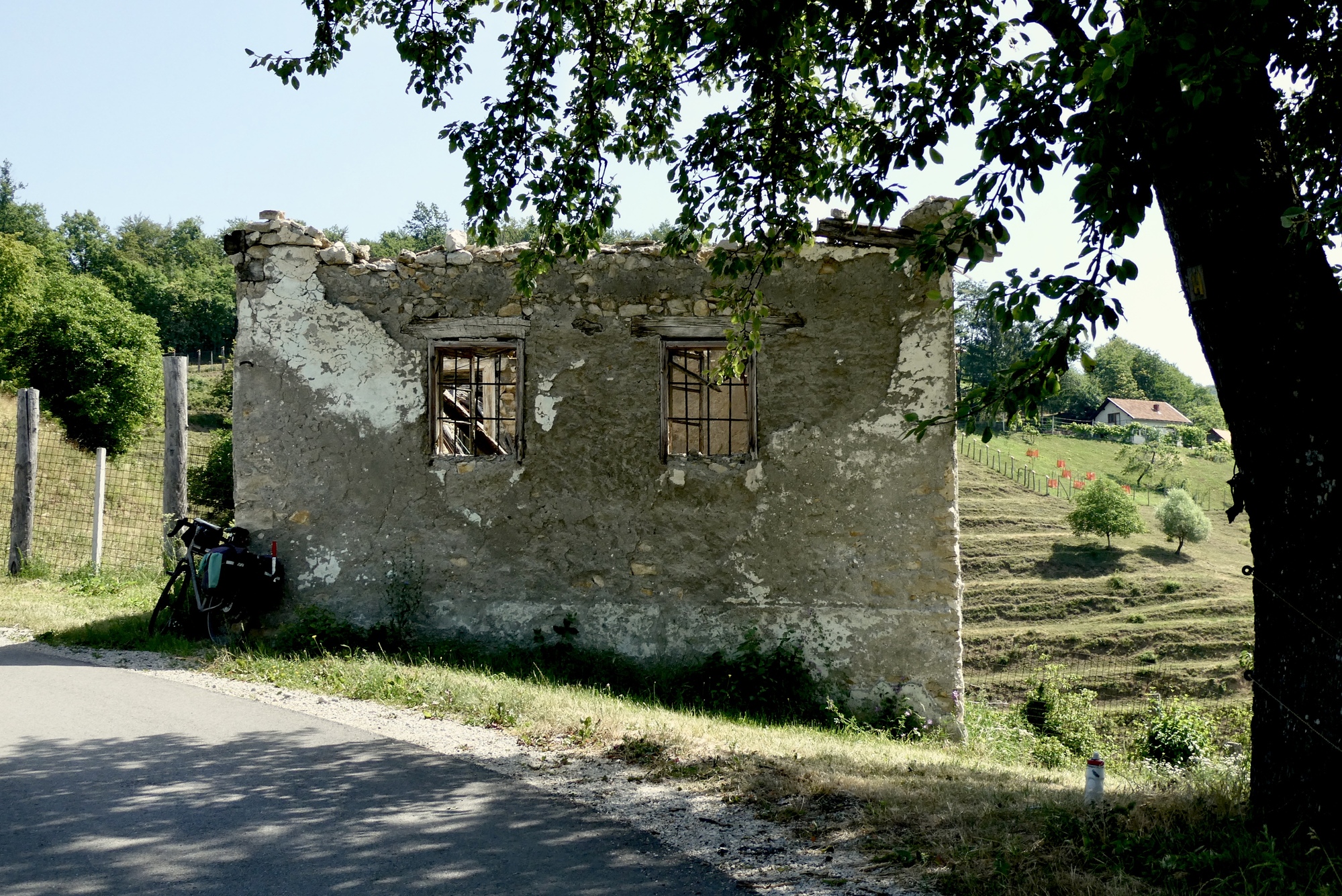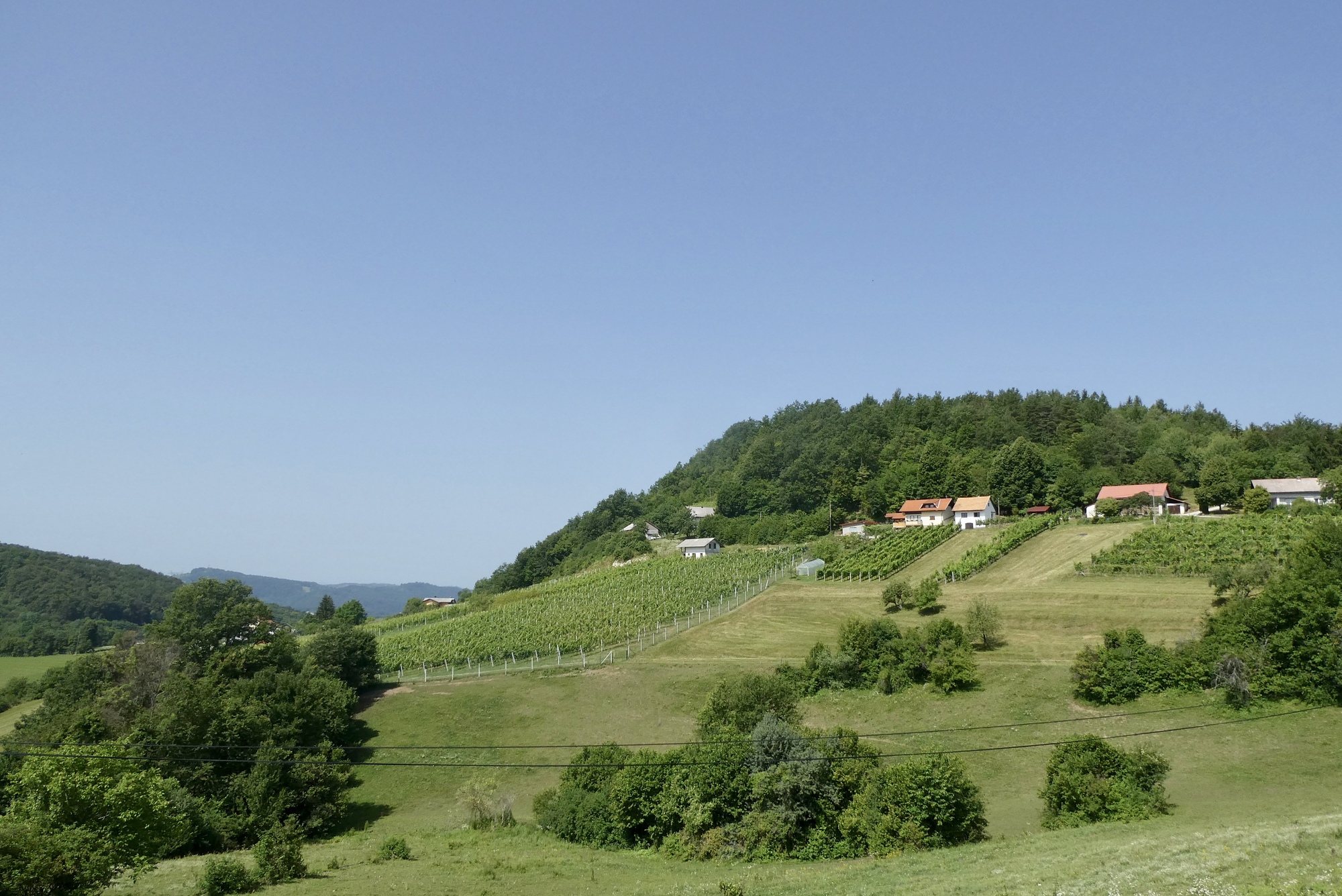 The first few miles were pleasant riding as I left the Sava River Valley and began wending my way through the lower hills. From then on, the ride was mostly up, with some terrifying downs, and delightful stretches in between. The scenery was storybook - steep slopes sprinkled with farmsteads and covered with assorted row crops, fruit trees, or vineyards - each a bit different but largely the same. The hillsides steepened as I made my way north, and some sections were brutal, especially in the hot sun. As they day progressed, hike-a-bike and and/or rest stops became more frequent, with almost any patch of shade a welcome excuse for a brief stop.