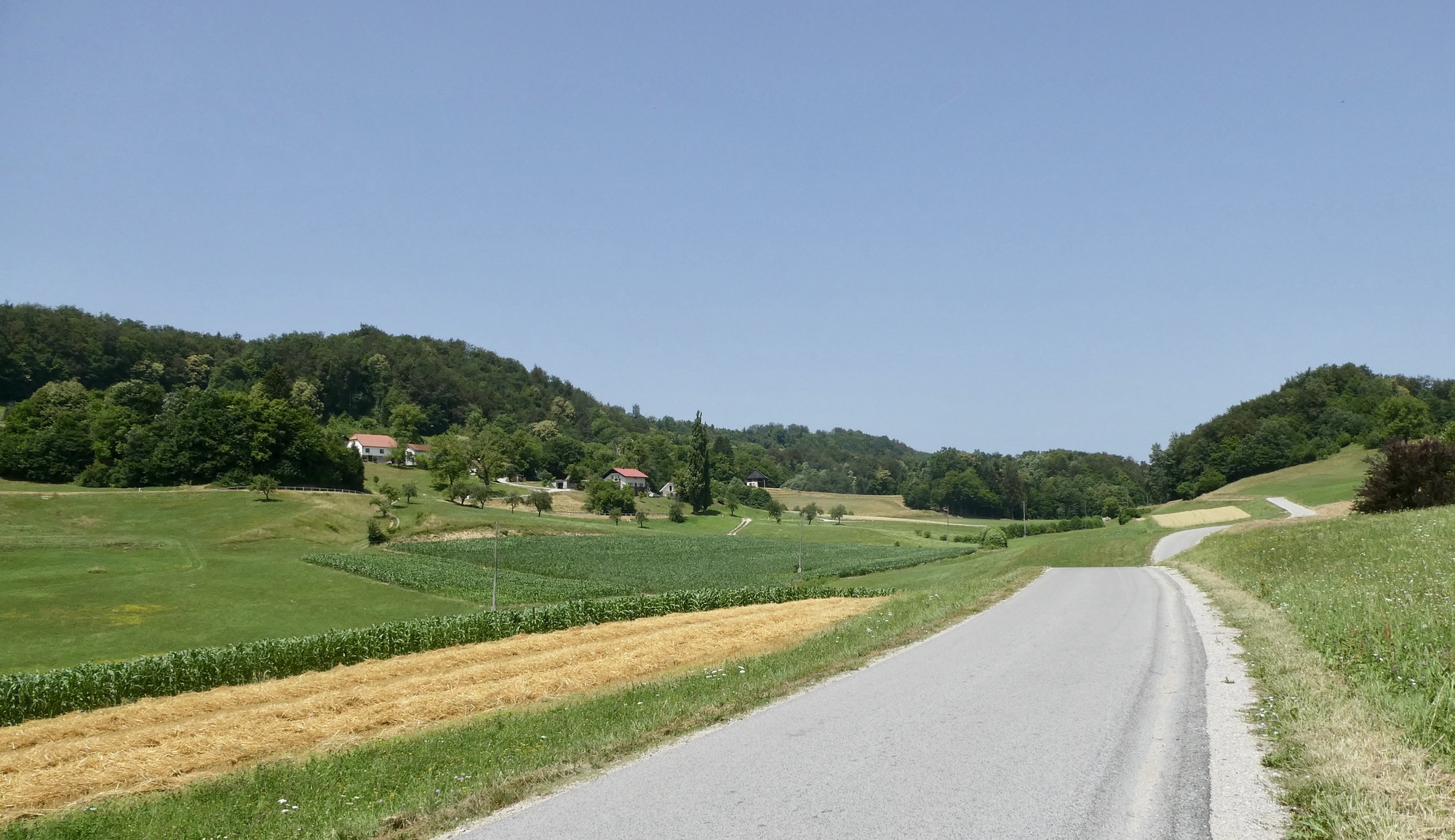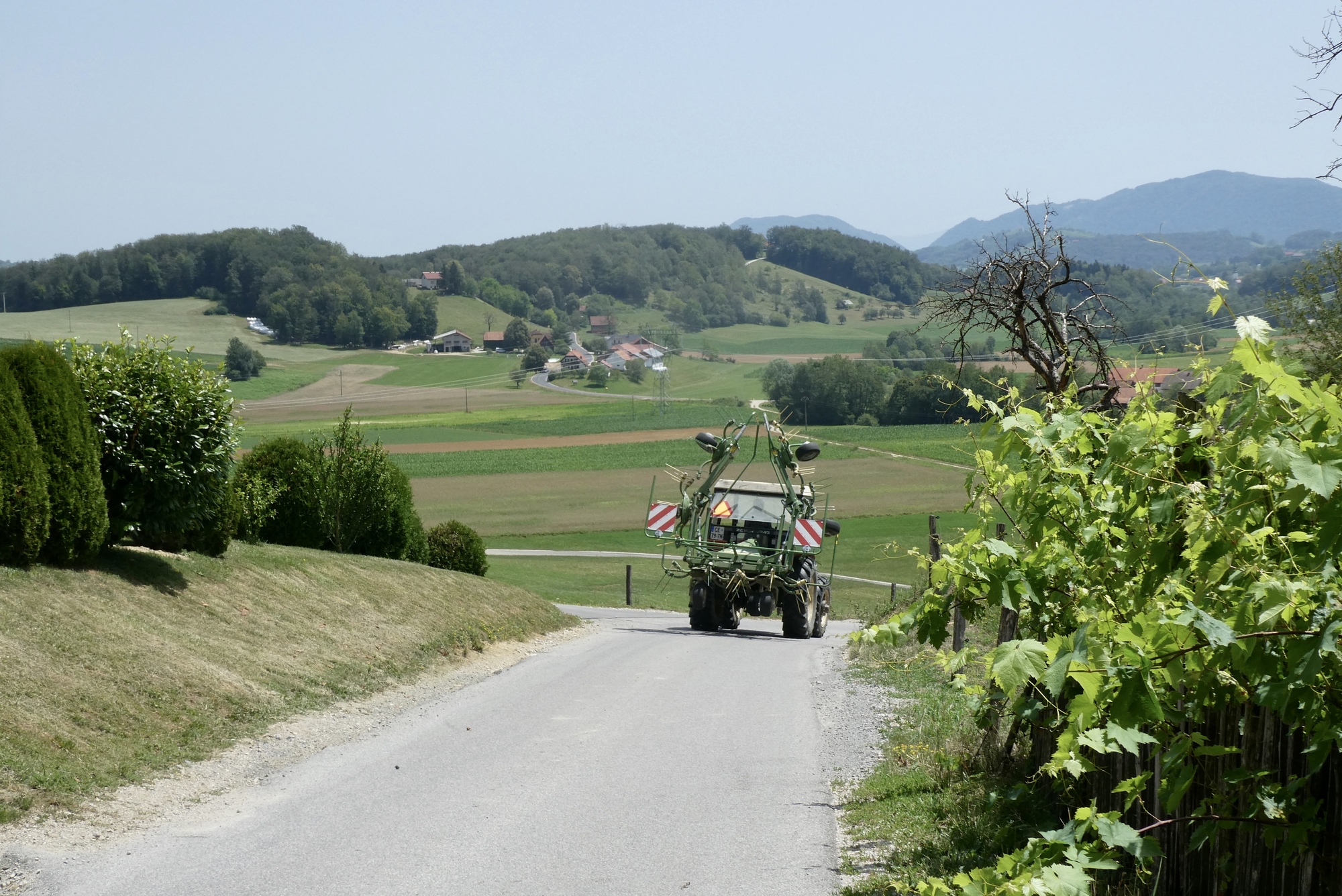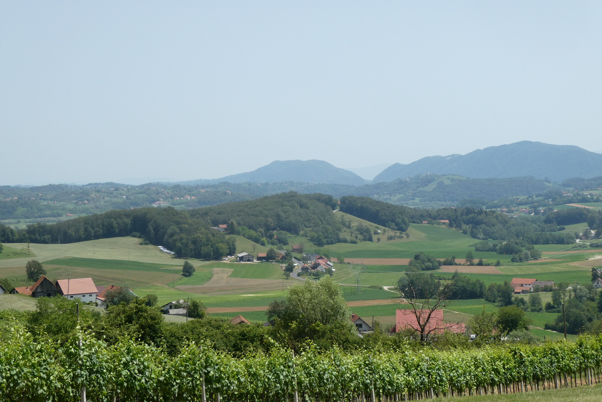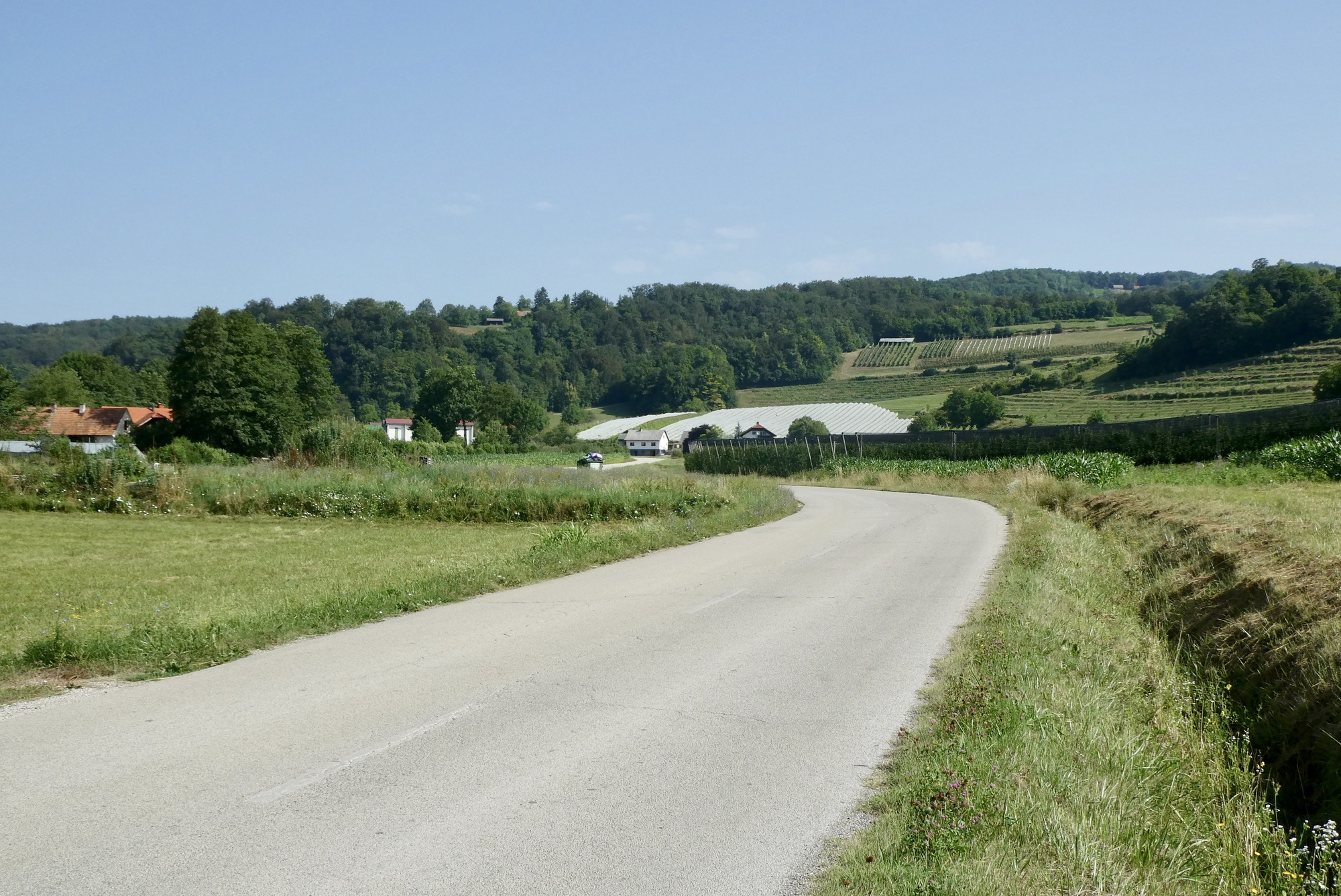 The first few miles were pleasant riding as I left the Sava River Valley and began wending my way through the lower hills. From then on, the ride was mostly up, with some terrifying downs, and delightful stretches in between. The scenery was storybook - steep slopes sprinkled with farmsteads and covered with assorted row crops, fruit trees, or vineyards - each a bit different but largely the same. The hillsides steepened as I made my way north, and some sections were brutal, especially in the hot sun. As they day progressed, hike-a-bike and and/or rest stops became more frequent, with almost any patch of shade a welcome excuse for a brief stop.