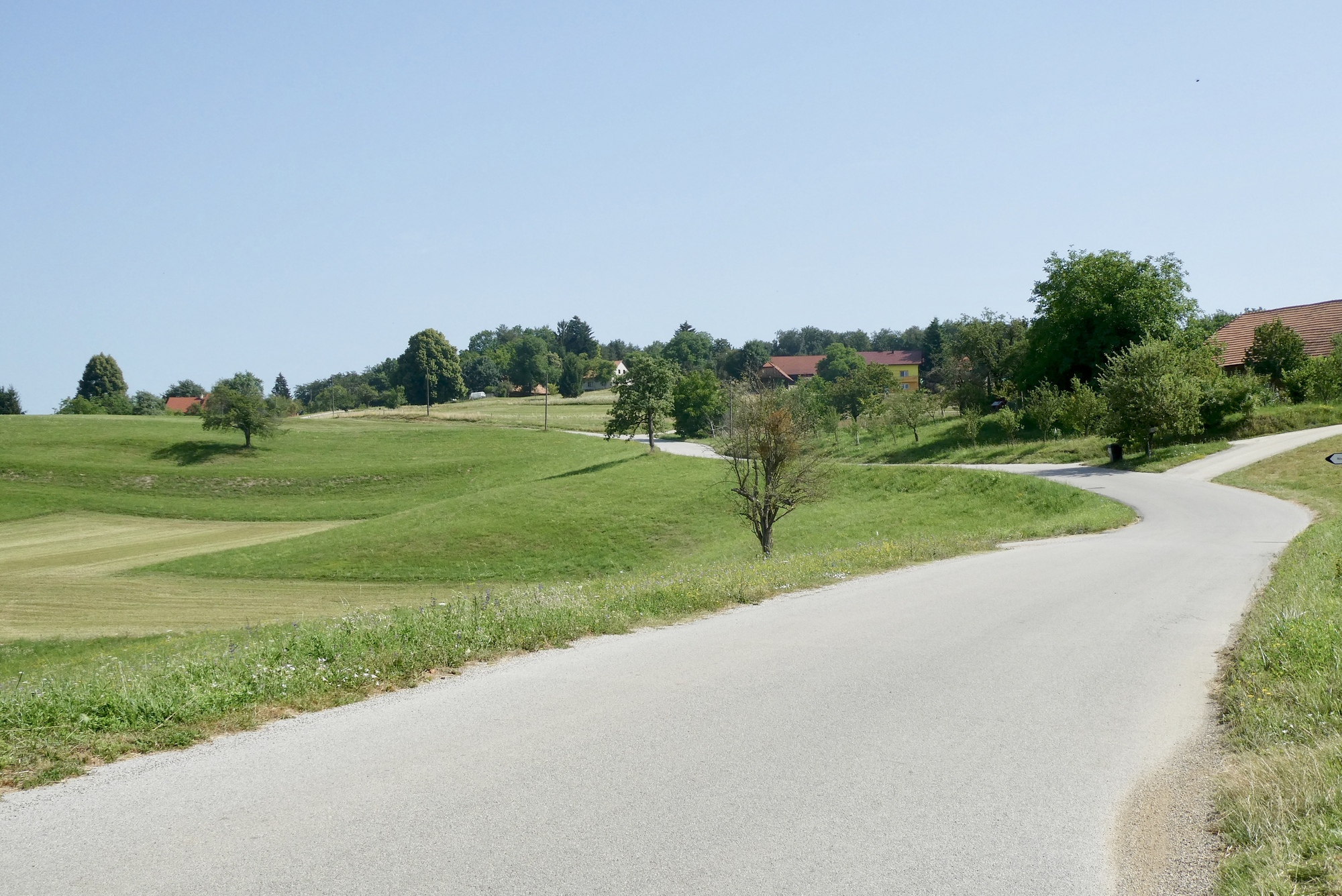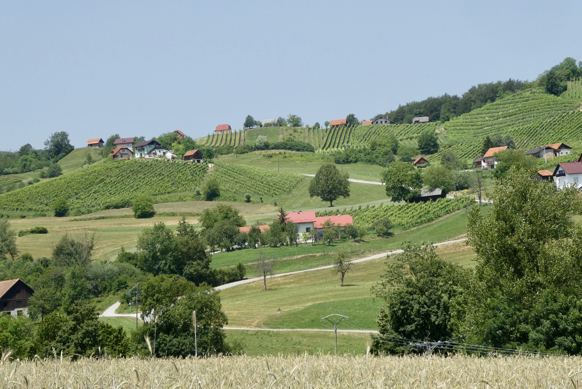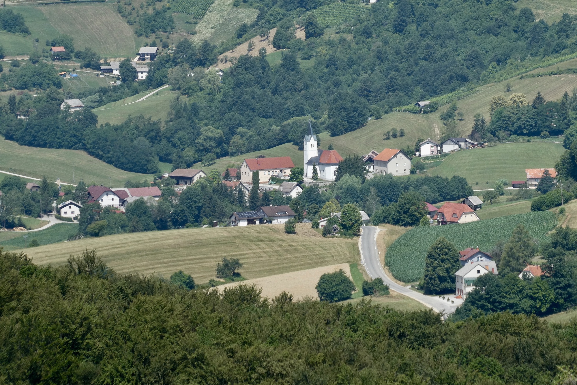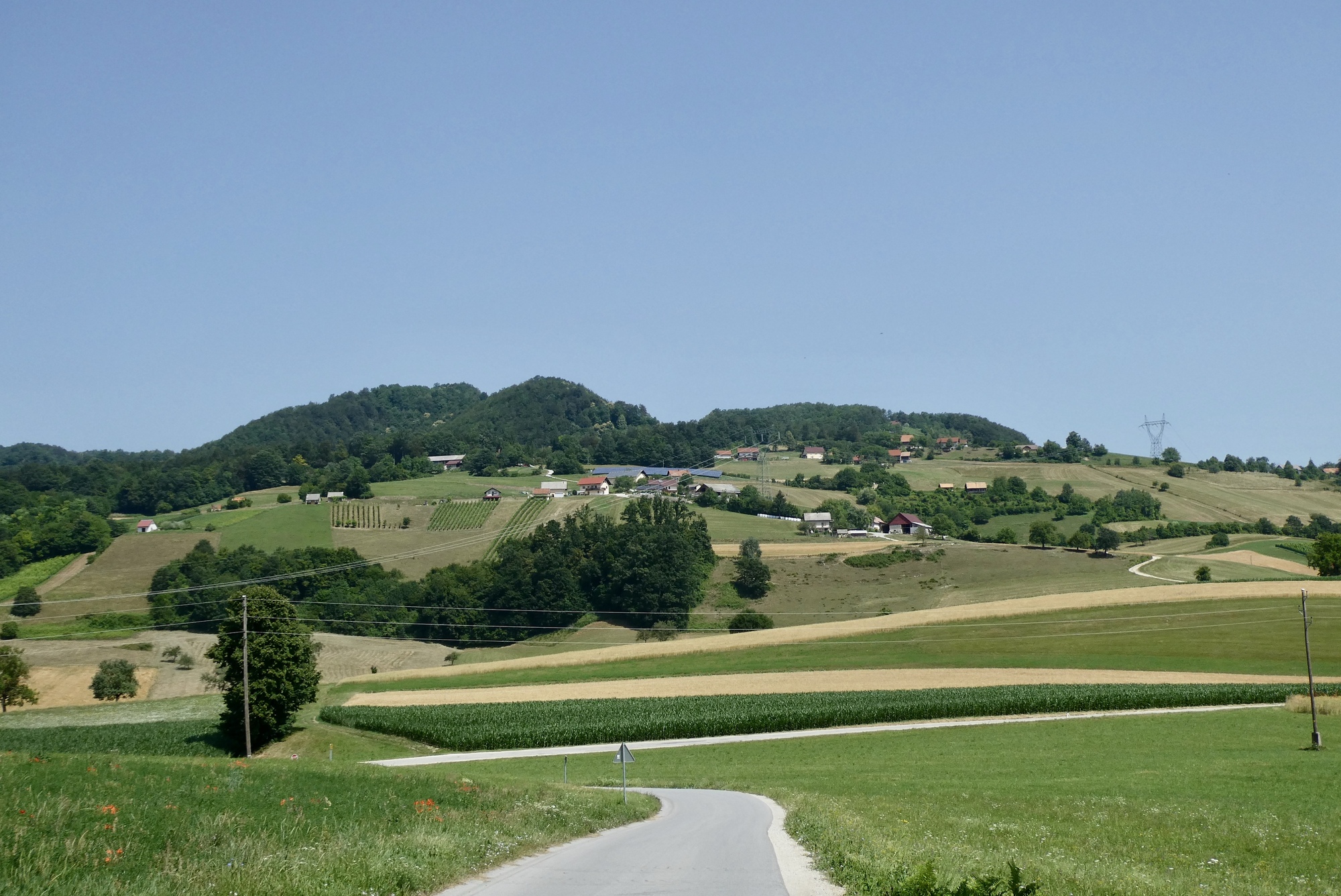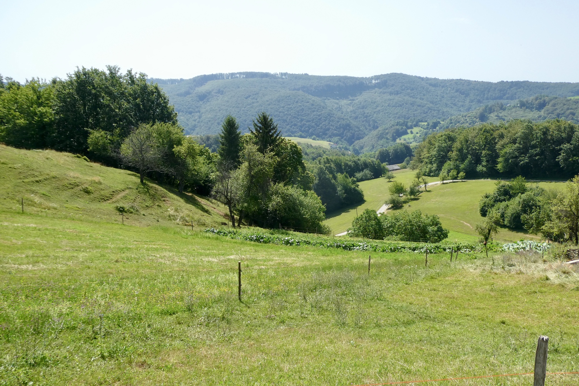The first few miles were pleasant riding as I left the Sava River Valley and began wending my way through the lower hills. From then on, the ride was mostly up, with some terrifying downs, and delightful stretches in between. The scenery was storybook - steep slopes sprinkled with farmsteads and covered with assorted row crops, fruit trees, or vineyards - each a bit different but largely the same. The hillsides steepened as I made my way north, and some sections were brutal, especially in the hot sun. As they day progressed, hike-a-bike and and/or rest stops became more frequent, with almost any patch of shade a welcome excuse for a brief stop.