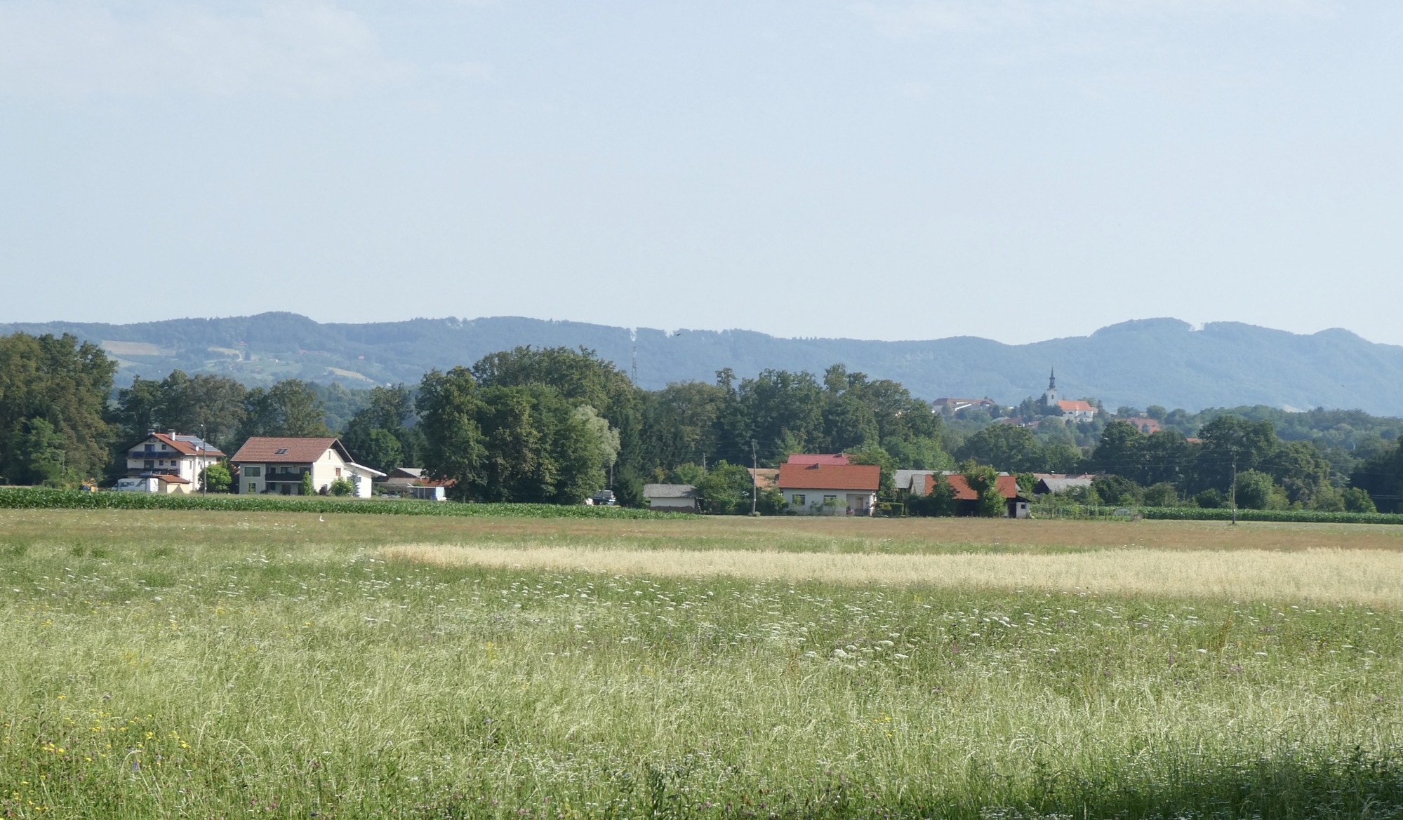 My destination today was Olimje and the Olimje Monastery, a former castle that is now home to Franciscan Friars. The challenge was to find the least painful route through the Sava Hills to Olimje. I could perhaps avoid the worst by taking Hwy 219 that ran up along the Croatian border, but it looked to be a fairly heavy trafficked road. Michaela, of the touring Austrians I’d met in Novo Mesto, shared their route from Olimje to Brežice, with the advice not to use it – and they had e-bikes. If I were to do their route in reverse, it would entail 4430 ft of climbing over 31 mils, with grades up to 29% - no thank you, advice taken. After fiddling around with RWGPS and GoogleMaps Street View, I came up with a route that climbed only 2815 ft over 24 miles, with max grade predicted to be 13.5% - not too bad. Of course the X-factor was the heat. Slovenia is experiencing the heat wave affecting much of central and eastern Europe, with temperatures in the above 90°F. I planned an early-ish start to minimize the chance of heat stroke, and rolled out of Brežice at 8:30..