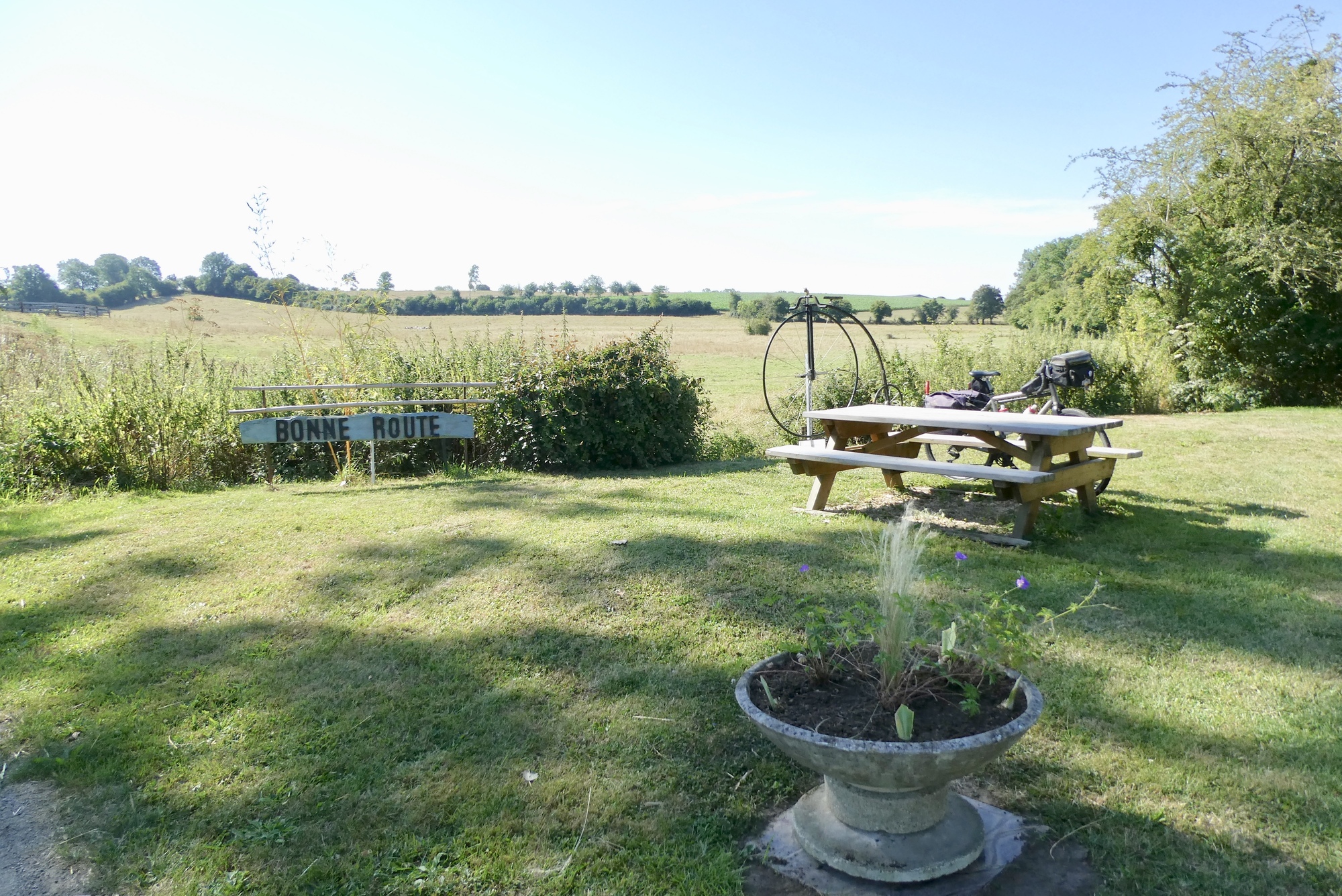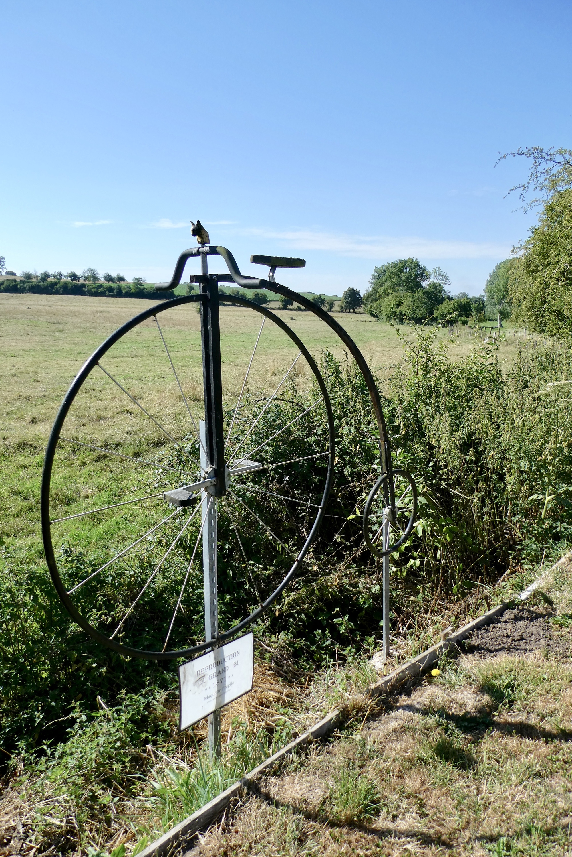 Not far into the day's ride, I passed a large dairy farm and came across a wonderful bicycle rest area, complete with a picnic table and wishes for a good ride. It also had a replica of an 1871 Grand-Bi penny farthing, a bicycle so named for the two coins, the Penny and the much smaller Farthing, that, when placed side by side resembled the bicycle.
