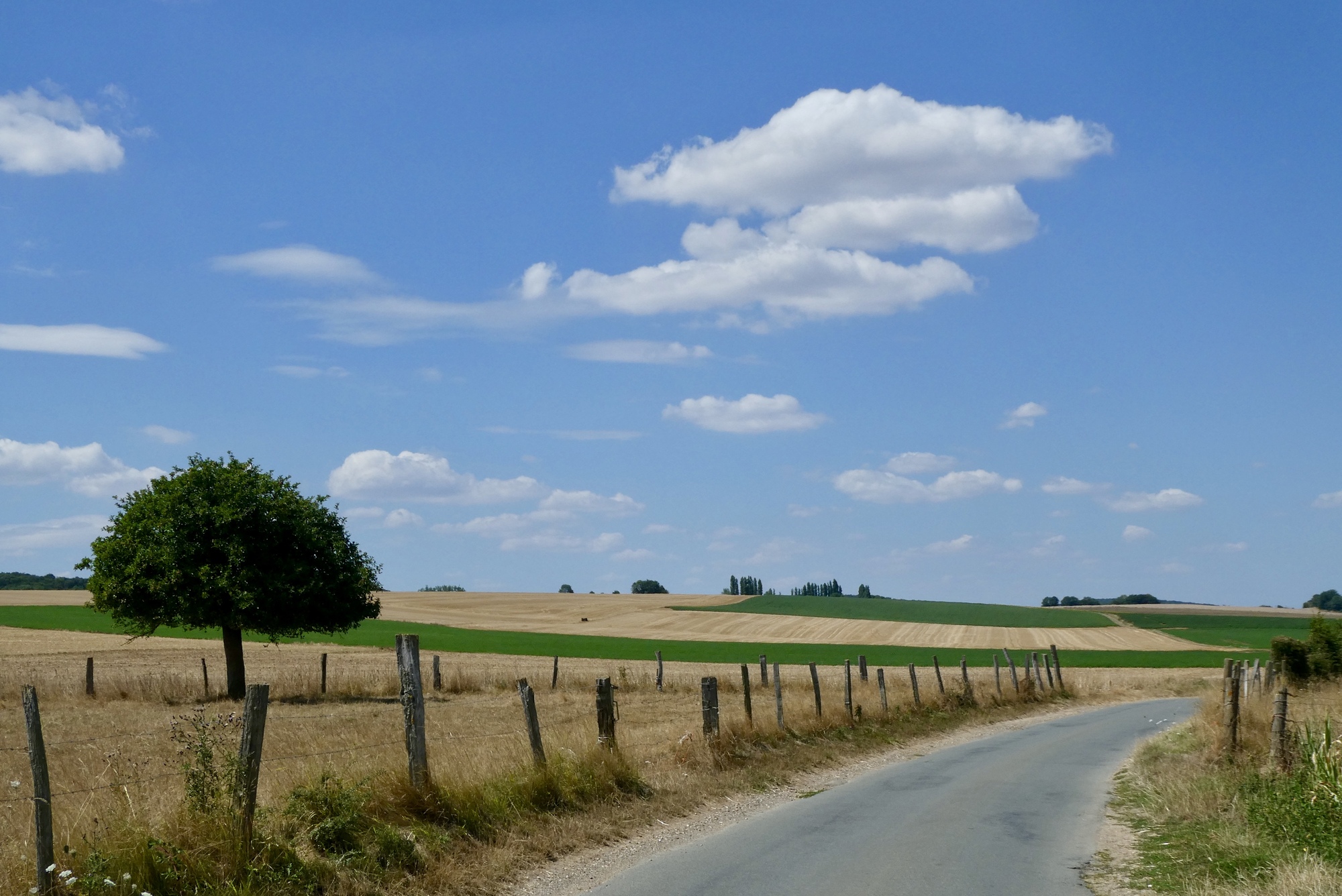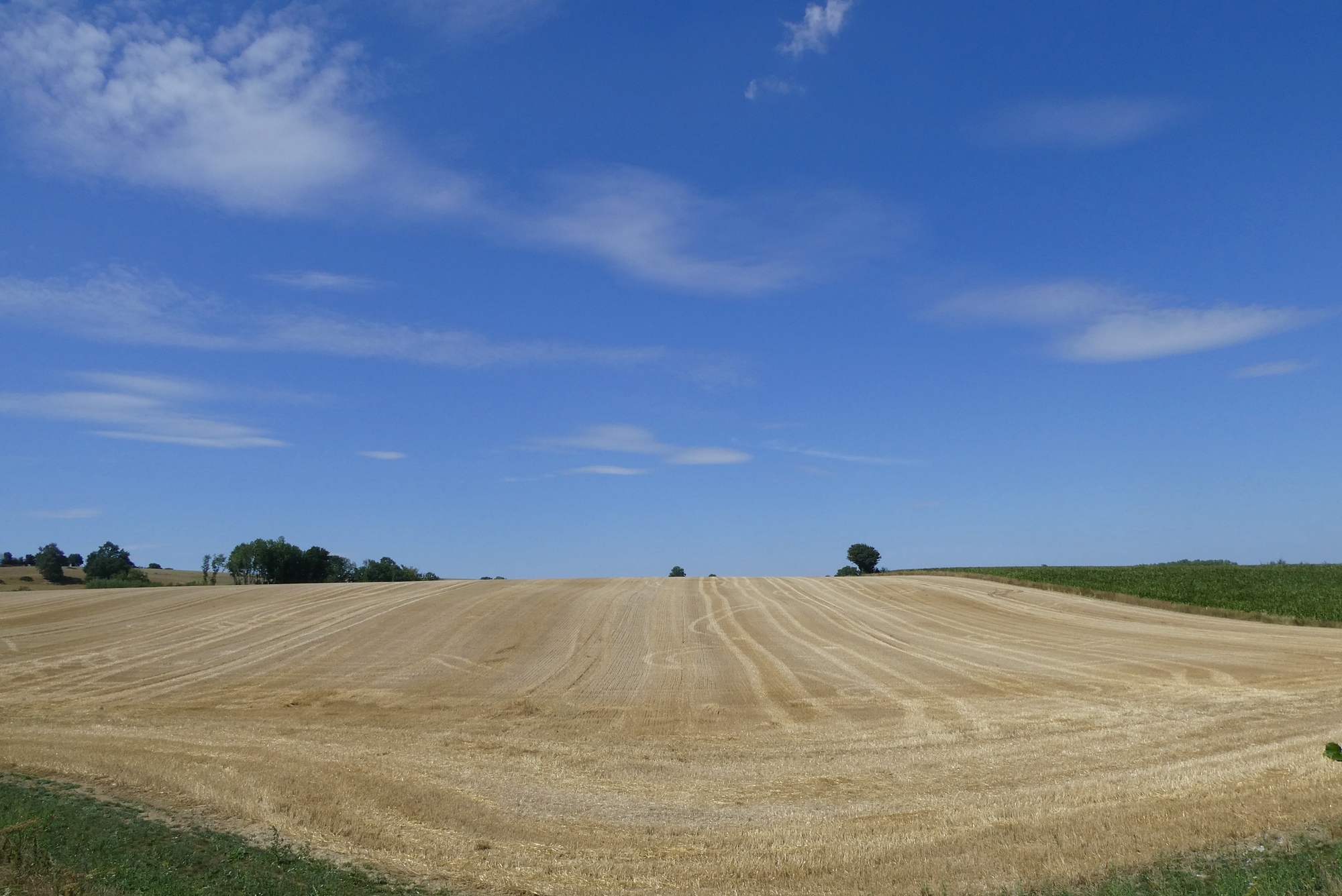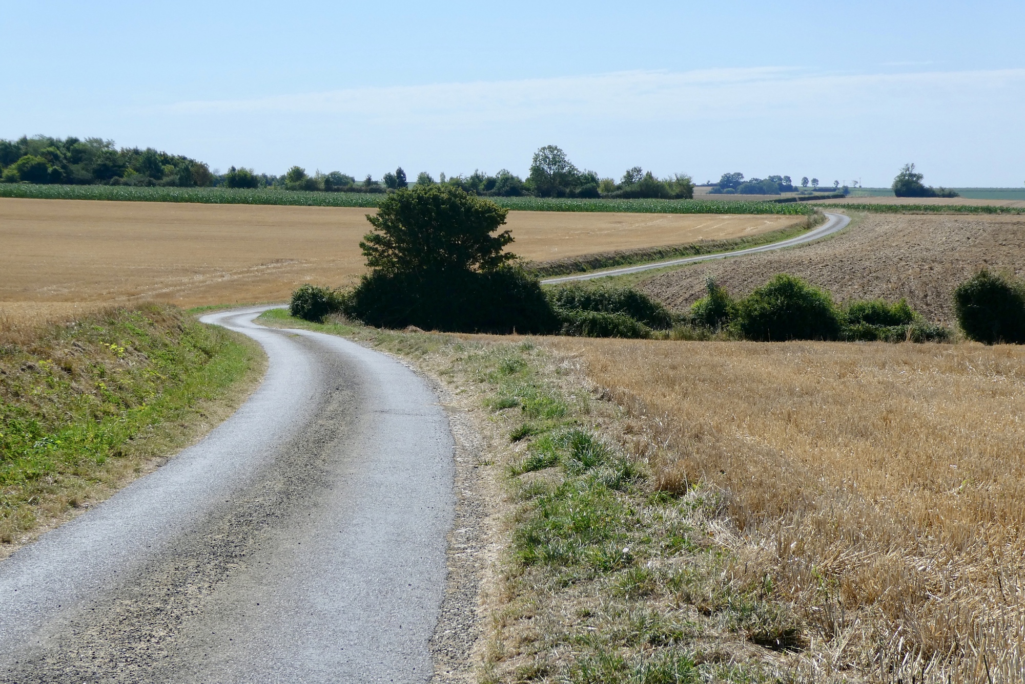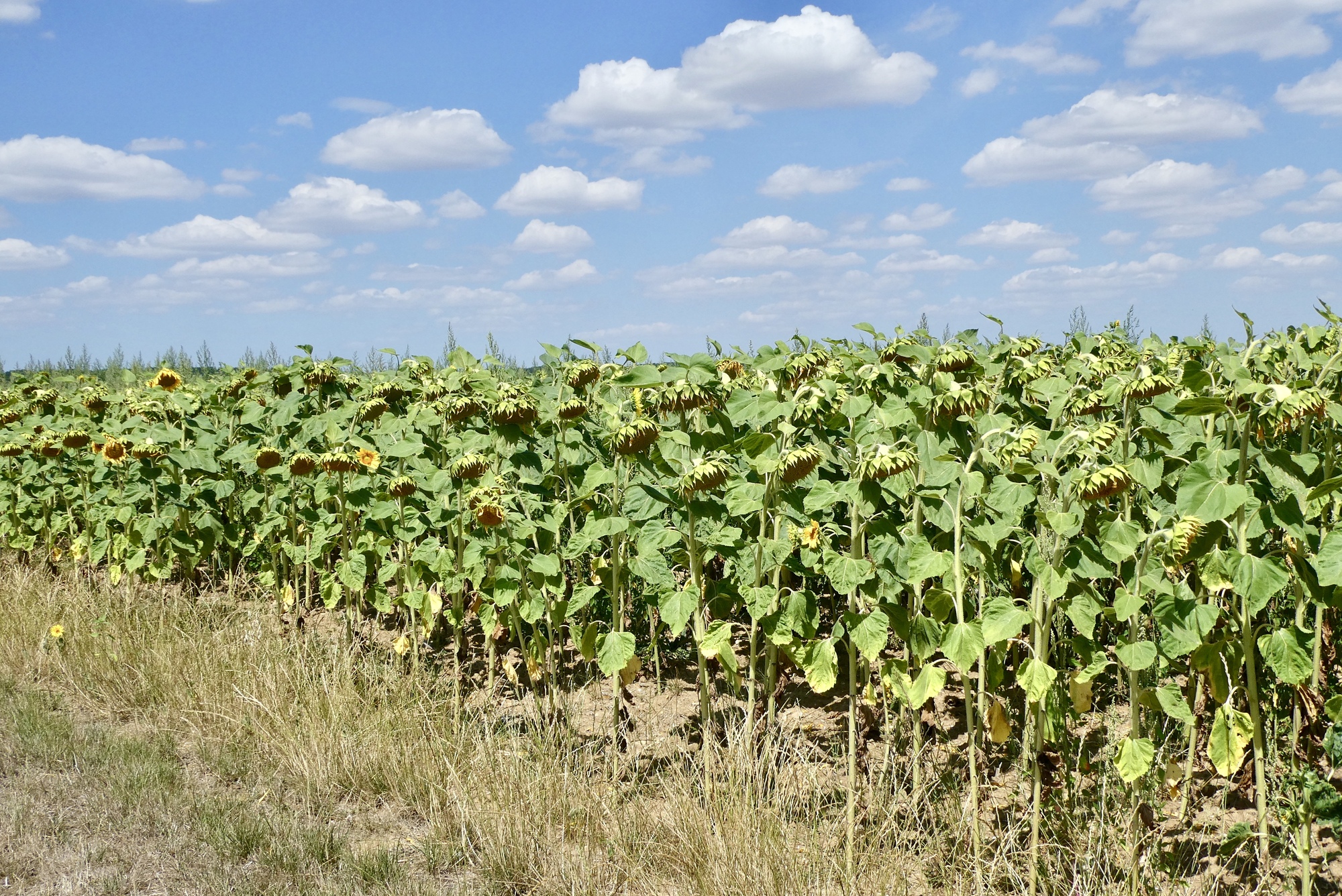 As I continued through the countryside, it was clear that the region has clearly suffered from the high temperatures and lack of rain. I passed fields of sunflowers drooping in bright sunshine and stunted cornstalks with furled or browning leaves. Though not wishing for rain to spoil my cycling adventure, the crops and soil were in need of good soaking.