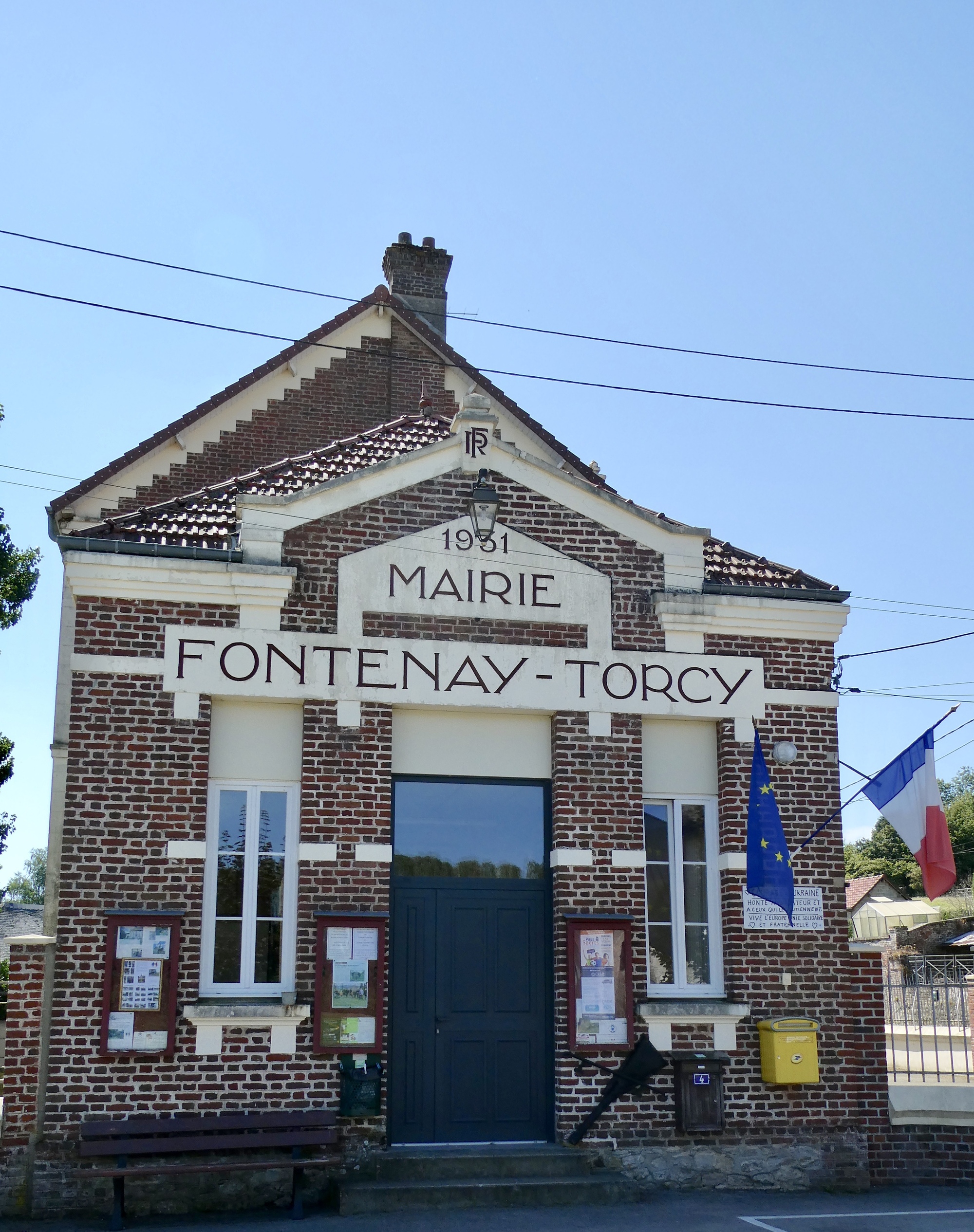 The town hall in the small hamlet of Fontenay-Torcy. They might not have been flying the Ukrainian flag, but the large sign underneath the EU and French flags read " Courage to Ukraine. Shame on dictators and those who support them. Europe united in solidarity and brotherhood"