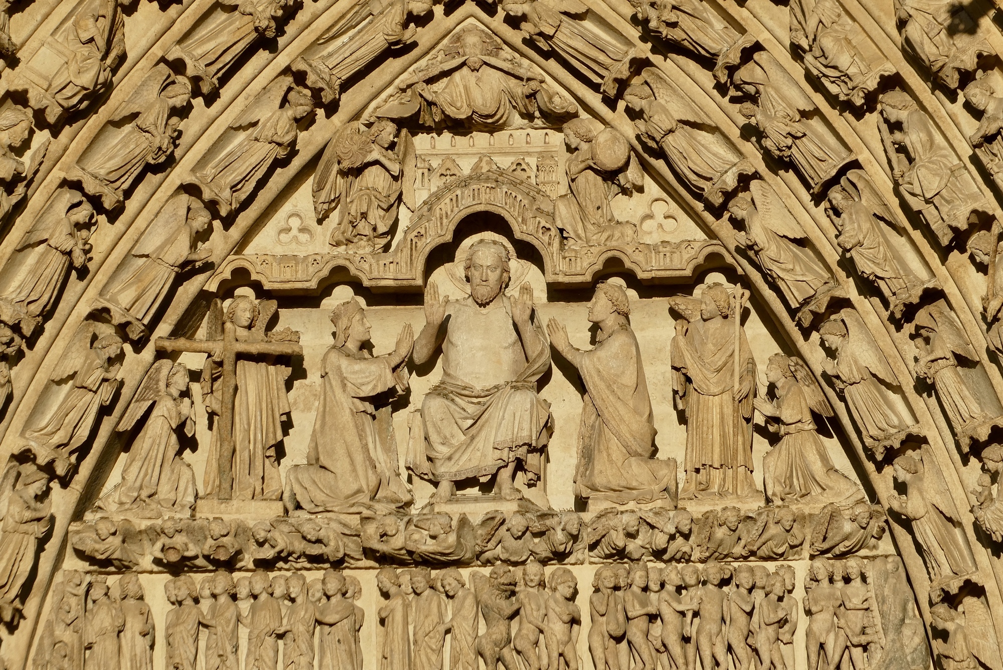 Christ rendering judgement above the central portal, with the Virgin Mary on his right and John the Baptist on his left. Below are the judged, with naked souls being directed to hell by the devil while those blessed are guided to heaven by angels