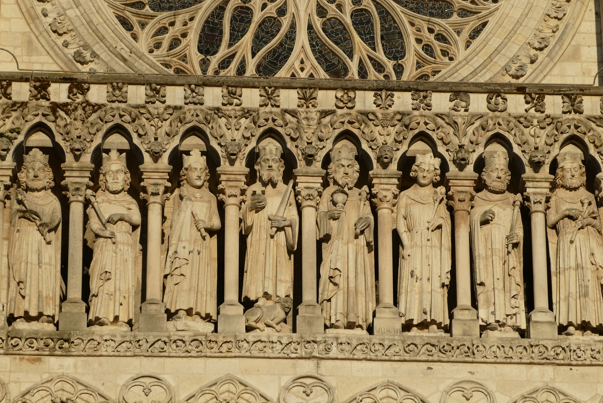 The west façade of the Amiens Cathedral in the setting sun. Above each of the three doors, or portals, are porches with pointed arches and tympanums filled with detailed sculpture. Above the porches are the Gallery of Kings, with twenty-two statues of the Kings of France. A central rose window lies between the two asymmetrical bell towers