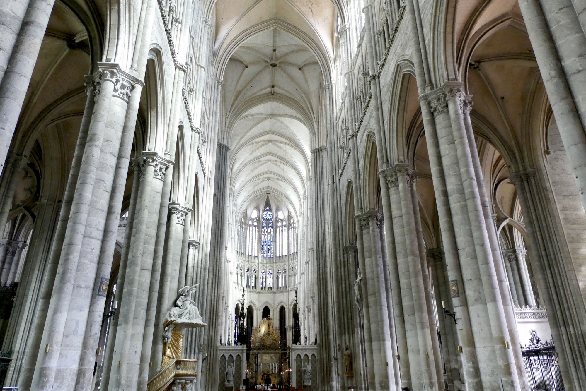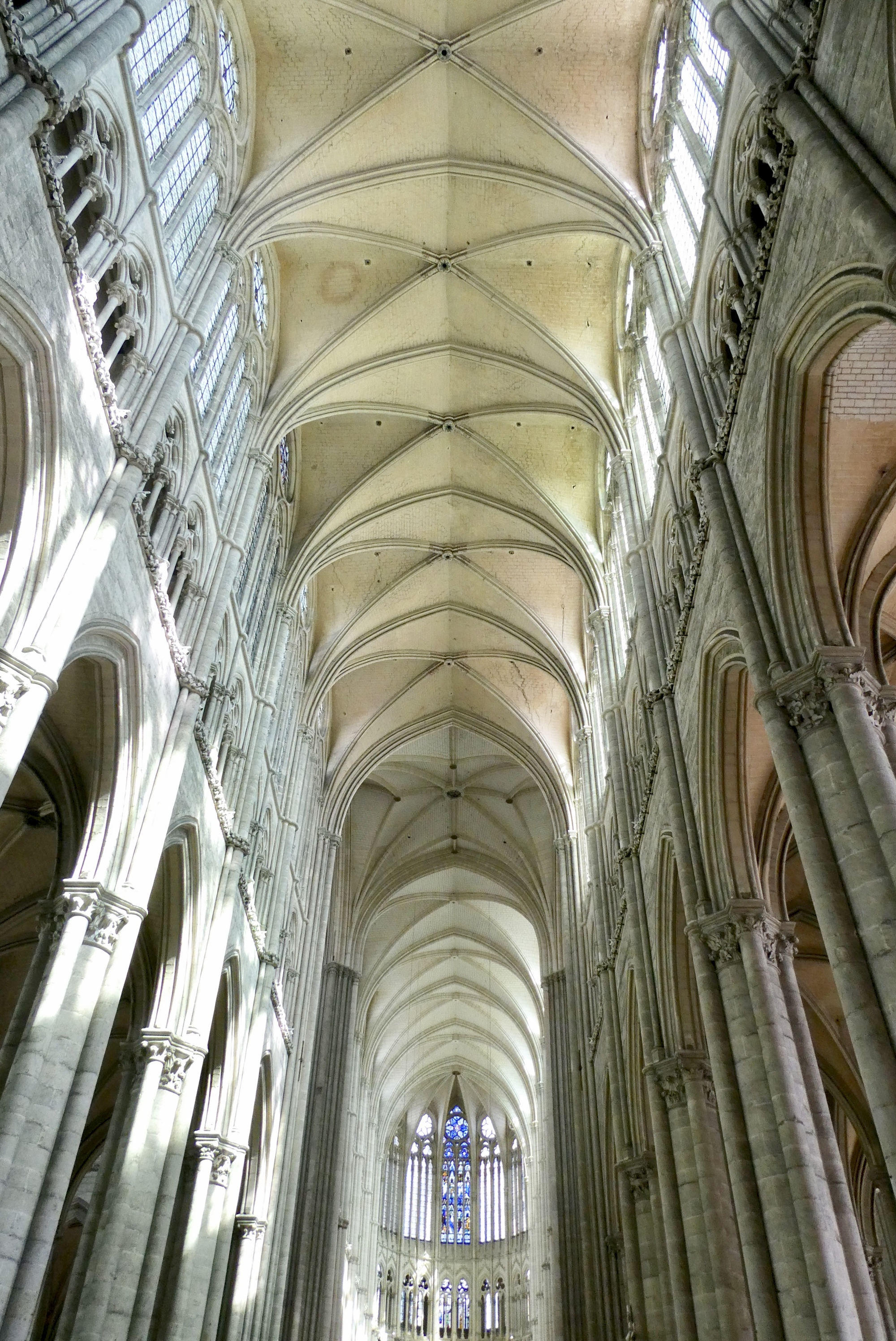 A look up toward the vaults above the nave, giving an idea of the tiered structure and symmetry. The total height of the walls below the vault is 42 meters, and although second in height to Beauvais Cathedral, the Amiens Cathedral did not partially collapse