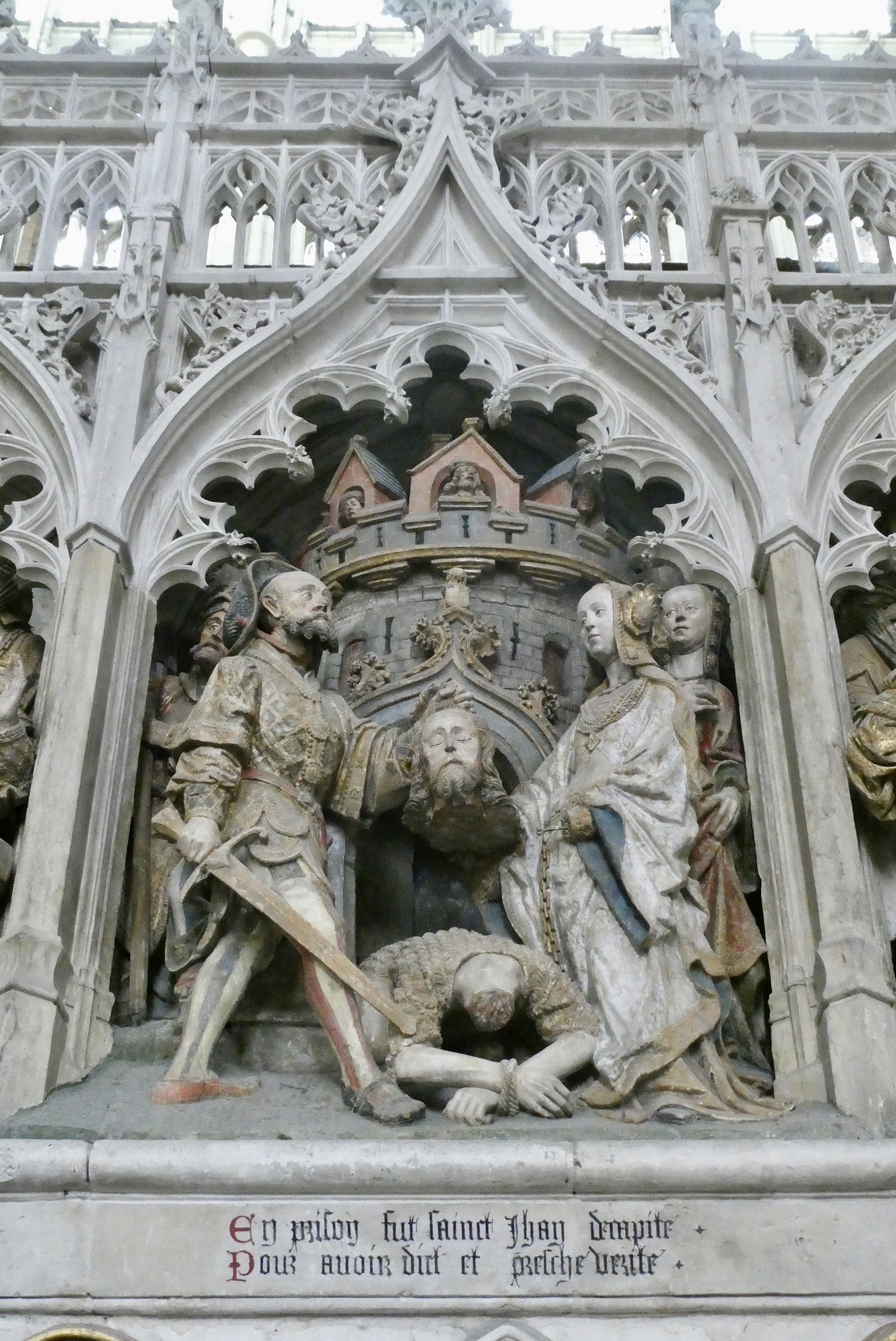 A closer look at the scene depicting the beheading of Saint John the Baptist. The reputed head of Saint John the Baptist was an important relic of the Amiens Cathedral, though the original was destroyed during the French Revolution