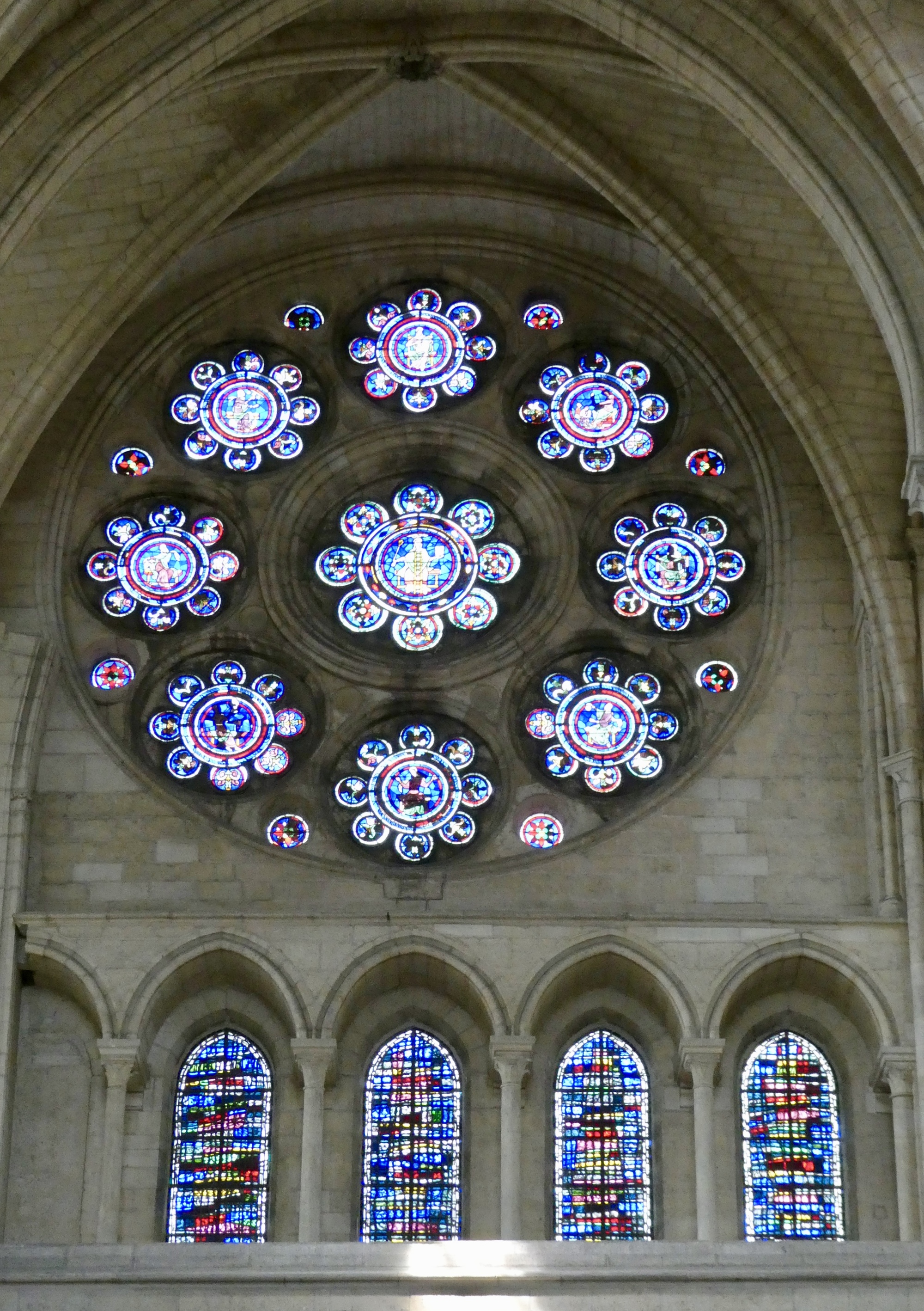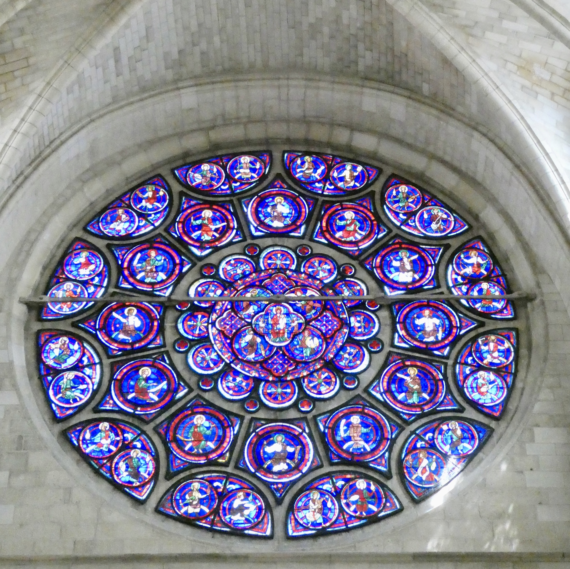 The Rose window in the North transept sits over four lancet windows. Interestingly, rather than a focus on religion, the north Rose window celebrates the sciences of what was once known as the the trivium (grammar, dialectic, and rhetoric) and the quadrivium (arithmetic, geometry, music, and astronomy). Clockwise from the top are: Rhetoric, Grammar, Dialectic, Astronomy, Arithmetic, Medicine, Geometry, and Music, with Philosophy in the center. https://www.therosewindow.com/pilot/Laon/Nrose.htm