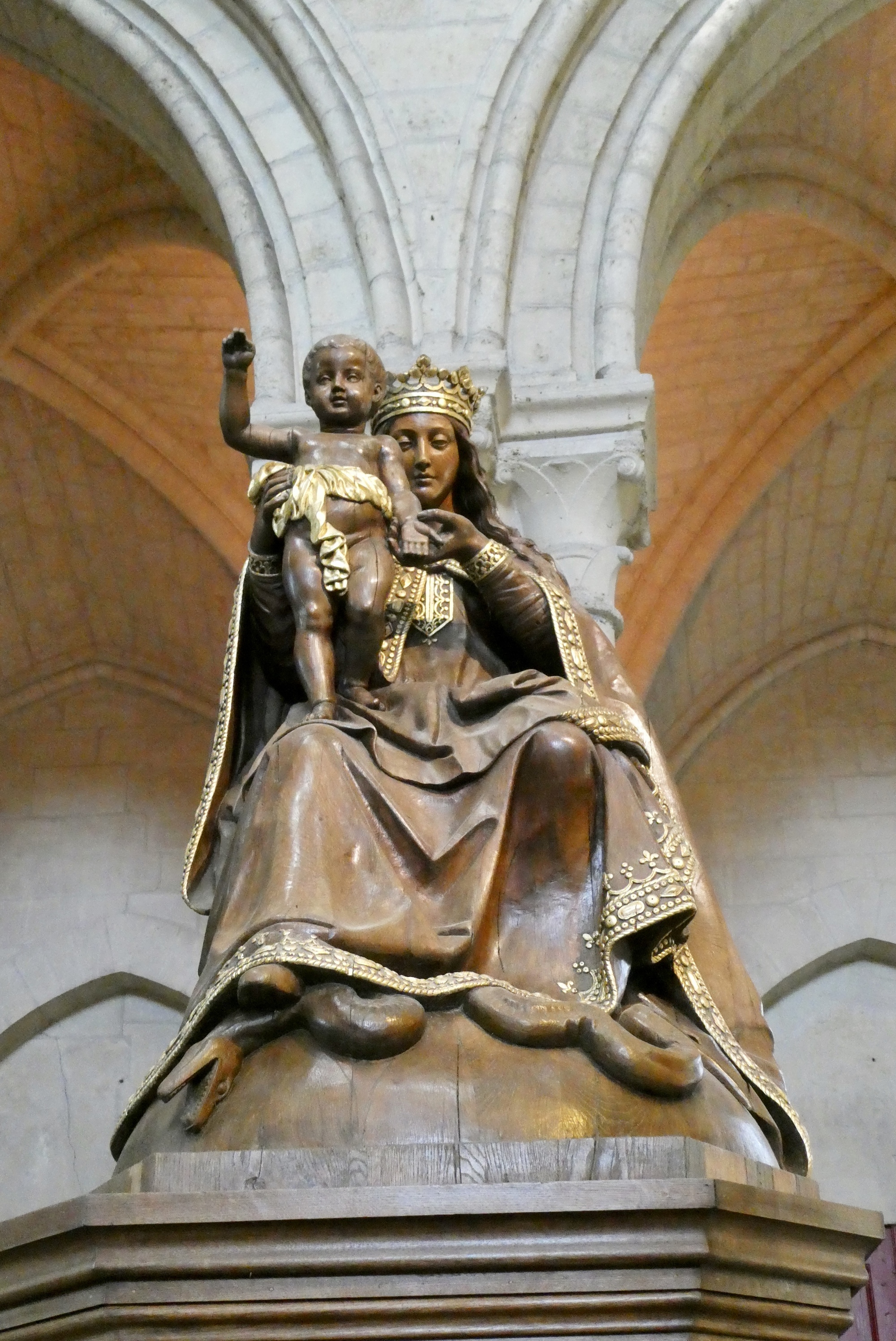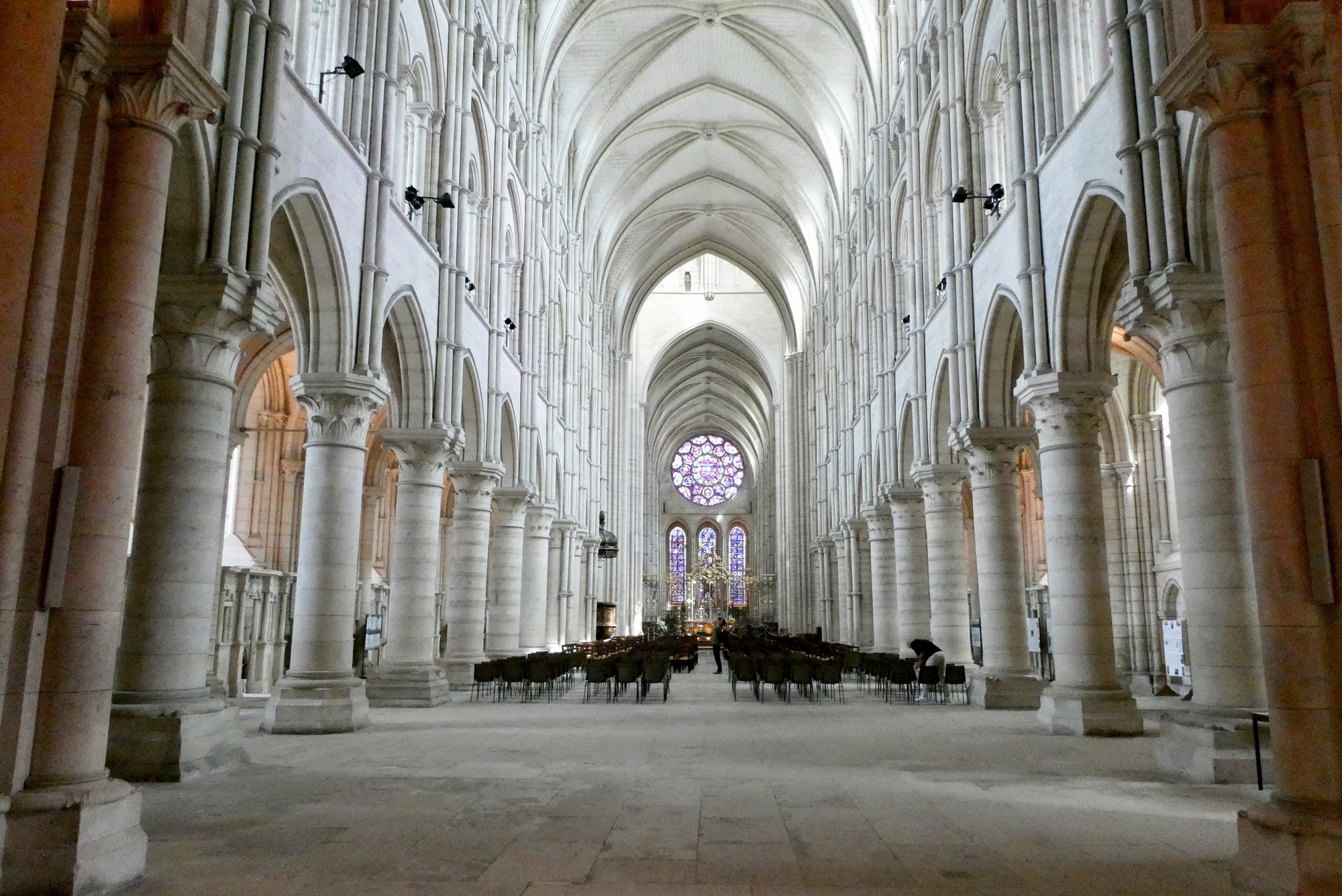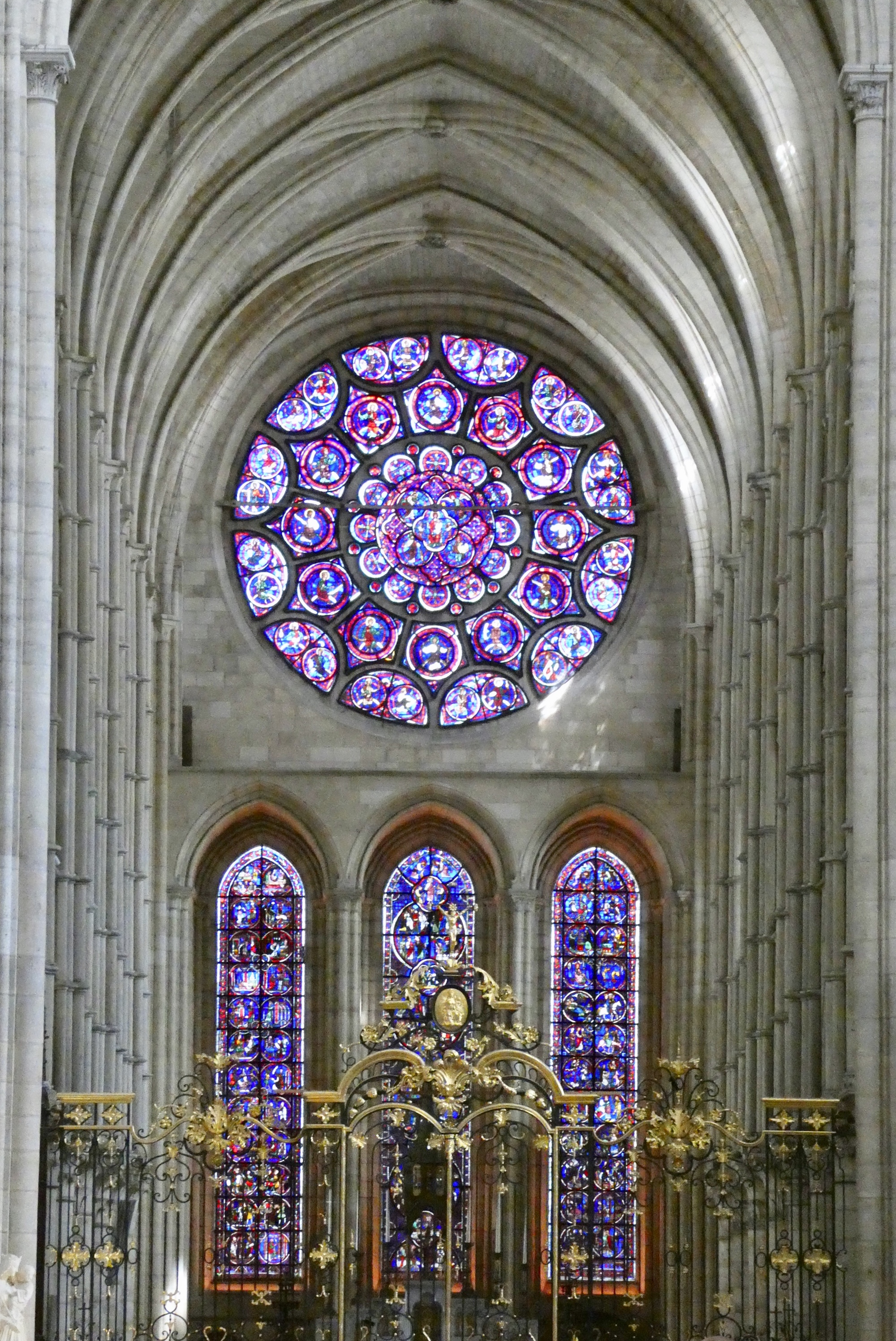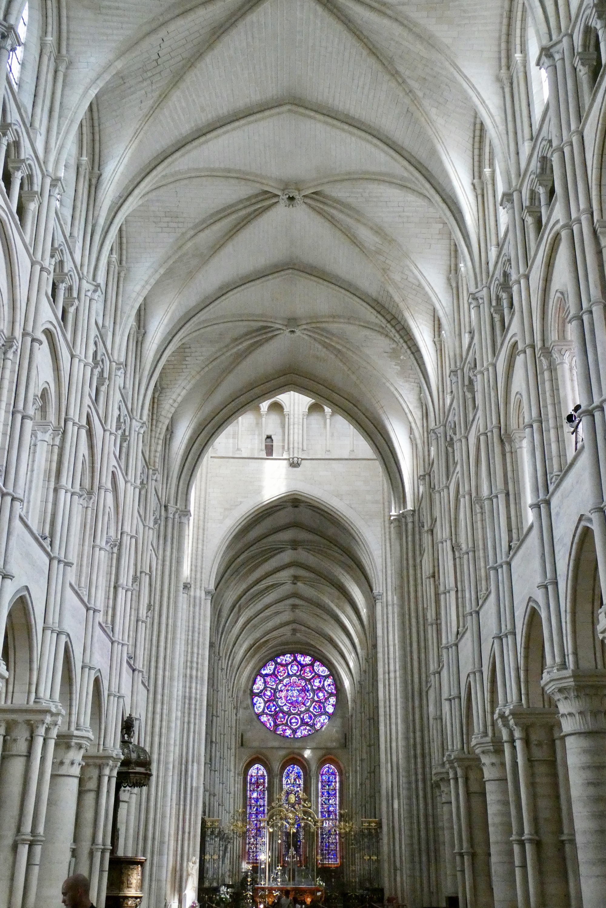 An unusual feature of the Laon Cathedral is the absence of an apse. The original apse was demolished in the 13th century and was replaced with an extended choir that ends in a flat wall. Also notable is that much of the stained-glass is original, with beautiful Rose windows dating from the 13th century.