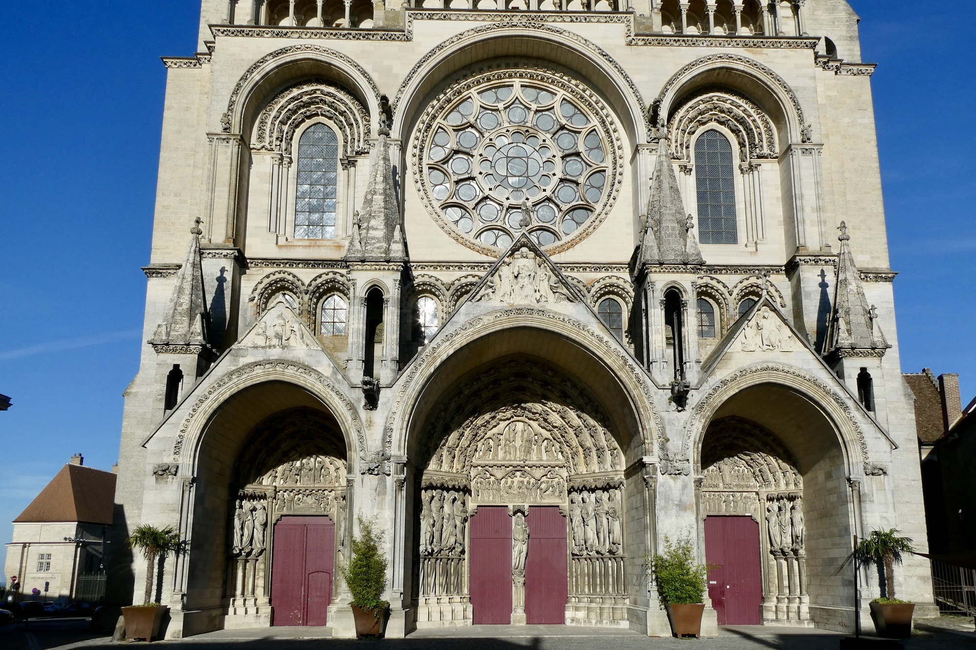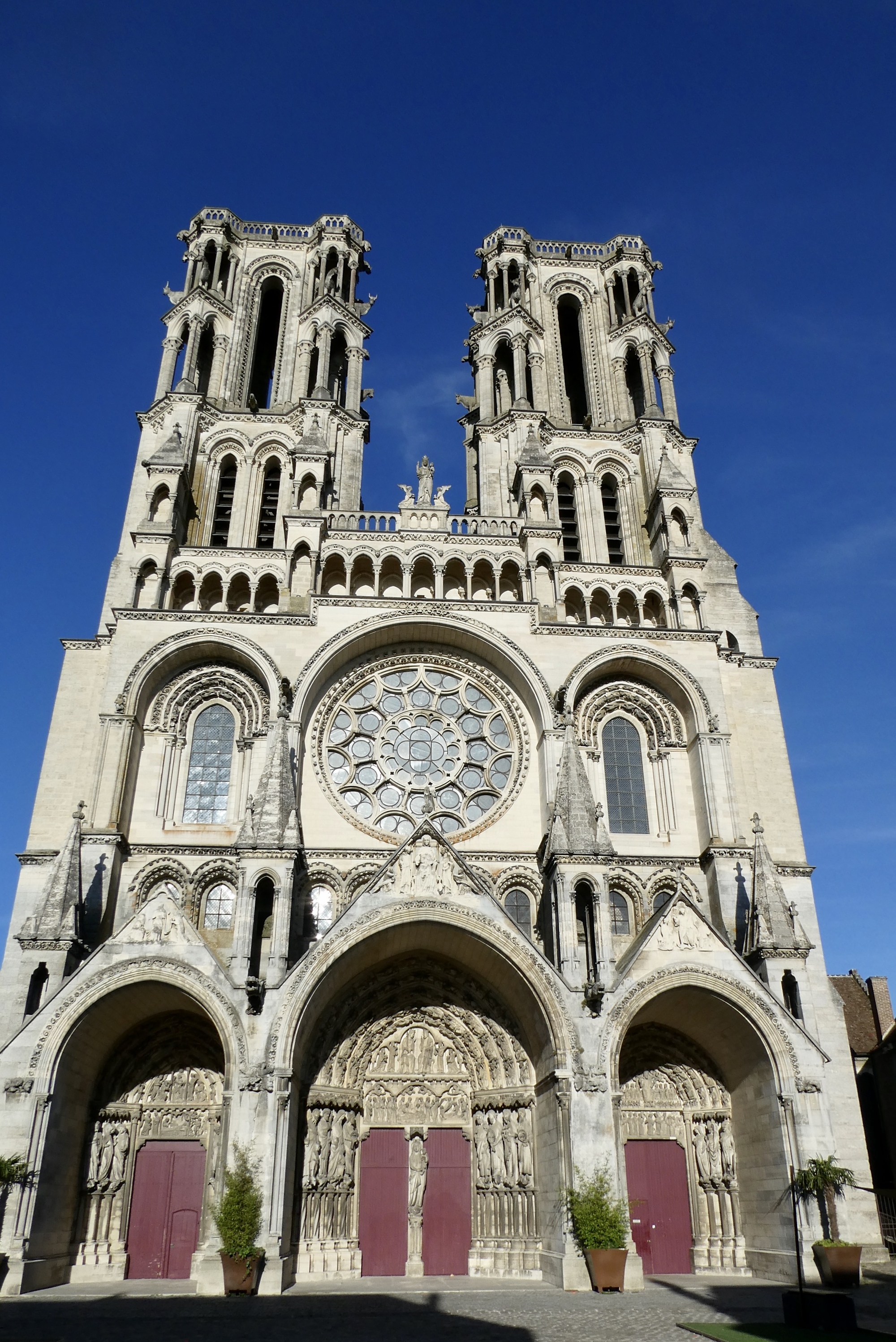 The west facade of the Laon Cathedral, with three portals and twin towers. Though the three red portals are reminiscent of Amiens Cathedral, neither the sculpture on the typmanums nor the design of the towers is as detailed/intricate. The towers are, however, notable for the 16 life-size sculptures of bullocks
