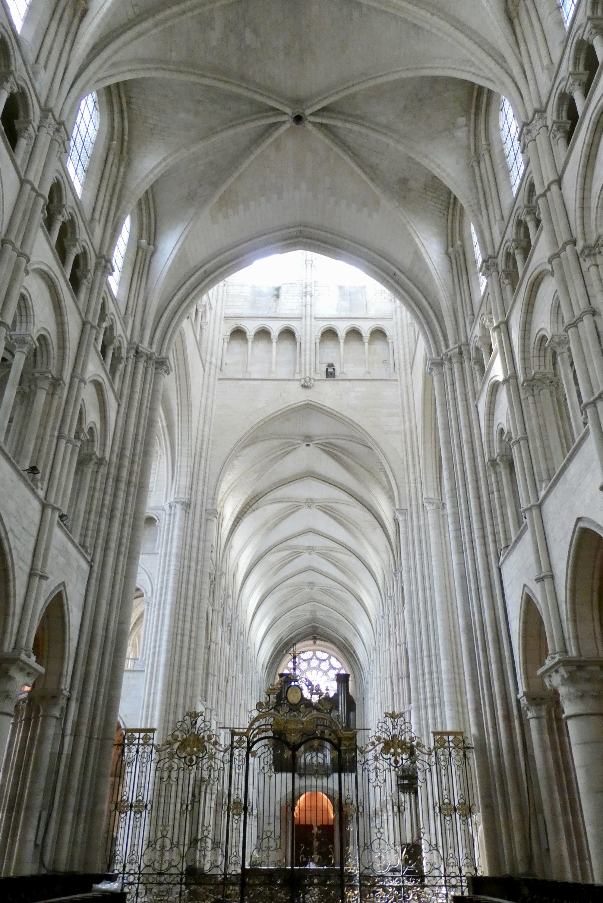 The interior of the Laon Cathedral, looking east to to the choir and east end. To me, the spaciousness of the interior, due both to light and the white stone, was one of the remarkable features of the Cathedral. It may be paradoxical, but I found the spaciousness to be quite comforting.
