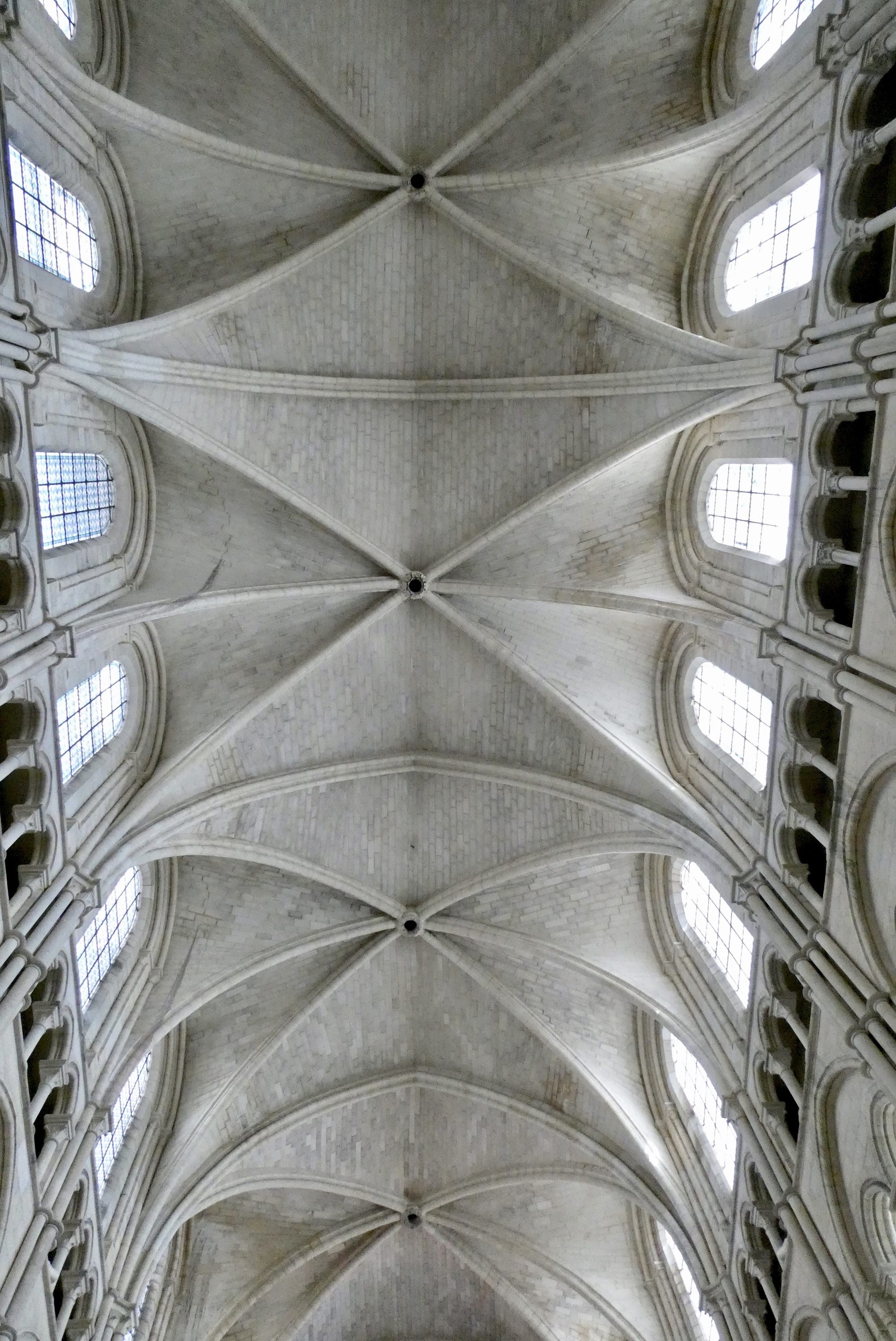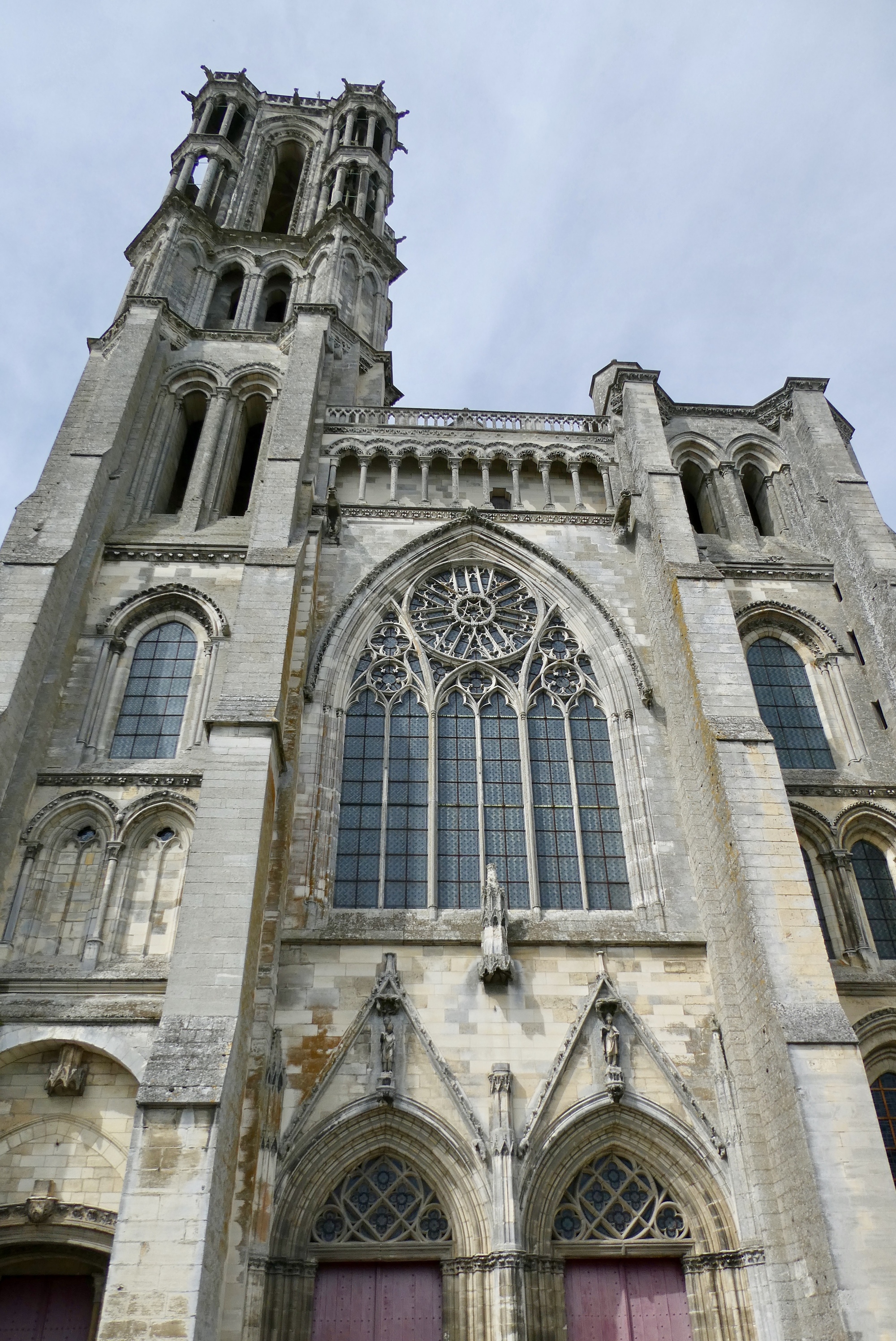 The Laon Cathedral has a typical cruciform shape but is unusual in that there is no apse - instead the extended choir ends in a flat wall. There are five towers, two at the west front, one at the end of each transept, and a small lantern tower over the central crossing. I found it difficult to get a sense of the exterior due to the presence of adjacent building on all sides except the west end. Consequently, I include an image from the web that might help orient you to the various exterior structures. It certainly helped orient me!