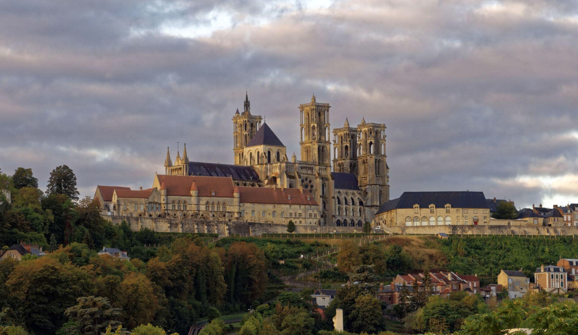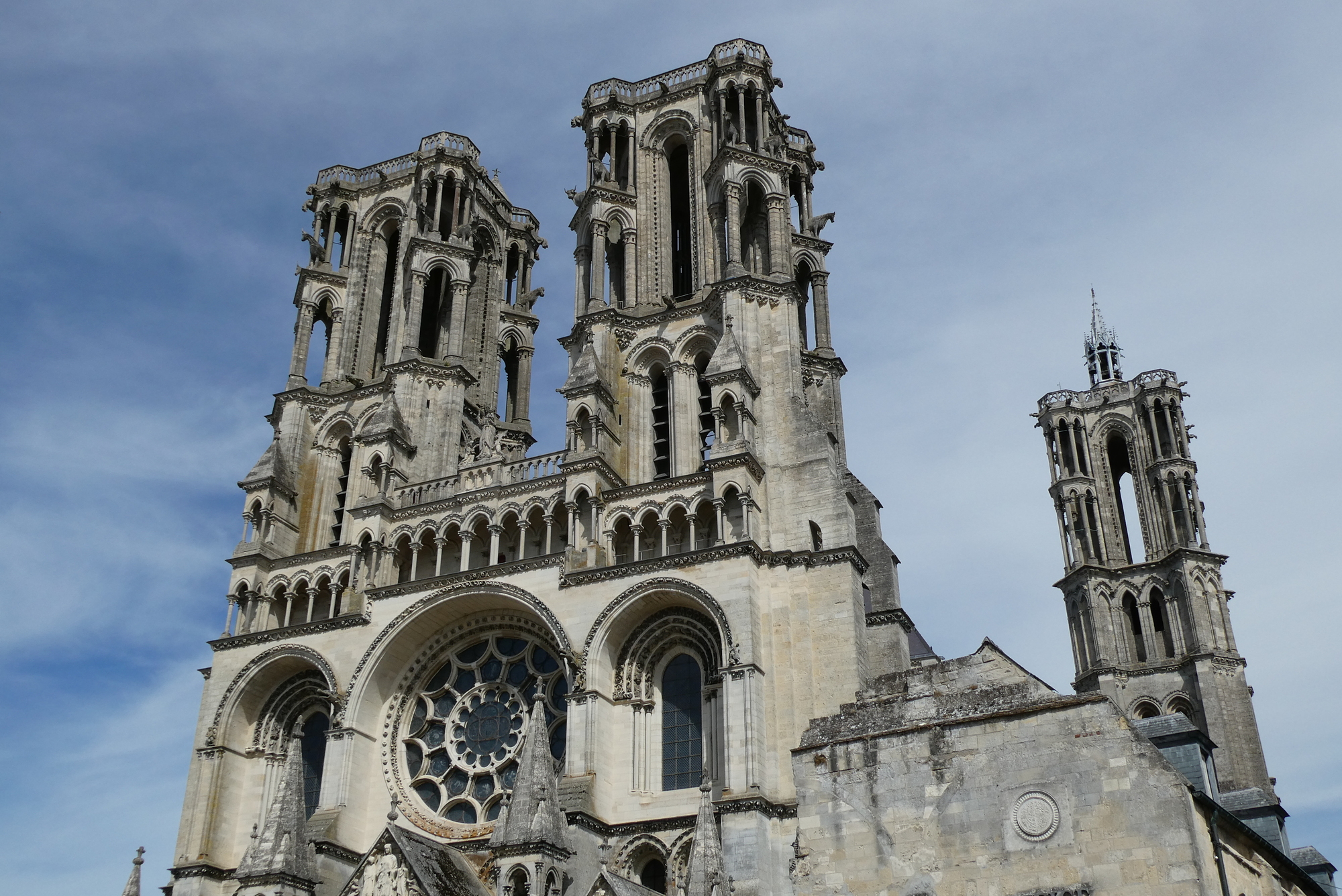 The Cathédrale Notre-Dame de Laon sits atop the city of Laon and is considered an important example of early French Gothic cathedrals. Construction began ~1160 and similar to the contemporary Noyon Cathedral, the Laon Cathedral is considered to have a transitional design that lacks some the ornateness characteristic of later Gothic cathedrals.