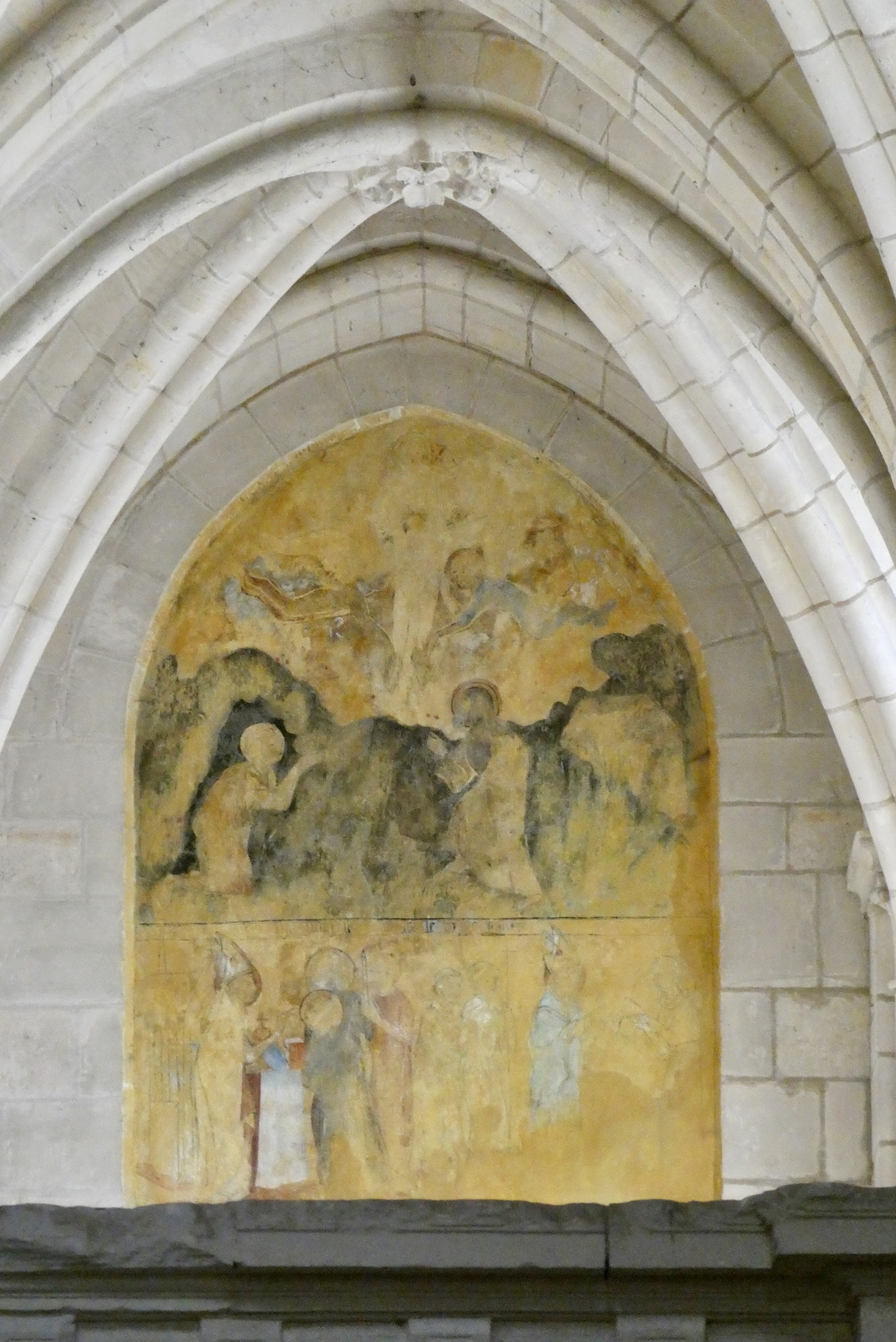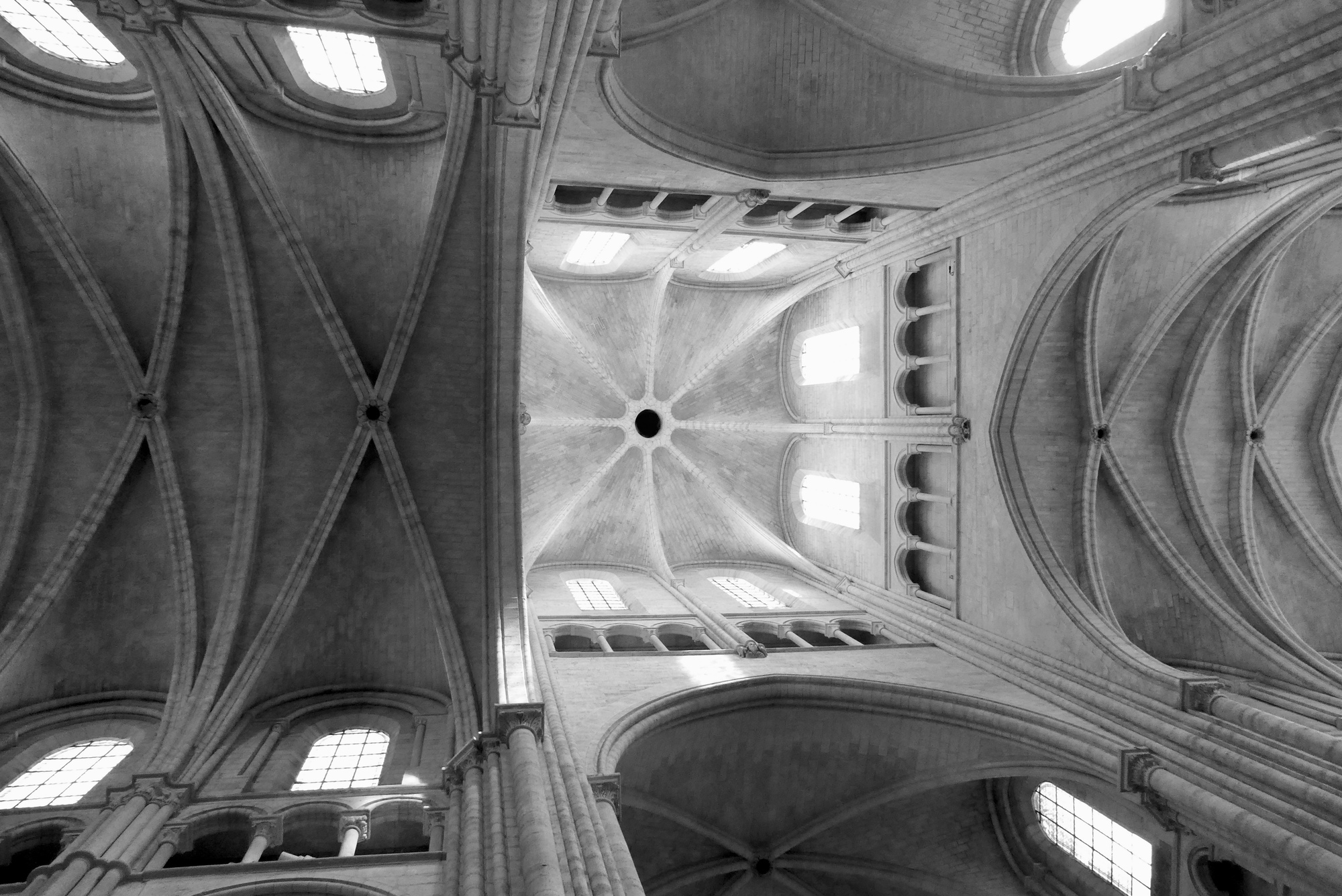 The intersection on the transepts with the nave and choir. The sexpartite square vault is at the center of the intersection, above which is the short lantern tower.