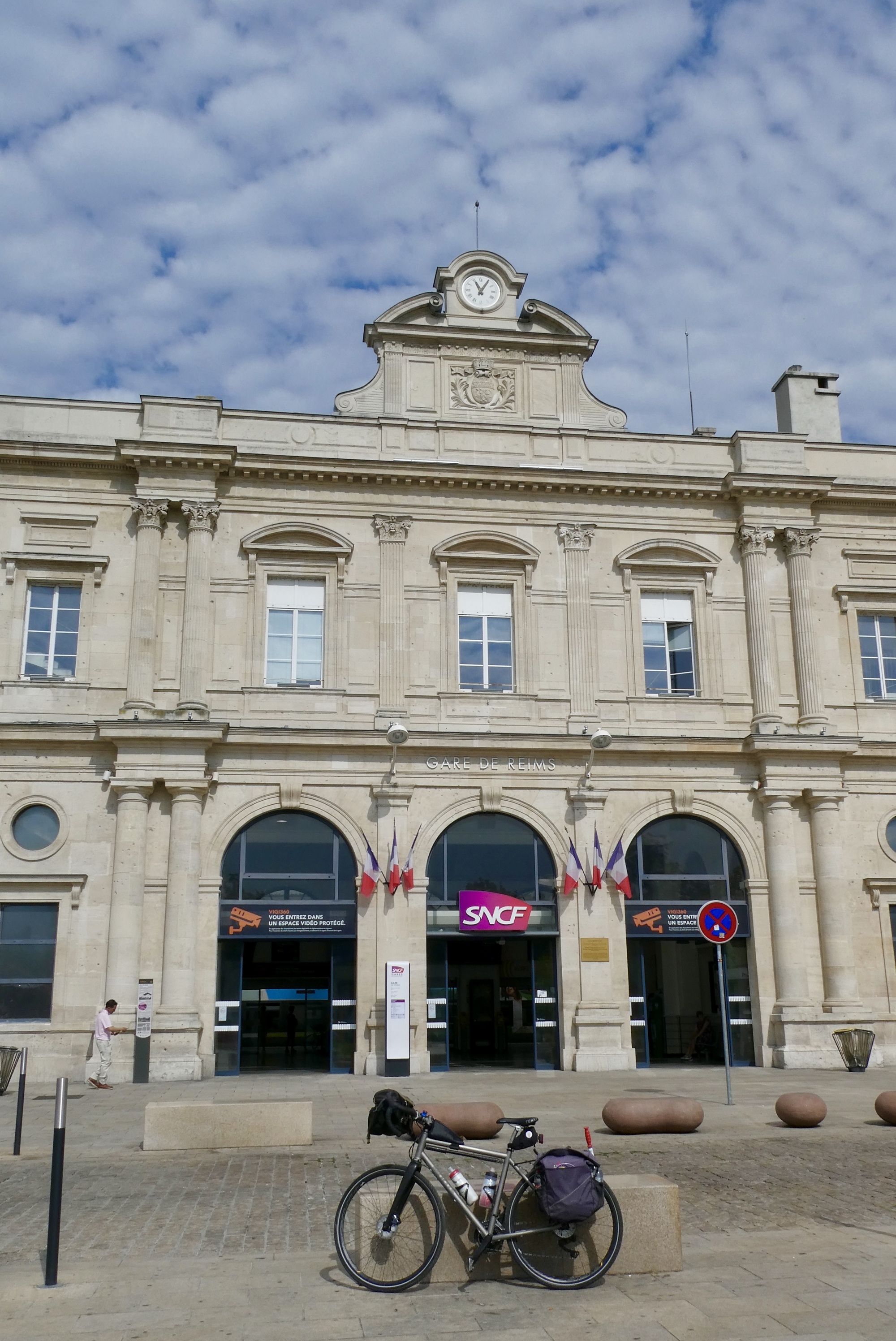 A short two-mile stretch along the La Loivre Canalway led me to D966, one the larger, high-traffic departmental roads that I generally try to avoid. The traffic was moderate but steady, and after a few miles I was traveling through the streets of Reims towards my hotel. Only it wasn’t my hotel. There I stood, slack-jawed with sweat dripping down my face as it slowly sunk in that I had mistakenly entered the wrong hotel into RWGPS. I corrected the mistake, got back on Vivien George, and we made our way to our booked lodging. I collapsed on the bed, finding a bit of relief in the slightly cool room. Eventually I rose, showered and headed out on the town where I enjoyed an early dinner of burger, fries and a chocolate shake. Then it was off to visit the cathedral before turning in for the night.