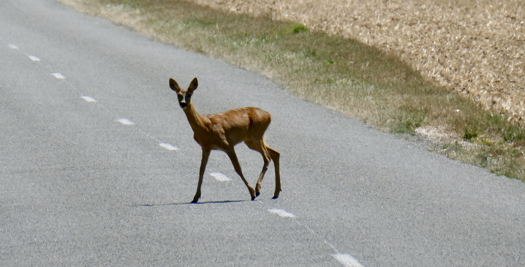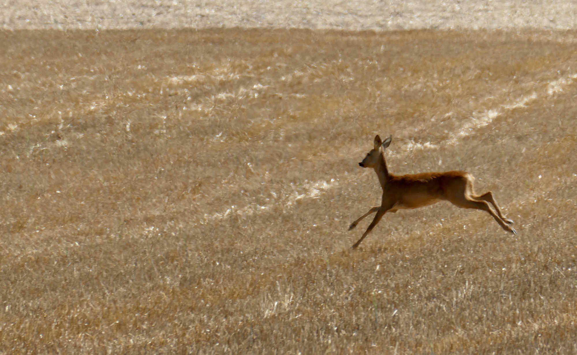 ...and then bounded off across the field, slowing to a walk before entering the woods at the edge of the field. She had a noticeable limp, similar to a deer I'd seen yesterday. I don't know what was more improbable - that it was the same deer, or that there were two individuals with the same distinctive limp. The third possibility was a case of heat-induced hallucination
