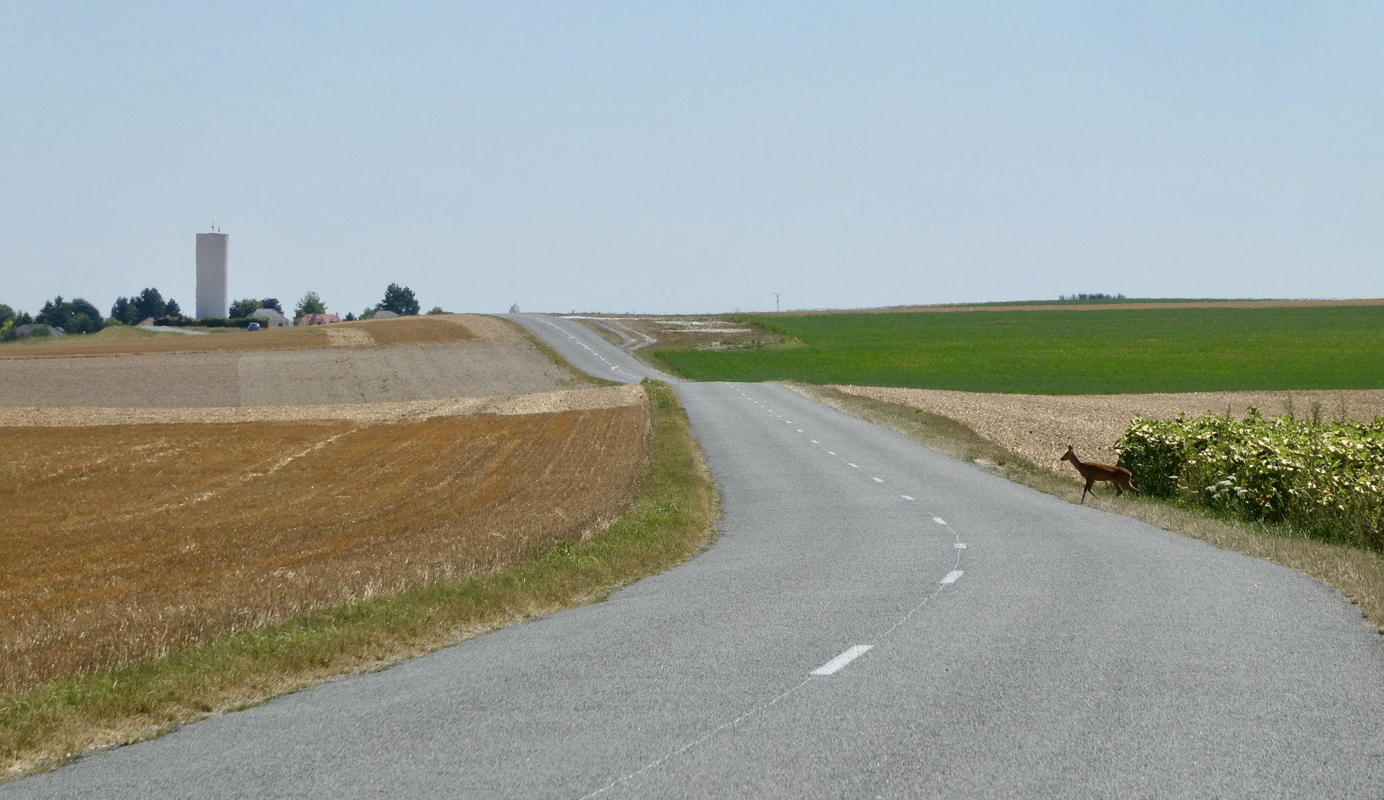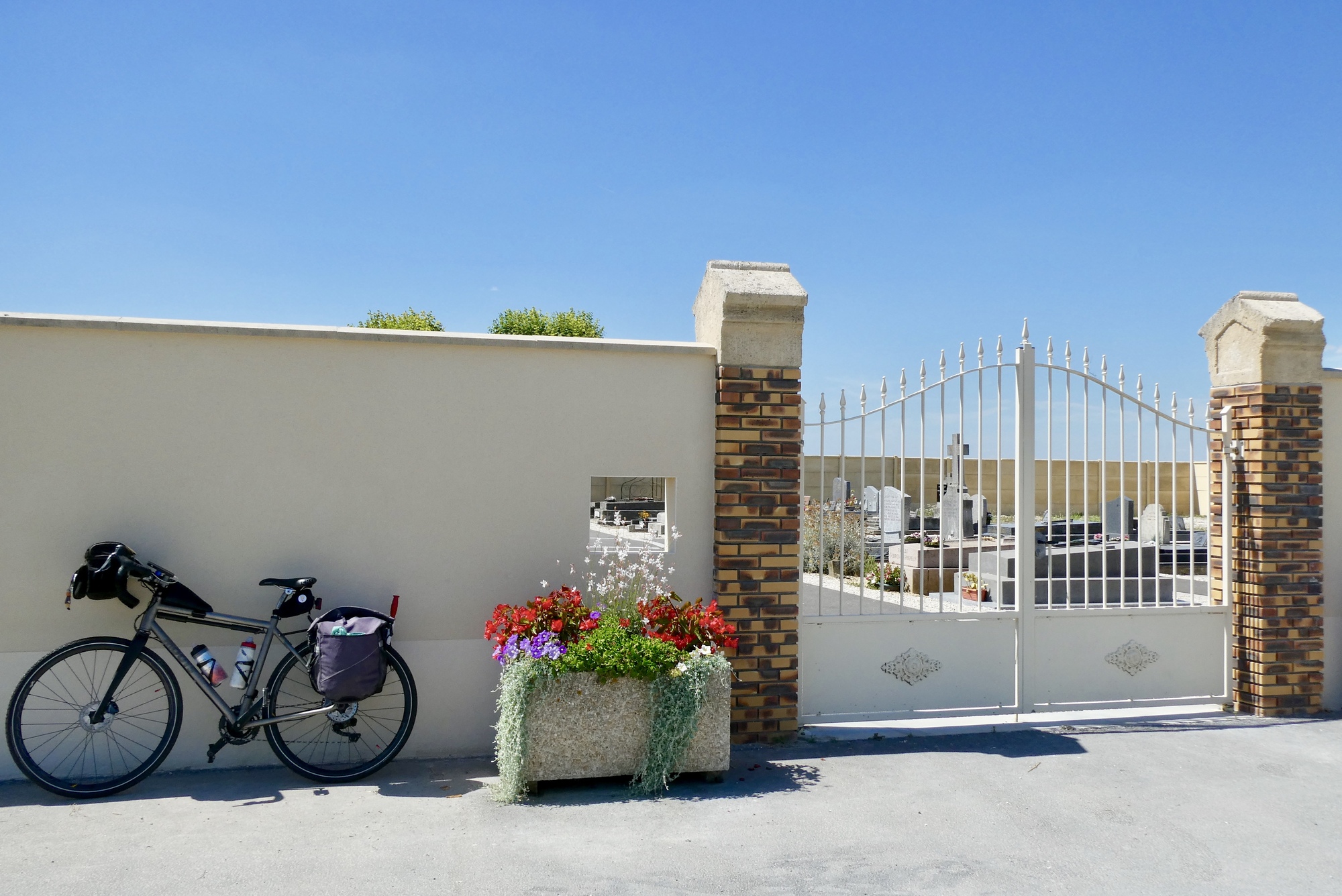 After about twenty miles of enjoyable cycling, I dropped down into an agricultural plain of expansive fields and tall silos. As I crossed under the autoroute and turned south for Reims, the temperatures rose and the landscape became dry and forlorn. I passed through a series of seemingly empty towns in a vain search of a cold beverage. I had high hopes when I rolled into Villeneuve-sur-Aisne at lunchtime – my timing was right and it was one of the larger towns on today’s route. I was so astounded to find both the Carrefour and the Tabac shuttered tight that I actually Googled to see if this was some obscure French holy day – but no, it was just August in France.