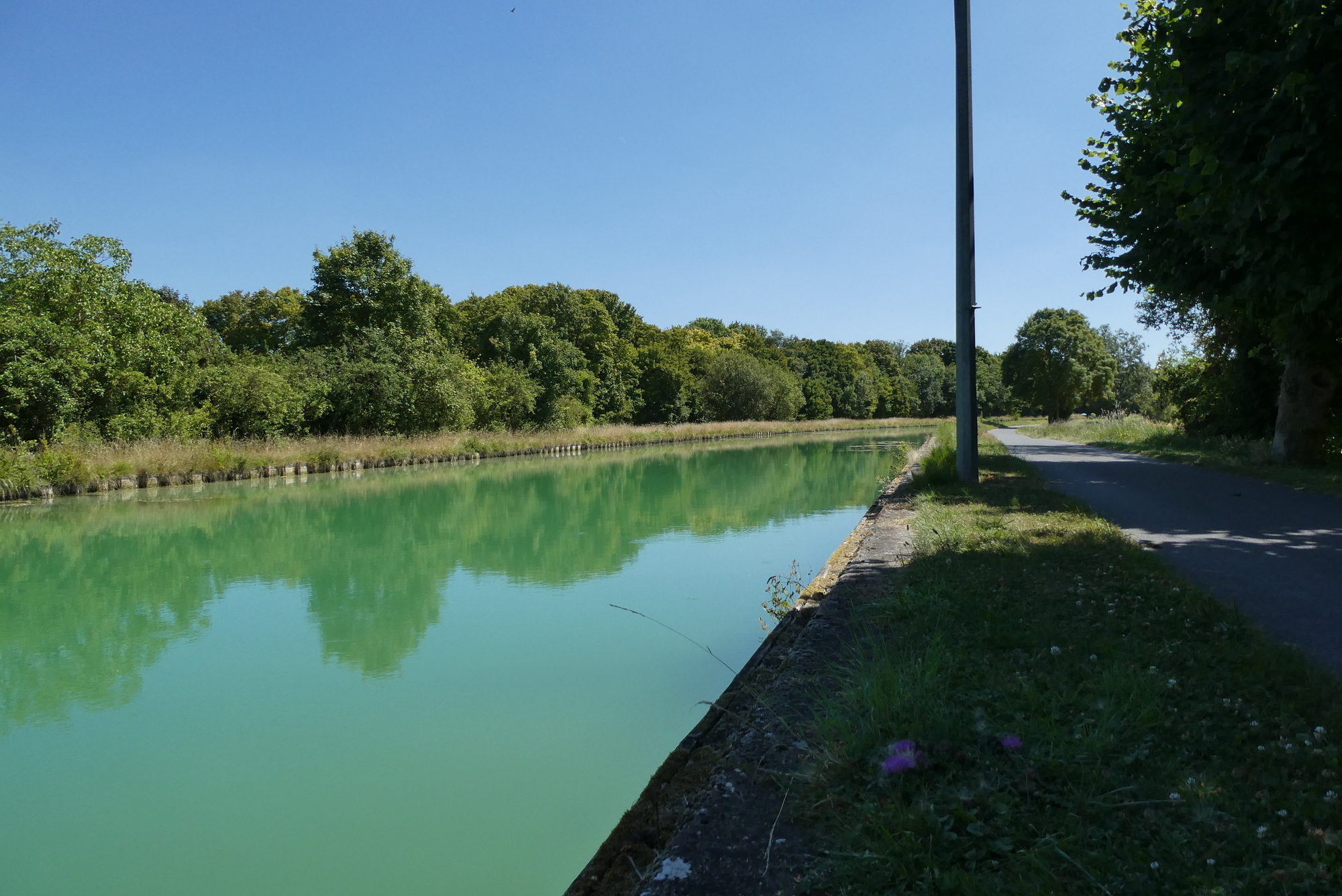 After leaving Villeneuve-sur-Aisne, I crossed the Aisne River and continued south through an arid landscape that was sorely in need of rain. I also was thirsty – nothing near critical but I was craving a cold carbonated beverage. I got a water refill at cemetery outside Berméricourt, and shortly thereafter passed an open bar adjacent to the La Loivre Canalway where I purchased a cold coke and enjoyed the long cold drink while sitting on the edge of the canal watching fish circle in the waters below.