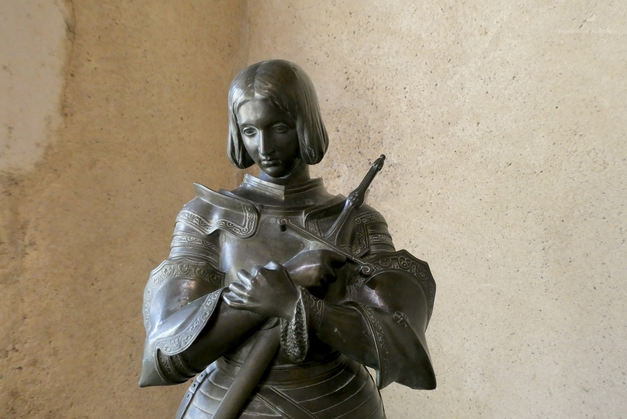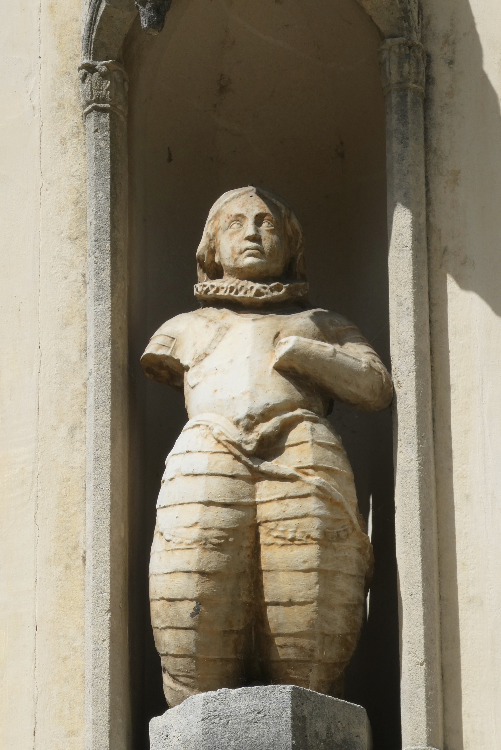 Also above the lintel is a copy the statue showing a kneeling Joan of Arc, the oldest known statue of her. The original statue is behind glass in the adjacent museum