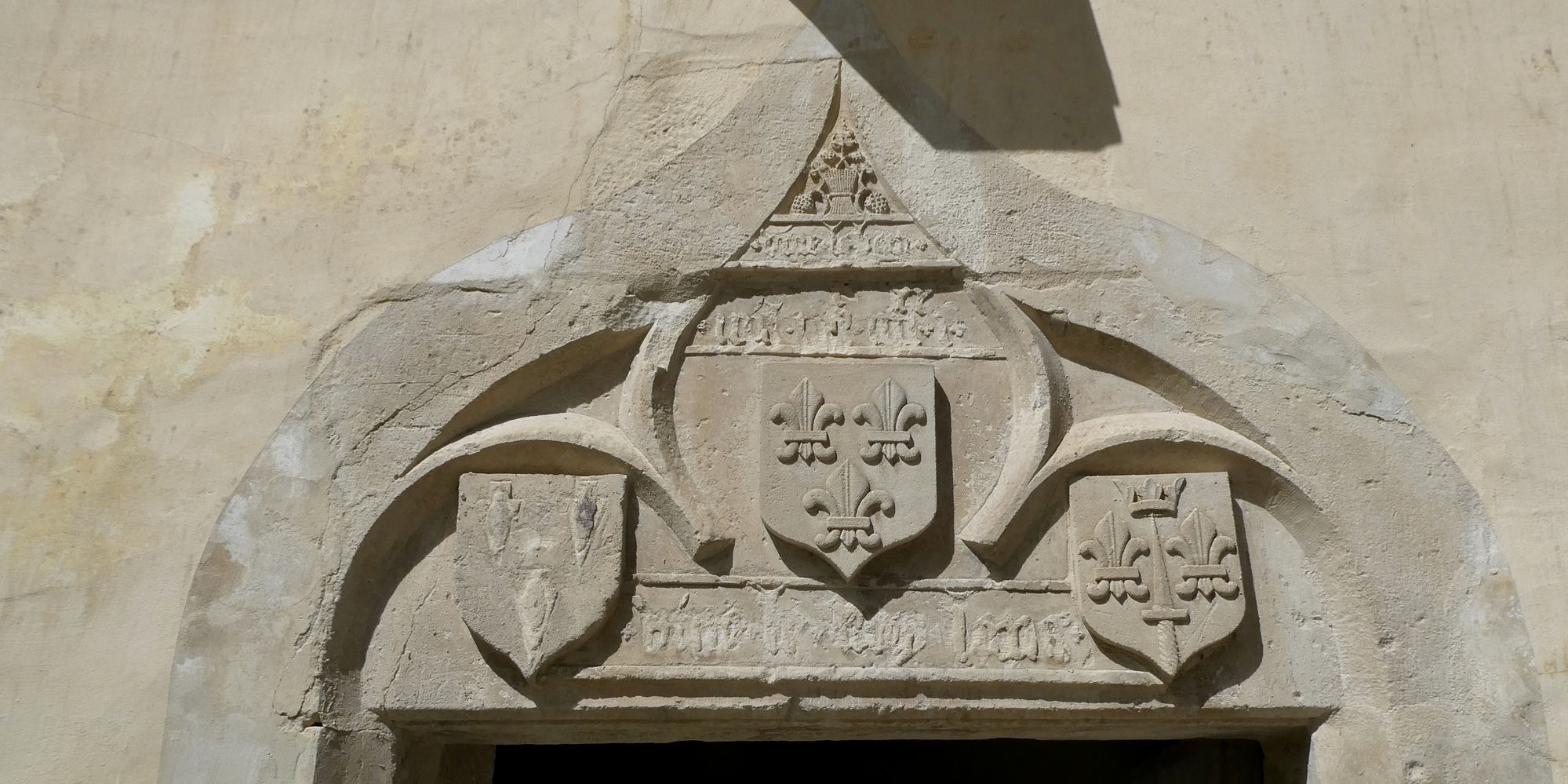 The lintel above the doorway of Joan's childhood home. On the3 right is Joan of Arc's Coat of Arms, granted to her by Charles VII: a hilted sword under a crown, flanked by two fleurs-de-lys
