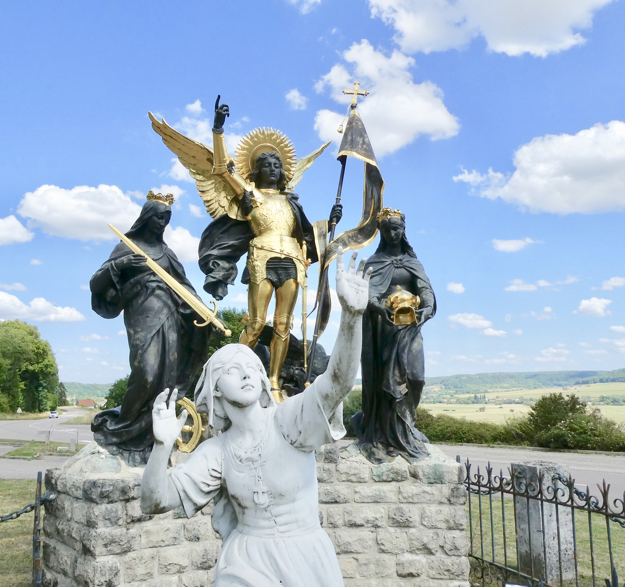 On the grounds of the Basilica of Bois Chenu is this statue commemorating Joan and her voices - the young kneeling Joan on first hearing the voices, and the soldier Joan flanked by the two angels Saint Margaret and Saint Catherine.