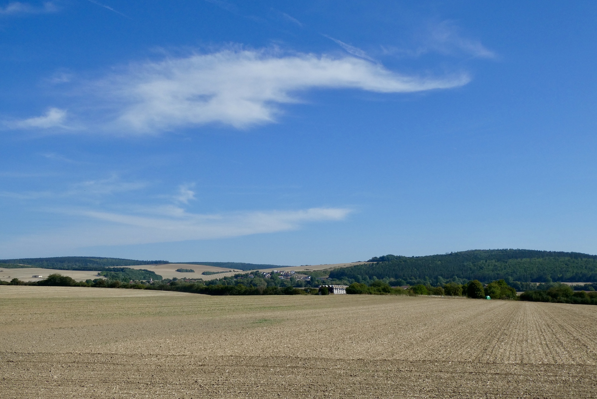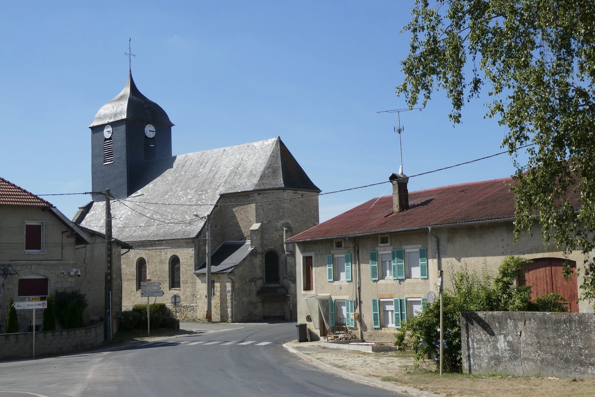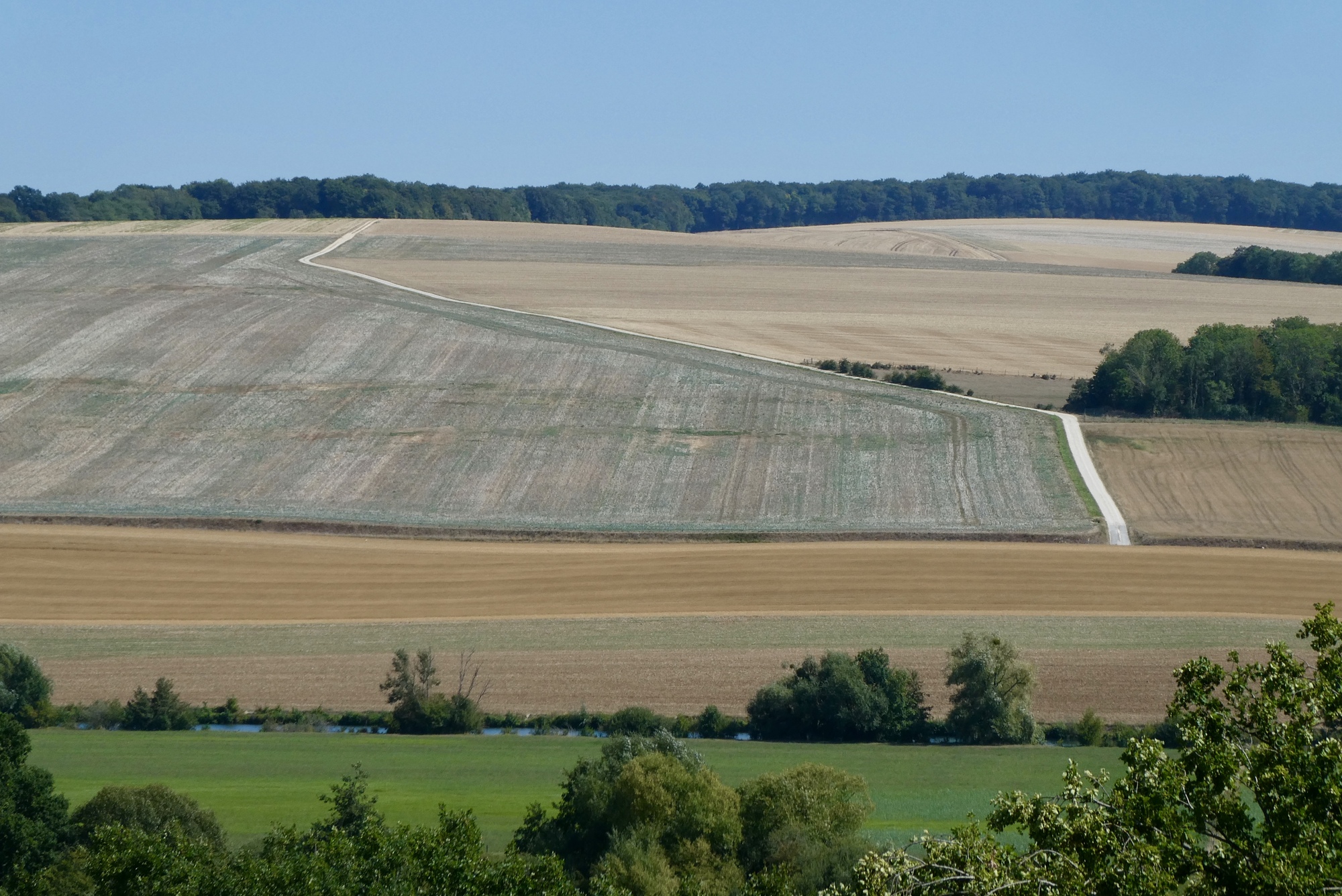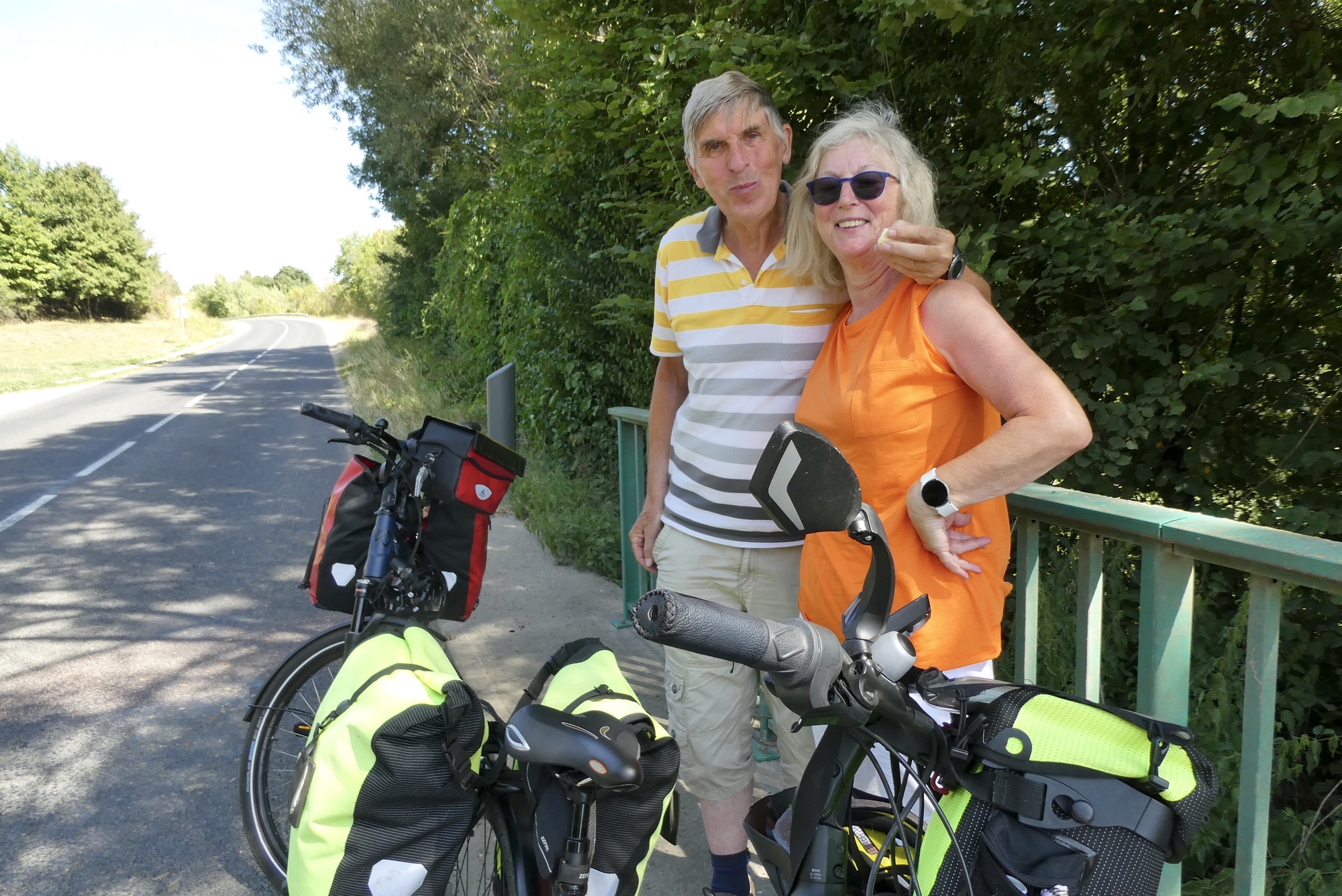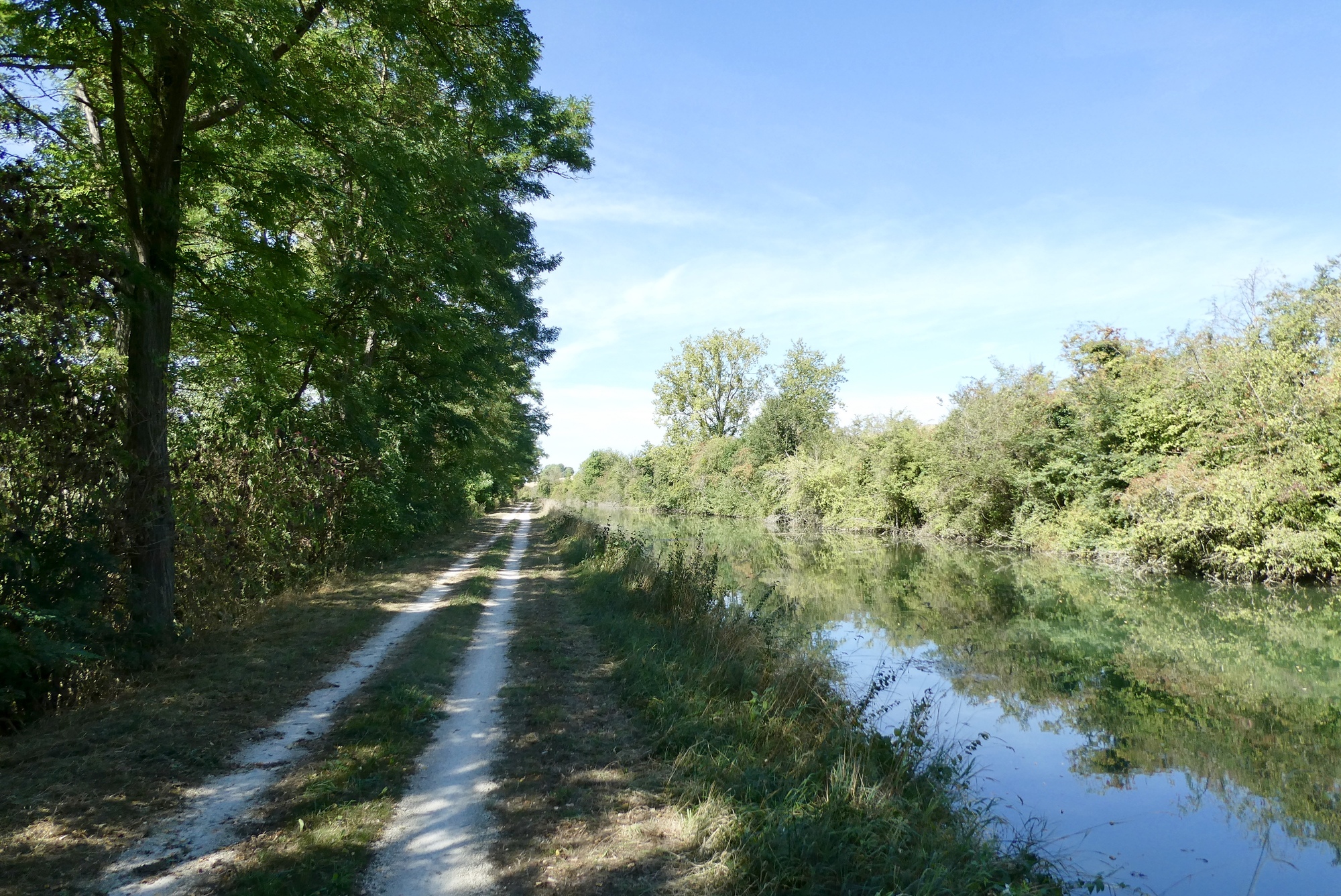 The sun bore down as I cycled through an open landscape devoid of trees. I noticed on RWGPS that there was a bike route right alongside the eastern bank of the river, running parallel to my route. Though it was marked unpaved, I thought it might provide some shade and a little relief from the rising temperature. Both routes intersected further north in Forges-sur-Meuse, so I turned around and headed back into Bras-sur-Meuse. I had trouble finding access to the bike path but after asking for directions from two local girls armed with baguettes and a small dog, I found myself on a shady double-track with a good surface – just what I was seeking. However, it was a bit monotonous and after five miles and I found a route back to the more interesting open roads.