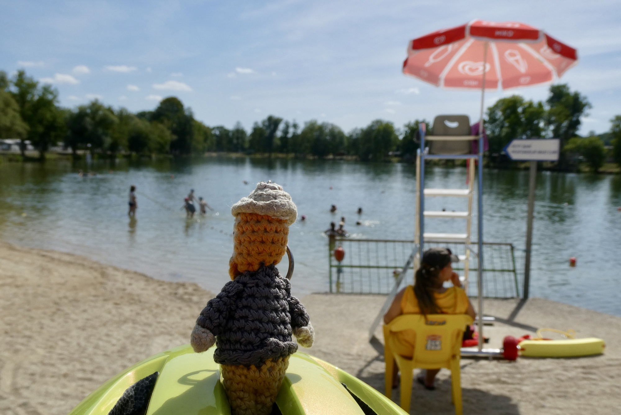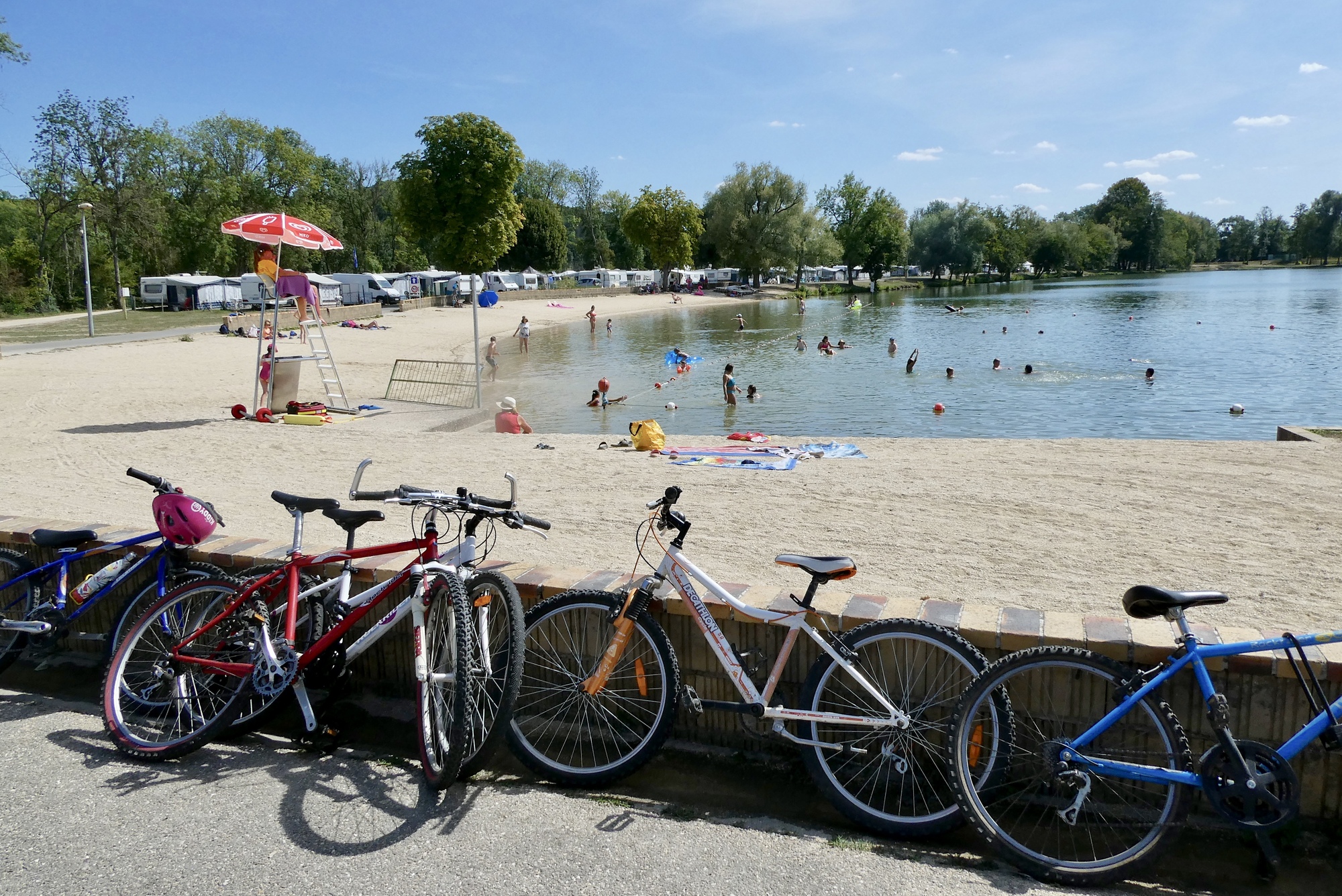 Though it was only eight miles to my lodging, temperatures were near 100°F and my water gauge was on empty. The only place I could find open was the Tourist Information, where the kind attendant graciously filled both water bottles. A took a few gulps and was headed back to my route when I saw a sign for a snack bar. I veered off to Lac Vert Plage, a lake and camping site complete with water slide. In a flash, I was at the snack bar enjoying a cold coke and French fries with my sandwich.