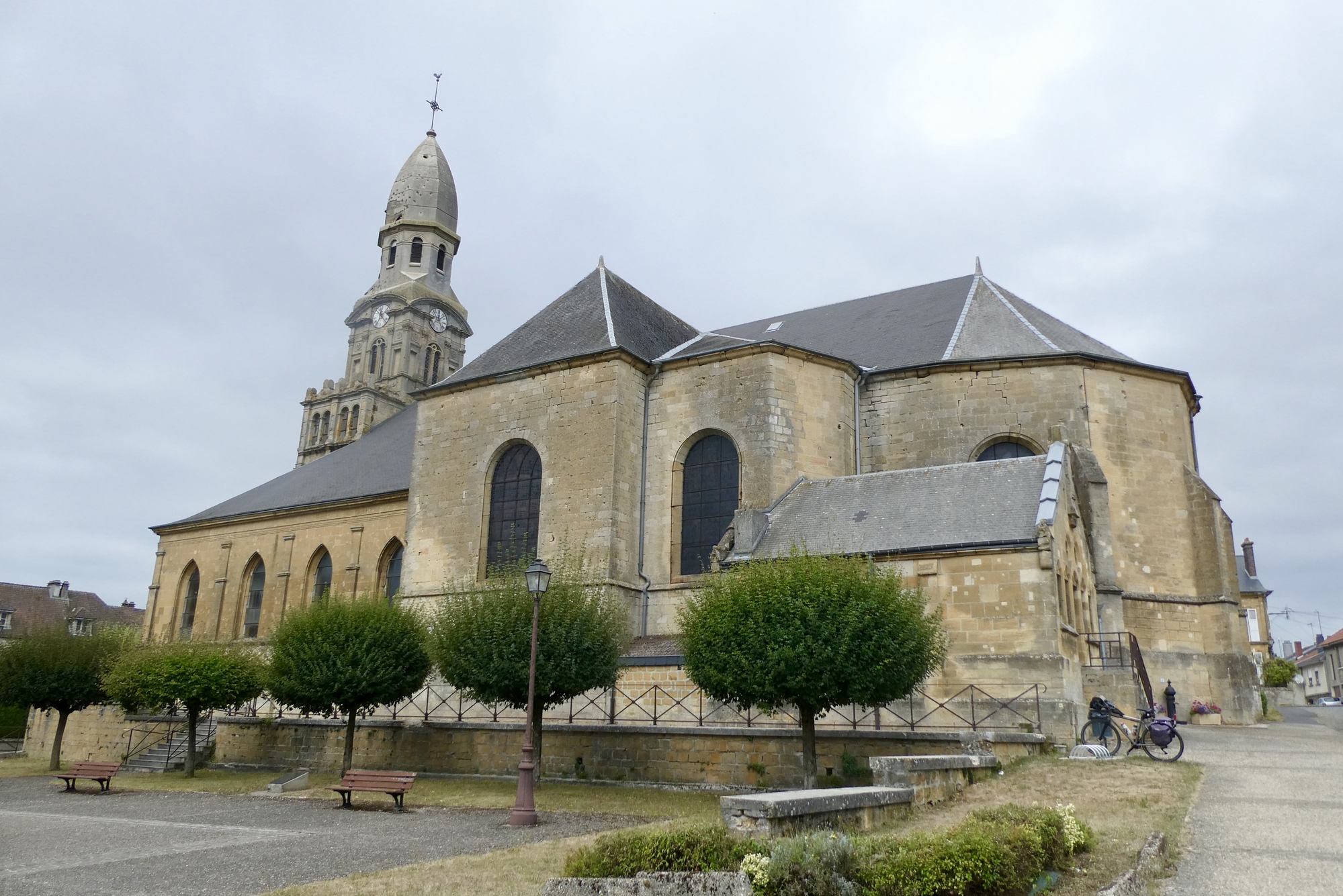 As I made my way up the narrower D30C, I was a bit surprised when I heard rumbling up ahead. No, not thunder, it was a very large tractor hauling a grain wagon. I soon realized that I was on a “grain road” during the height of the harvest – multiple tractors/trucks filled with mounds of grain passed me from both directions. Fortunately, they made enough of a roar to give me ample time to pull off to the side, and it was much easier for them to pass me than to pass each other. The road ended with a series of sharp turns at Beaumont-en-Argonne where I stopped to enjoy my pastry on the steps of Église Saint-Jean-Baptiste - a bit high after ten wonderful miles looping along the Meuse.