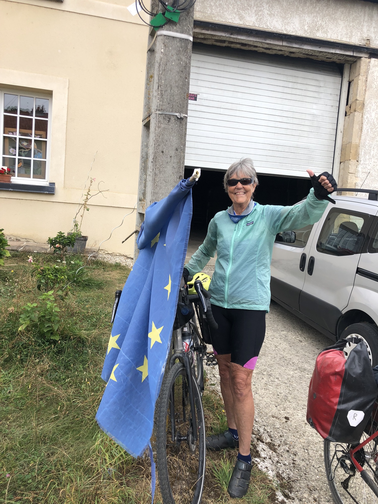 The weather forecast for today had both good and bad news. On the positive side – the heat had broken and temperatures would stay be in the high 70s. On the negative side were the predictions for rain, starting around ten and lasting most of the day. However, a closer look at the radar map suggested I might be able to avoid much of the rain if I headed north as soon as possible. So I tossed my plans for a leisurely morning spent journaling – I moved my raincoat to the top of the panniers and planned to head out with “the boys” around nine. After much picture taking and warm good-byes, we rolled out of Mouzay at a quarter past nine.