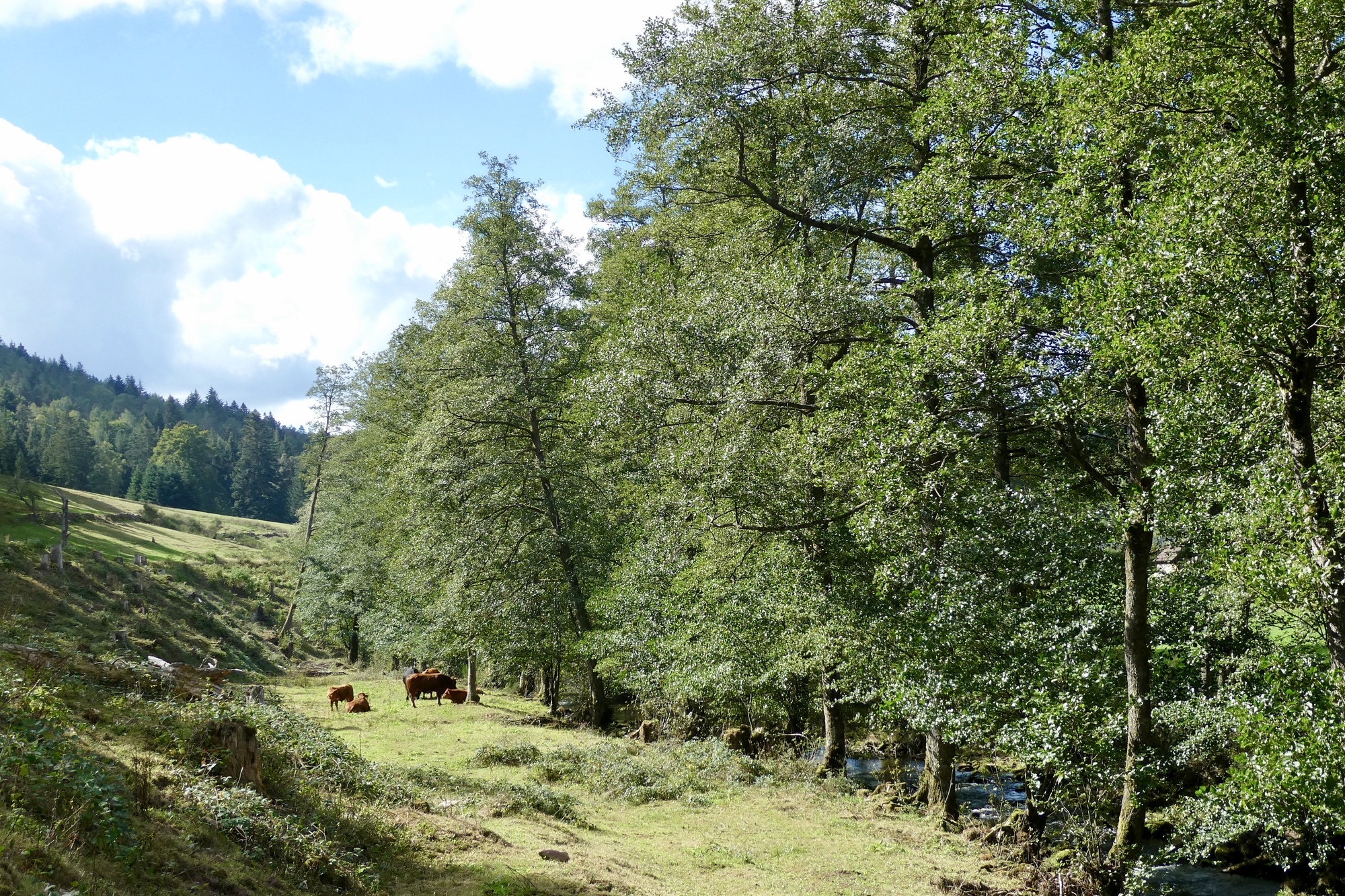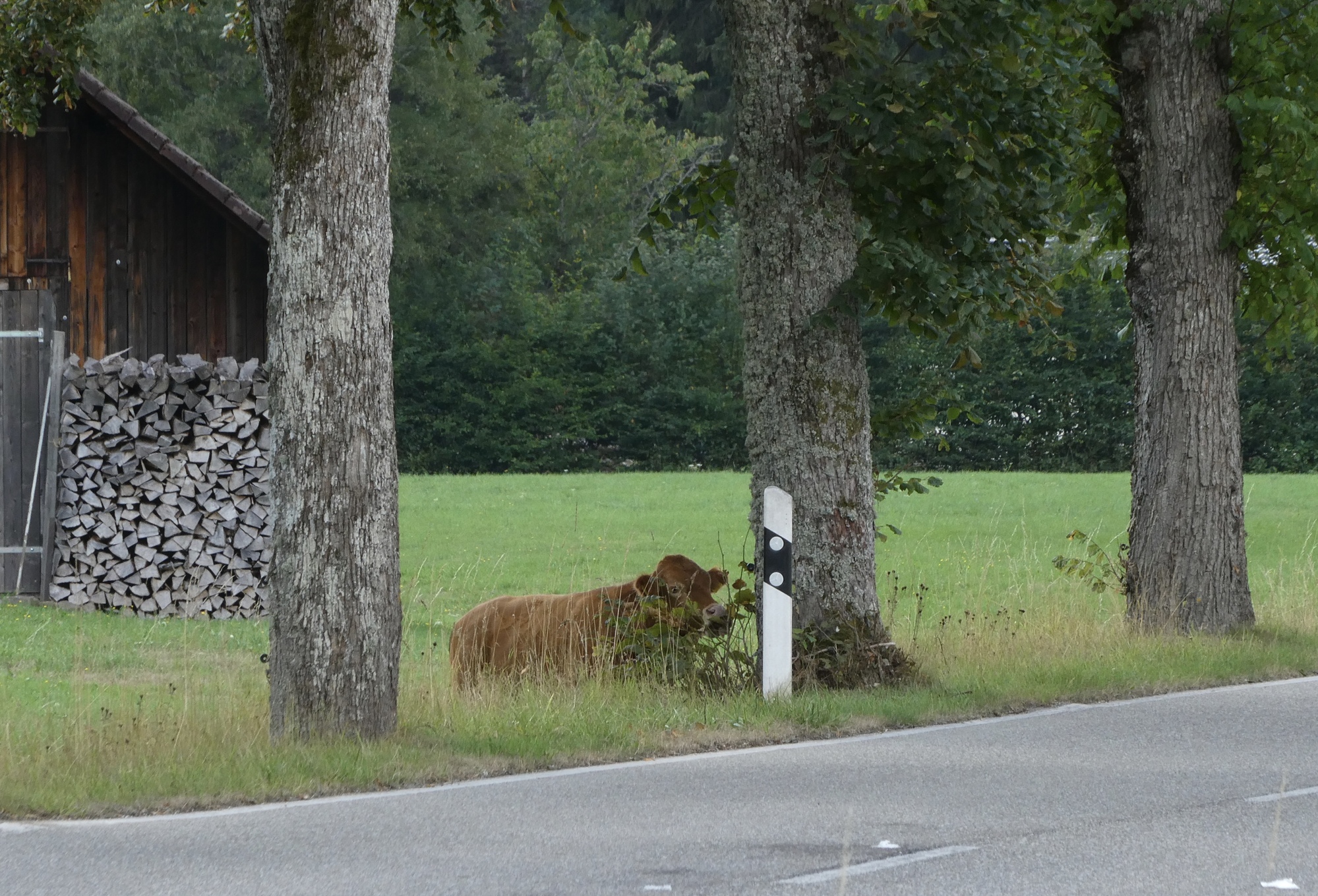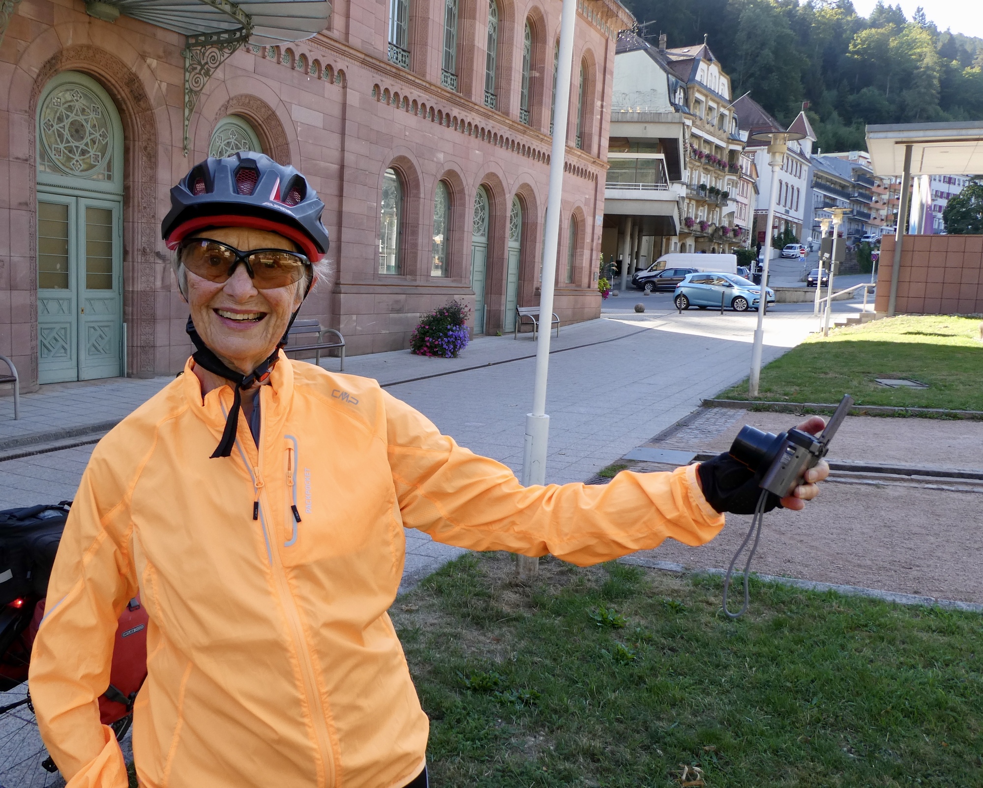 The day was short on miles but long on enjoyment. Before leaving town, we stopped to admire the Palais Thermal spa, whose thermal springs have soothed souls since the Middle Ages. Then we were on our way. We crossed the Enz River and followed the Große Enz south through the forest, stopping often for pictures. We took a longer break at roadside gas station/café/house in Enzklösterle and as I sipped my coffee I noticed a cow wandering down the road. The proprietor of the gas station, who also owned the cow, came running out and chased her back into the pasture, lamenting the fact that she was always escaping and wandering about the highway. And sure enough, we spotted “Elsie the Escapee” lurking along the roadside as we headed down the highway.