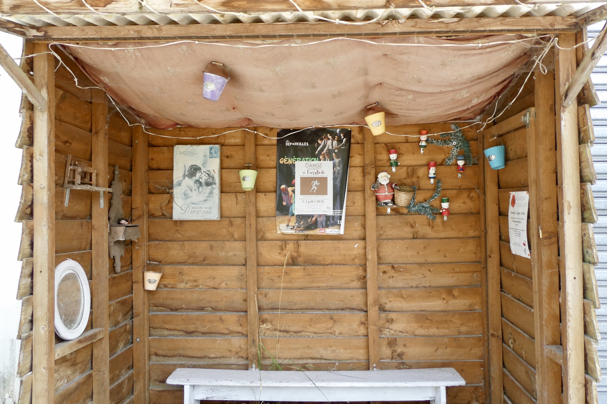 Among the items adorning the Les Moulins bus stop were: Santa and sundry holiday items; a variety of coffee cups; an enlarged postcard depicting two women embracing and captioned Joyeux Nöel and Follow Your Dreams; a number of wooden tchotchkes, including small carved animals; a mirror; and playbills for local events - though none mentioned a pink tent